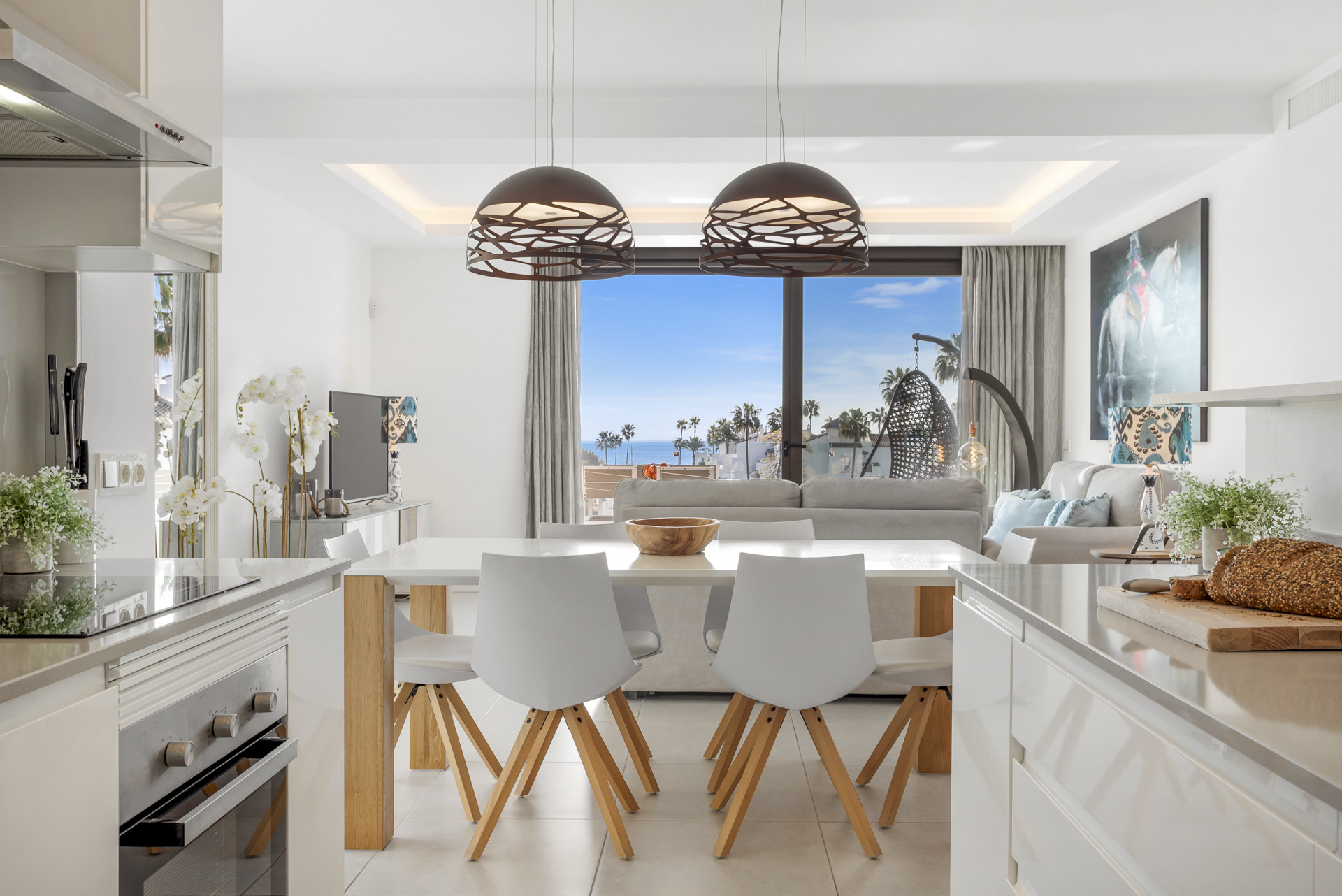 Treten Sie ein und lassen Sie sich von den geräumigen Innenräumen, die durch die großen Fenster von Boden bis zur Decke überflutet werden, faszinieren. Der offene Wohnbereich, die Küche und der Essbereich verschmelzen nahtlos miteinander und schaffen eine einladende Atmosphäre zum Entspannen und Unterhalten.