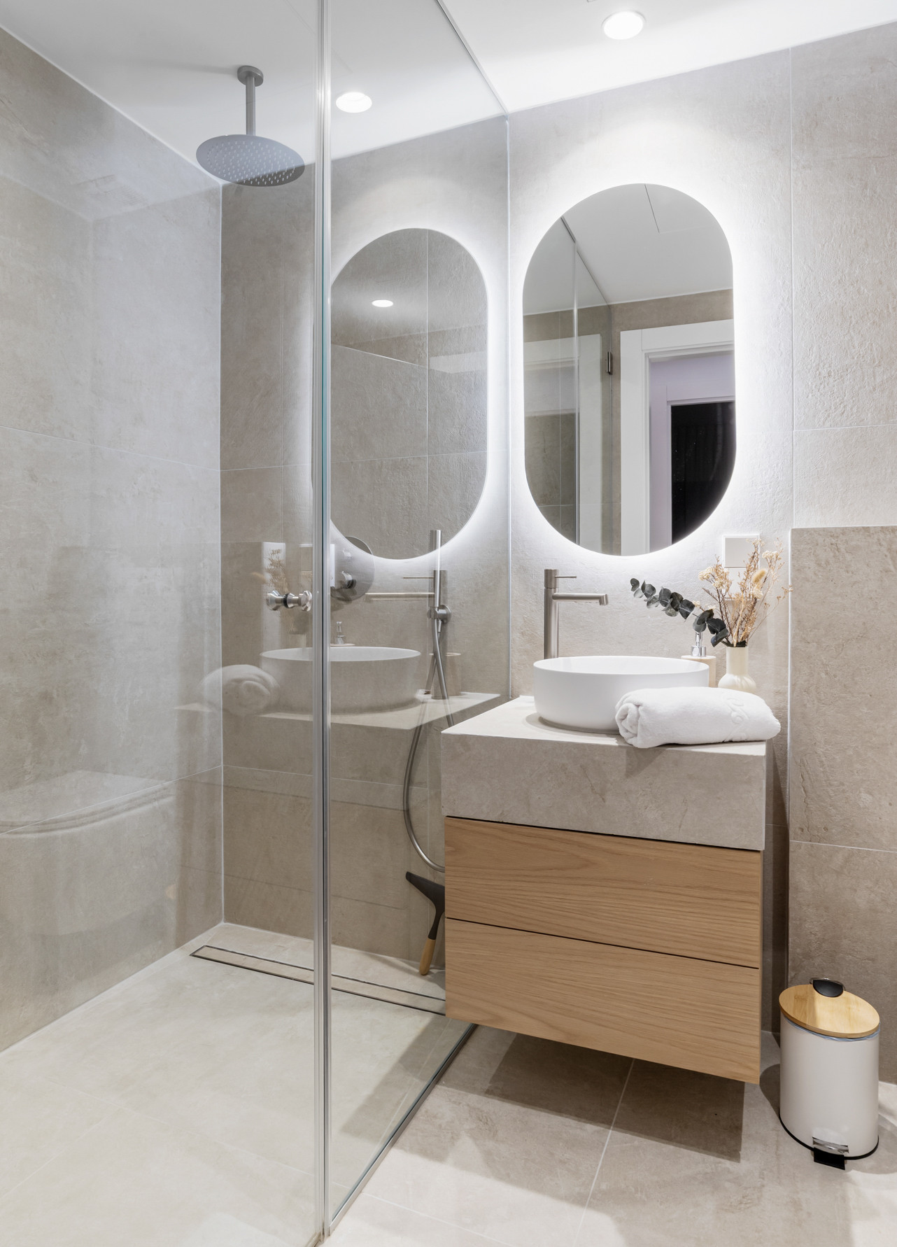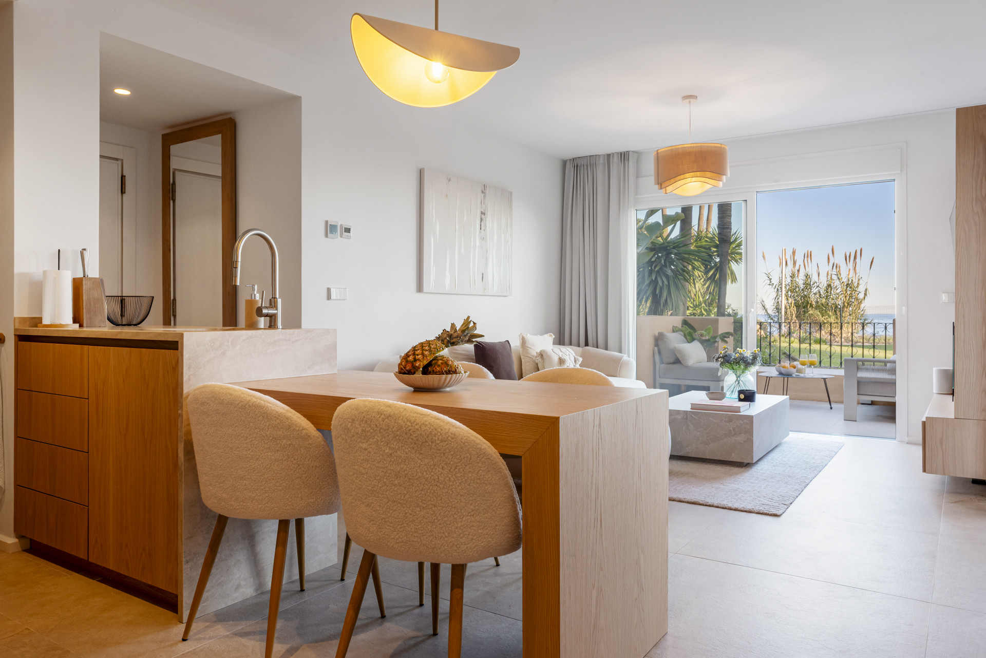 Auf 114 m² ist die Wohnung für müheloses Eleganz konzipiert. Der offene Wohnbereich verfügt über maßgefertigte Schreinerei, eine schlichte, vollausgestattete Küche und einen elektrischen Kamin, der eine warme und einladende Atmosphäre schafft. Ein zusätzlicher Bioethanol-Kamin auf der Terrasse ermöglicht es Ihnen, die Meeresbrise in gemütlicher Geborgenheit zu genießen, unabhängig von der Jahreszeit. Bodentiefe Glastüren rahmen die atemberaubenden Panoramaausblicke und verbinden das Innen- und Außenleben nahtlos.