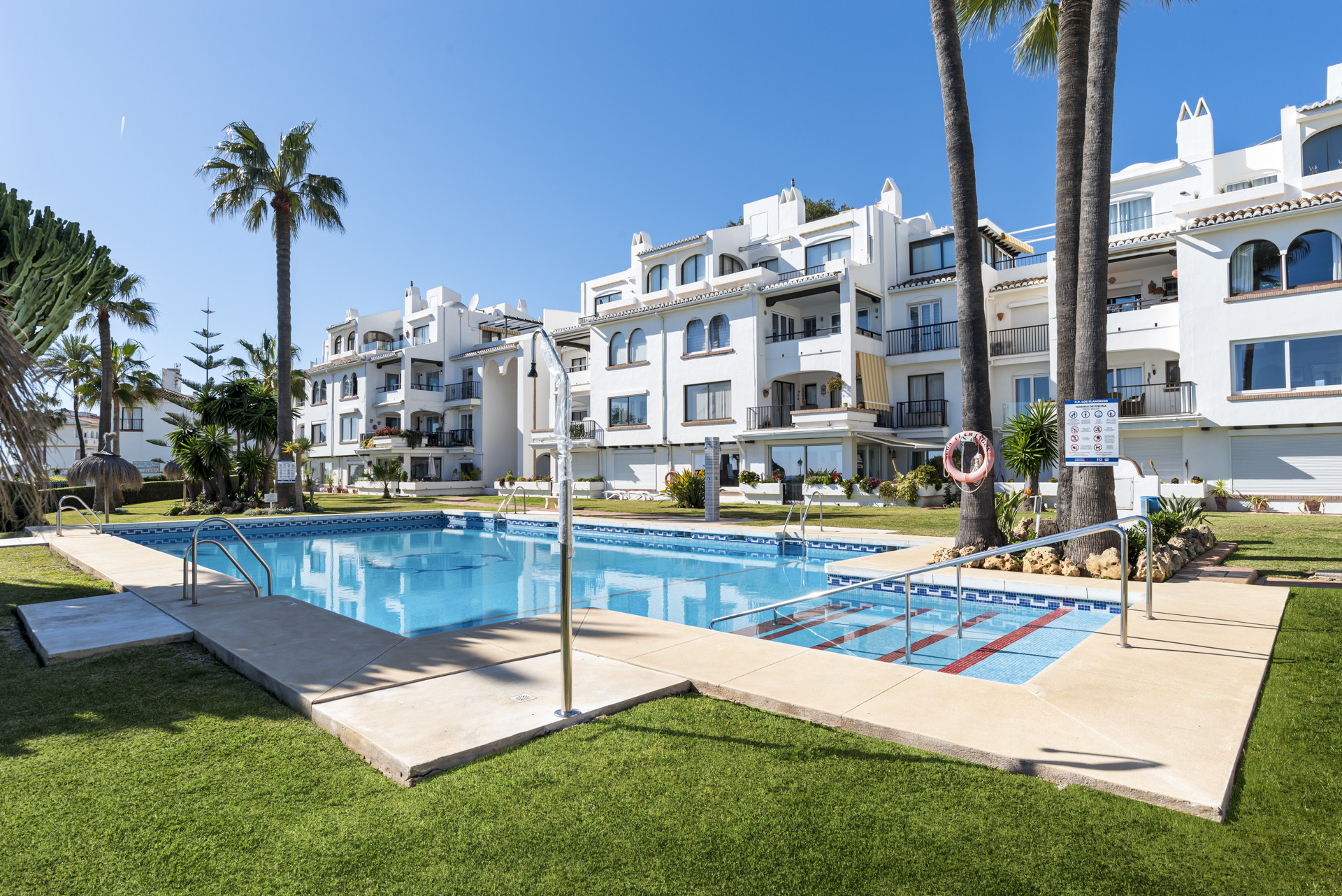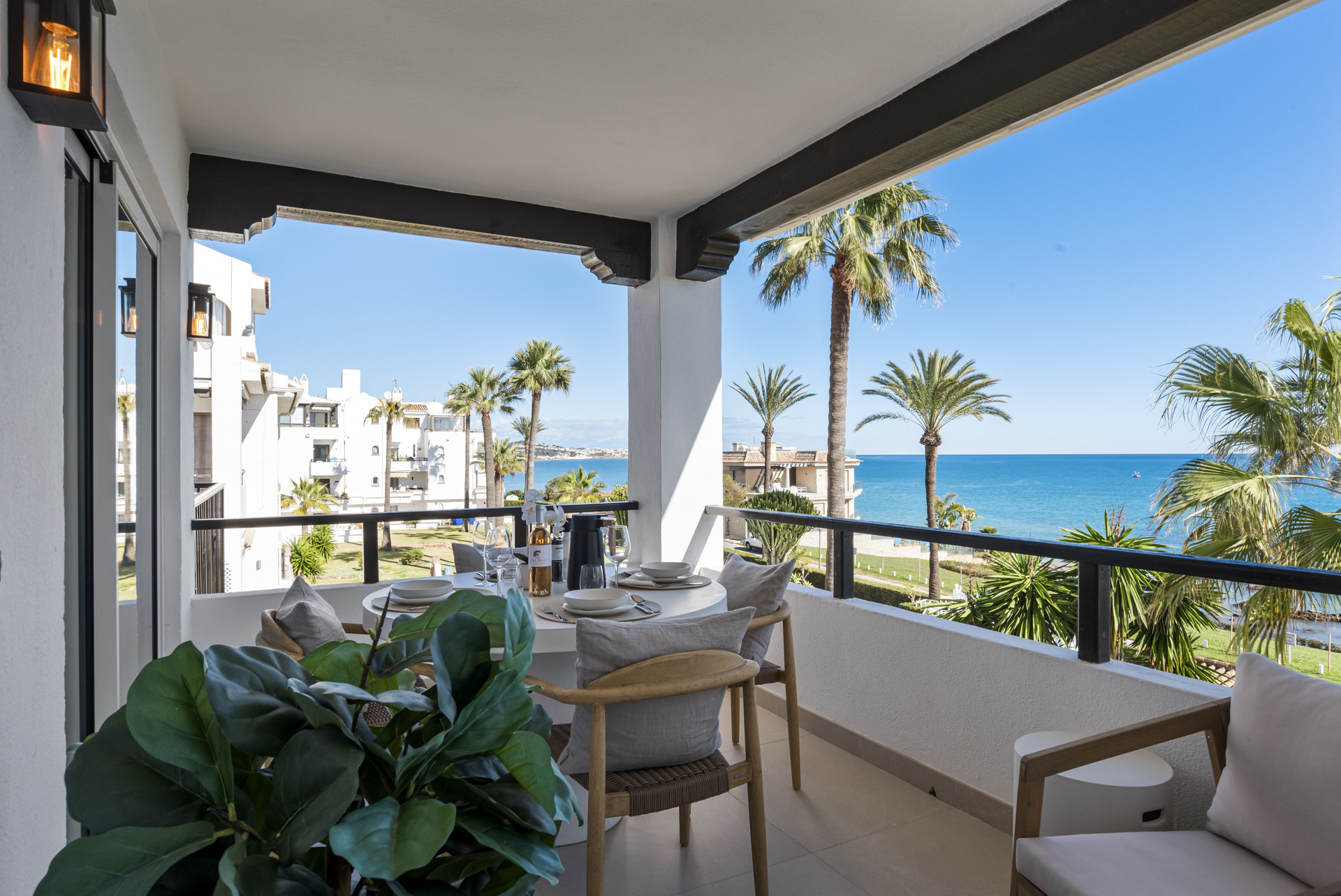 Die Wohnung verfügt über zwei Schlafzimmer, beide mit atemberaubenden Meerblicken. Das Hauptschlafzimmer beinhaltet ein eigenes Badezimmer und bietet direkten Zugang zur privaten Terrasse, wo Gäste zum Anblick und Geräusch der Wellen aufwachen können. Das zweite Schlafzimmer verfügt über ein separates modernes Badezimmer, das Komfort und Privatsphäre für alle Gäste sicherstellt. Der offene Wohnbereich ist von natürlichem Licht durchflutet und führt zu einer geräumigen Terrasse mit eigenem Essbereich, perfekt zum Genießen von Mahlzeiten vor der atemberaubenden Kulisse des Meeres und des Gemeinschaftspools. Eine voll ausgestattete Küche und ein separater Waschraum mit Waschmaschine und Trockner bieten alle Annehmlichkeiten eines Zuhauses. Parkplätze sind innerhalb der Anlage verfügbar und bieten einen überdachten, aber eingezäunten Raum für Bewohner und Gäste.
