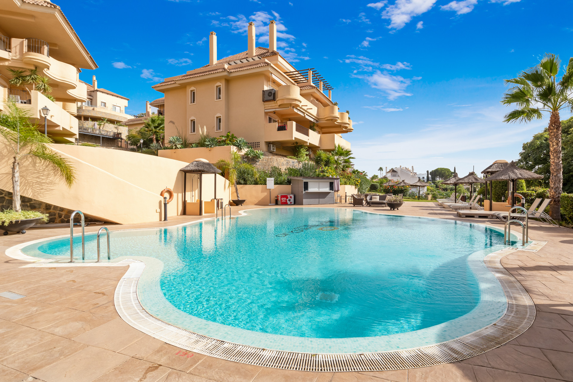 Willkommen in Ihrem Ferienparadies! Diese helle und geräumige Wohnung, gelegen in einer preisgekrönten Anlage mit luxuriösen Einrichtungen, ist Ihr perfekter Rückzugsort. Sie ist hell, modern und sorgfältig gestaltet, mit einer großen nach Süden ausgerichteten Terrasse mit Blick auf den Pool.