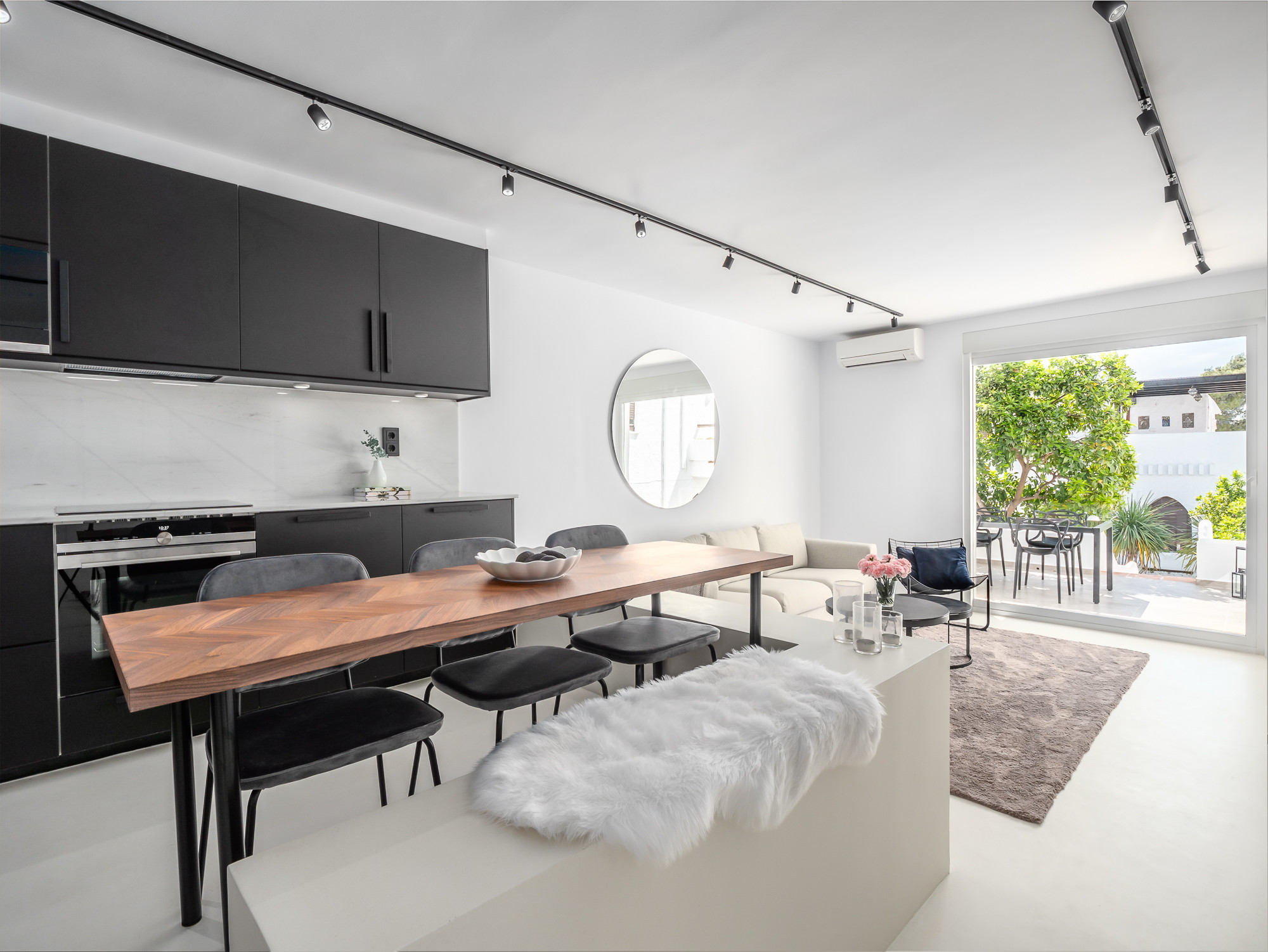 Willkommen in Casa Cielo! Casa Cielo ist eine wunderschön präsentierte 2-Zimmer-1-Bad-Wohnung in Aldea Blanca und bietet modernen Komfort in einer der begehrtesten Wohnanlangen in Nueva Andalucía. Die Wohnung verfügt über einen hellen, offenen Grundriss, in dem sich Wohn-, Ess- und Küchenbereiche nahtlos ineinander fügen und eine geräumige und gesellige Umgebung voller natürlichen Lichts schaffen. Große Schiebetüren aus Glas verbinden den Innenbereich direkt mit der Terrasse und verstärken das luftige Gefühl im gesamten Raum. Eines der Schlafzimmer fügt sich mühelos in den Wohnbereich ein und schafft einen flexiblen Raum, der als zusätzlicher Loungebereich oder Gästezimmer dienen kann und dabei die offene, zeitgenössische Ästhetik der Wohnung beibehält. Warme Holzböden und neutrale Töne verleihen dem Zuhause eine ruhige, moderne Atmosphäre.