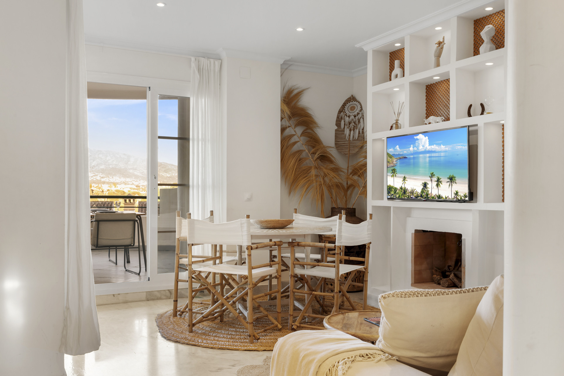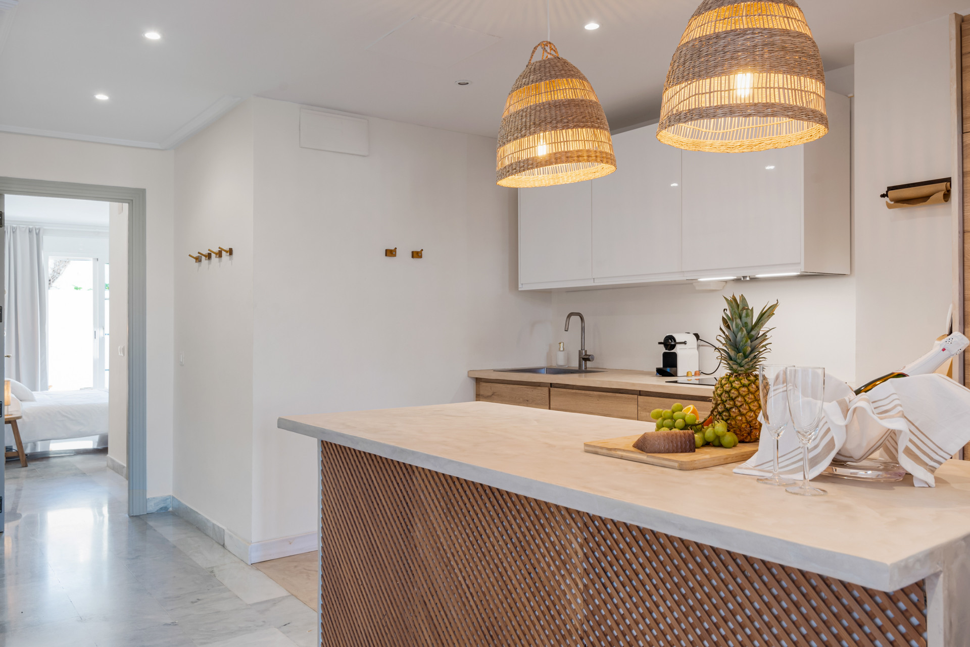 Willkommen in Casa Cielo! Casa Cielo ist eine wunderschön präsentierte 2-Zimmer-1-Bad-Wohnung in Aldea Blanca und bietet modernen Komfort in einer der begehrtesten Wohnanlangen in Nueva Andalucía. Die Wohnung verfügt über einen hellen, offenen Grundriss, in dem sich Wohn-, Ess- und Küchenbereiche nahtlos ineinander fügen und eine geräumige und gesellige Umgebung voller natürlichen Lichts schaffen. Große Schiebetüren aus Glas verbinden den Innenbereich direkt mit der Terrasse und verstärken das luftige Gefühl im gesamten Raum. Eines der Schlafzimmer fügt sich mühelos in den Wohnbereich ein und schafft einen flexiblen Raum, der als zusätzlicher Loungebereich oder Gästezimmer dienen kann und dabei die offene, zeitgenössische Ästhetik der Wohnung beibehält. Warme Holzböden und neutrale Töne verleihen dem Zuhause eine ruhige, moderne Atmosphäre.