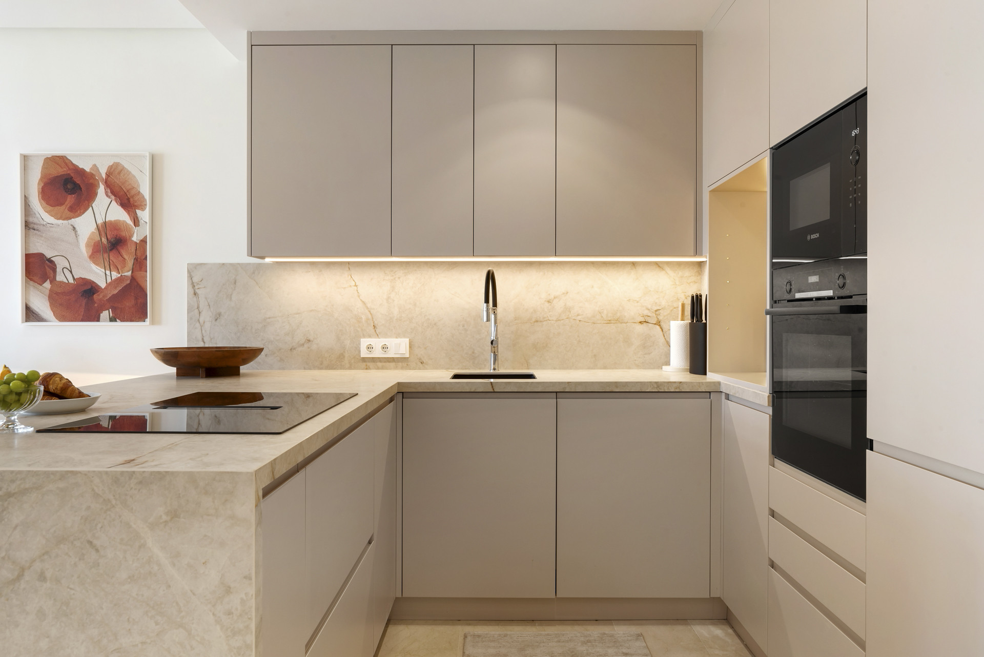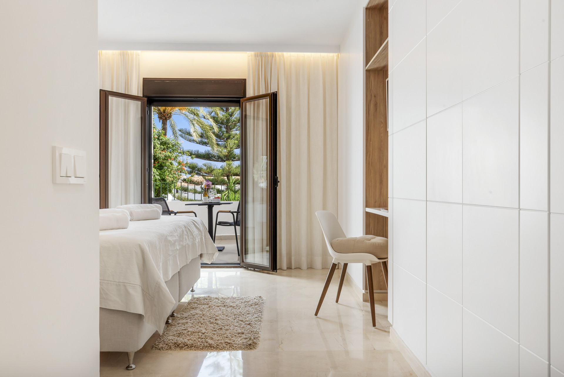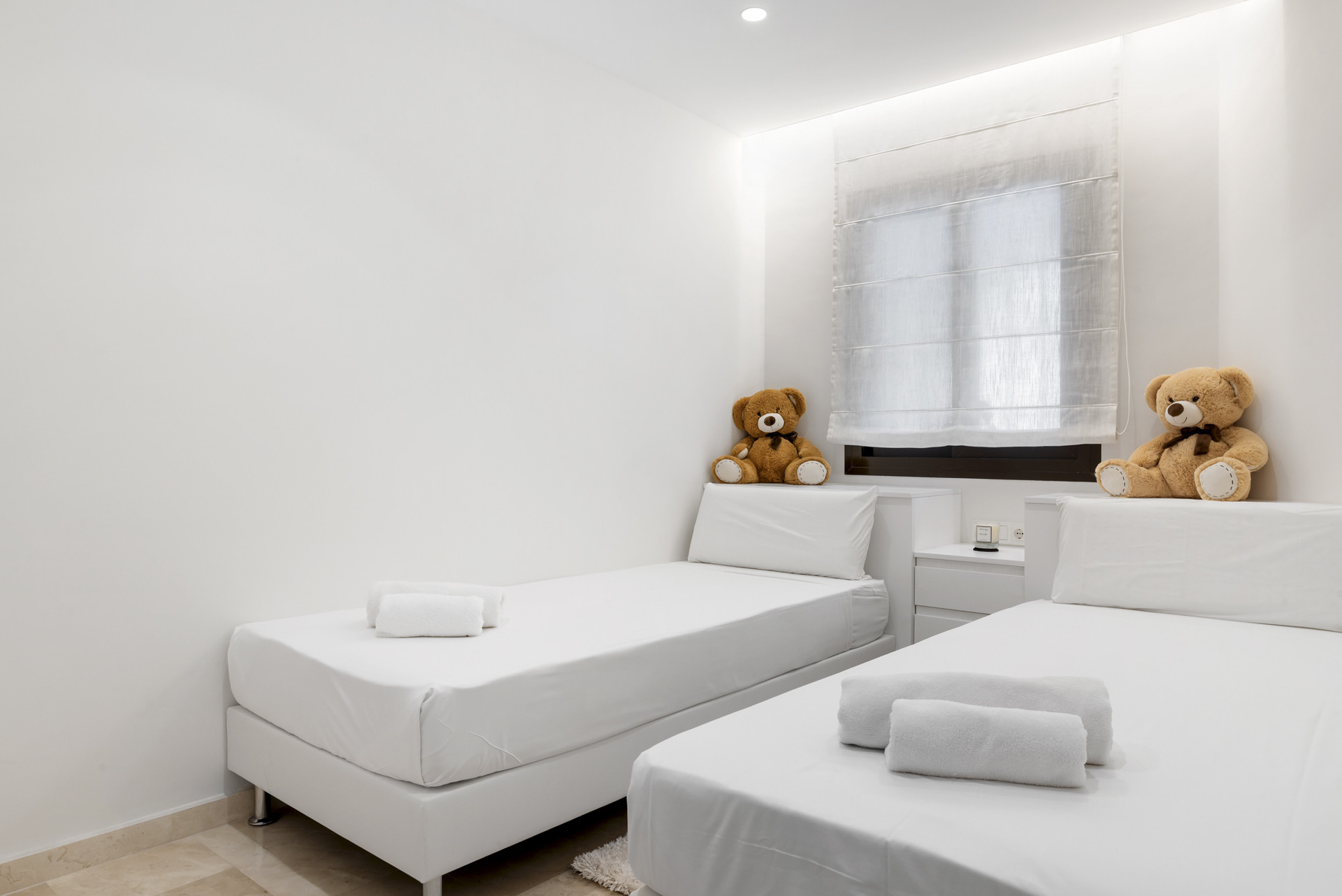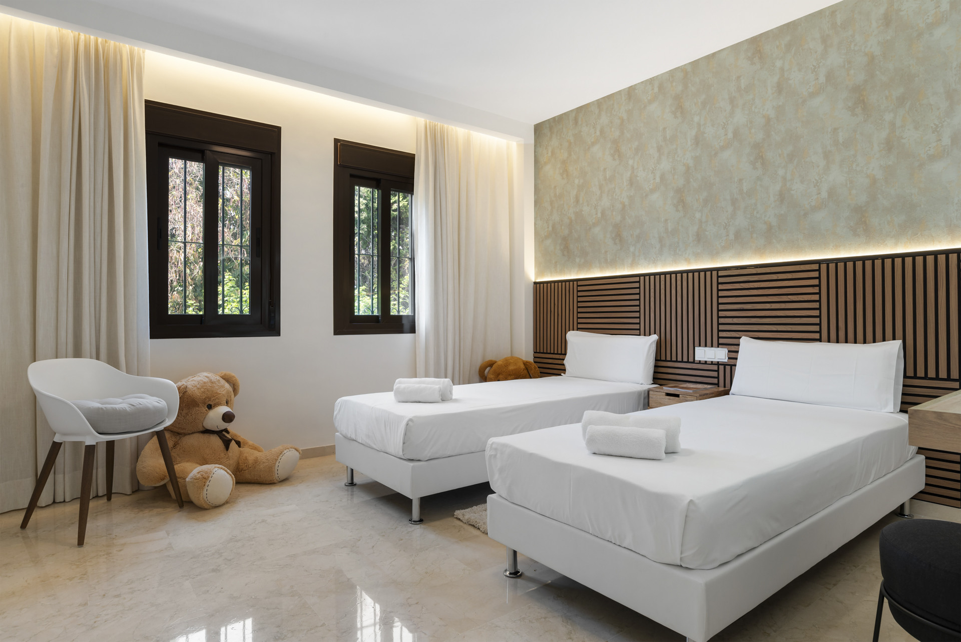 Die Küche ist schlicht und vollständig ausgestattet und verfügt über hochwertige Bosch-Geräte, integrierte Einbauschränke und einen auffälligen Marmor-Spritzschutz. Eine großzügige zentrale Insel bietet sowohl Arbeitsplatz als auch ein Element für zwangloses Dining. Das Hauptschlafzimmer verfügt über ein Doppelbett, ein eigenes Badezimmer, Terrassenzugang und maßgefertigte eingebaute Kleiderschränke mit einer natürlichen Holz- und weißen Ausführung, die einen ruhigen Rückzugsort schaffen. Die beiden zusätzlichen Schlafzimmer sind jeweils mit zwei Einzelbetten ausgestattet – perfekt für Kinder, Gäste oder Freunde, die sich ein Zimmer teilen – und mit einer Mischung aus weichen, verspielten und raffinierten Elementen gestaltet.