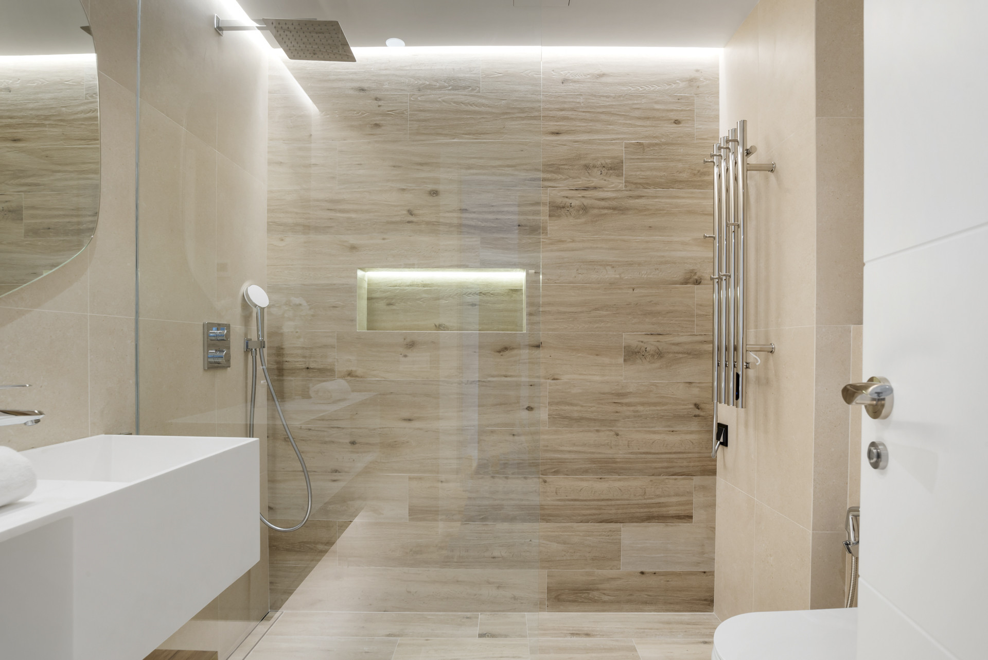 Beide Badezimmer sind wunderschön gestaltet, mit begehbaren Duschen, großformatigen Fliesen, Ambientebeleuchtung und zeitgenössischen Armaturen – und verbinden Spa-ähnlichen Komfort mit visueller Attraktivität.