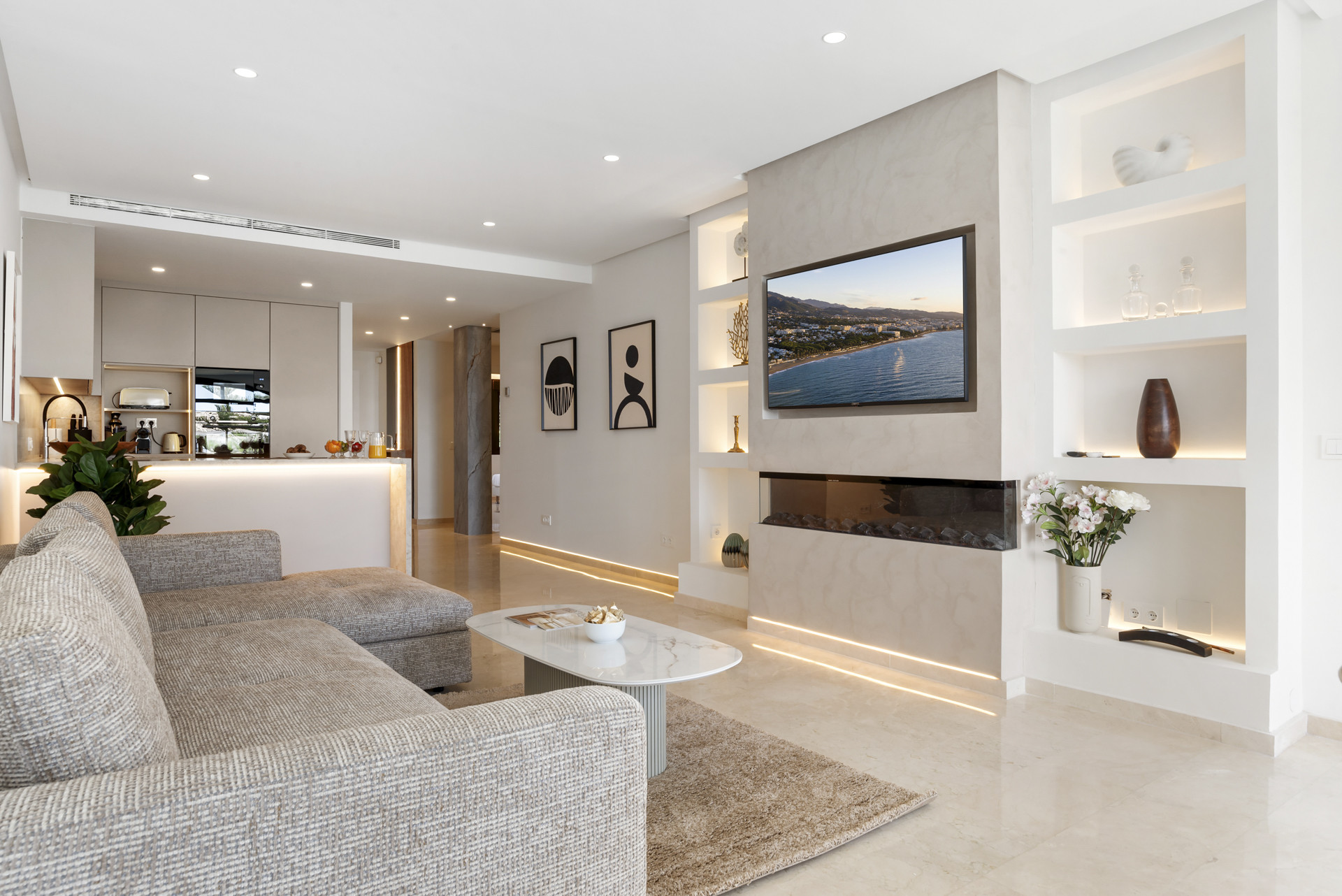 Das Innendesign ist warm, frisch und durchdacht – mit neutralen Tönen, gerillten Holzpaneelakzenten, weichem indirektem Licht und modernen Einrichtungsgegenständen im gesamten Raum. Der offene Wohn- und Essbereich ist von natürlichem Licht durch bodentiefe Fenster durchflutet und öffnet sich zu einer privaten Terrasse mit schönem Garten, Pool und teilweisem Meerblick. Es ist ein idealer Ort für den Morgenkaffee oder Abendgetränke mit Aussicht.