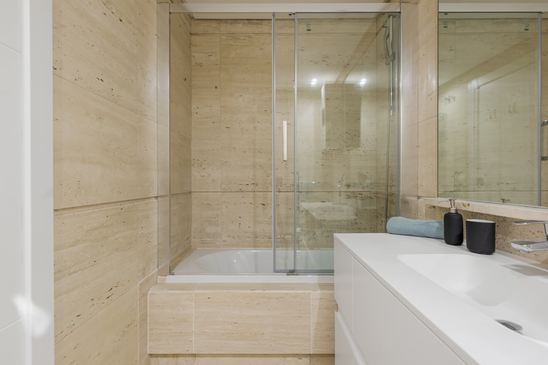 Das Apartment verfügt über 2 Schlafzimmer und 2 Badezimmer. Das Hauptschlafzimmer führt auf den Balkon und ermöglicht es Ihnen praktisch, mit Blick auf das Mittelmeer aufzuwachen. Das zweite Schlafzimmer ist eher für Kinder konzipiert und verfügt über ein Etagenbett mit einem ausziehbaren Bett und ein zusätzliches Einzelbett.