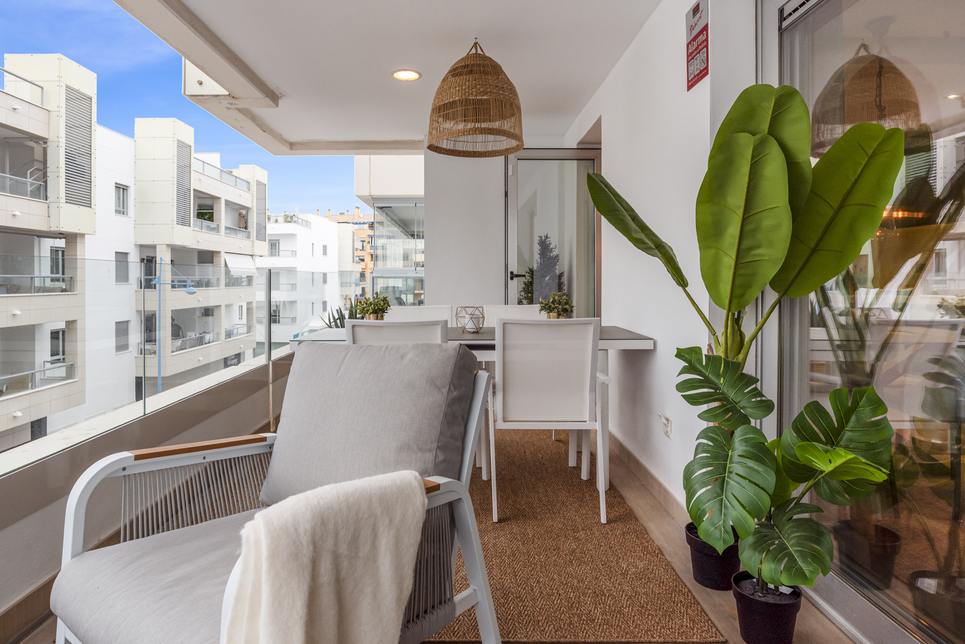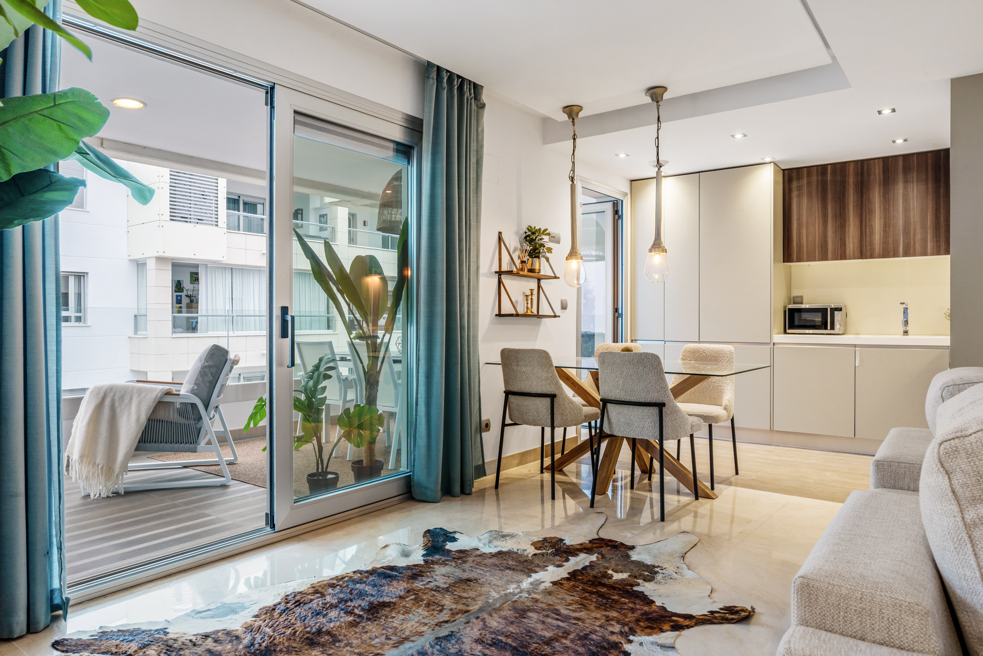 Willkommen in Casa Cielo! Casa Cielo ist eine wunderschön präsentierte 2-Zimmer-1-Bad-Wohnung in Aldea Blanca und bietet modernen Komfort in einer der begehrtesten Wohnanlangen in Nueva Andalucía. Die Wohnung verfügt über einen hellen, offenen Grundriss, in dem sich Wohn-, Ess- und Küchenbereiche nahtlos ineinander fügen und eine geräumige und gesellige Umgebung voller natürlichen Lichts schaffen. Große Schiebetüren aus Glas verbinden den Innenbereich direkt mit der Terrasse und verstärken das luftige Gefühl im gesamten Raum. Eines der Schlafzimmer fügt sich mühelos in den Wohnbereich ein und schafft einen flexiblen Raum, der als zusätzlicher Loungebereich oder Gästezimmer dienen kann und dabei die offene, zeitgenössische Ästhetik der Wohnung beibehält. Warme Holzböden und neutrale Töne verleihen dem Zuhause eine ruhige, moderne Atmosphäre.