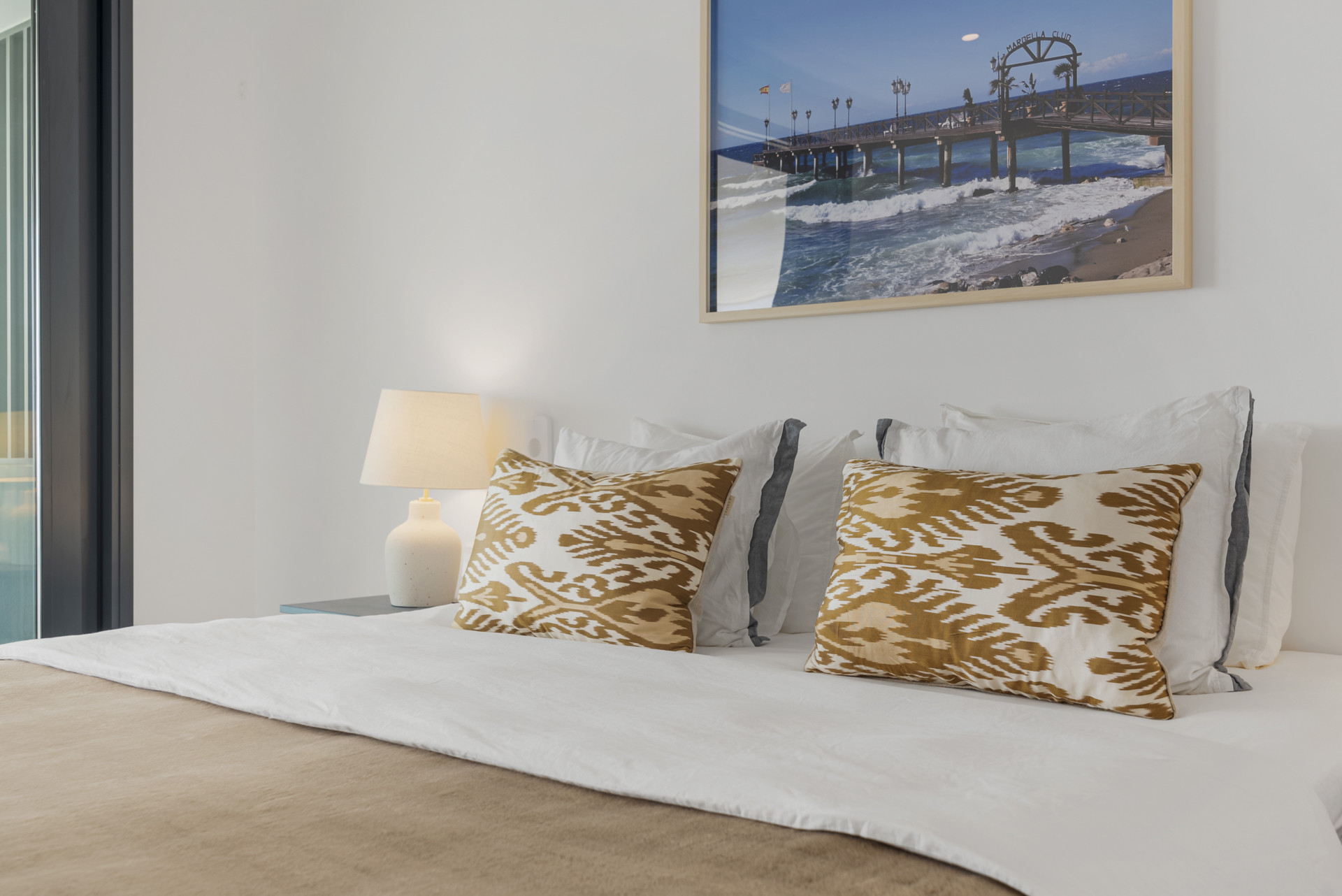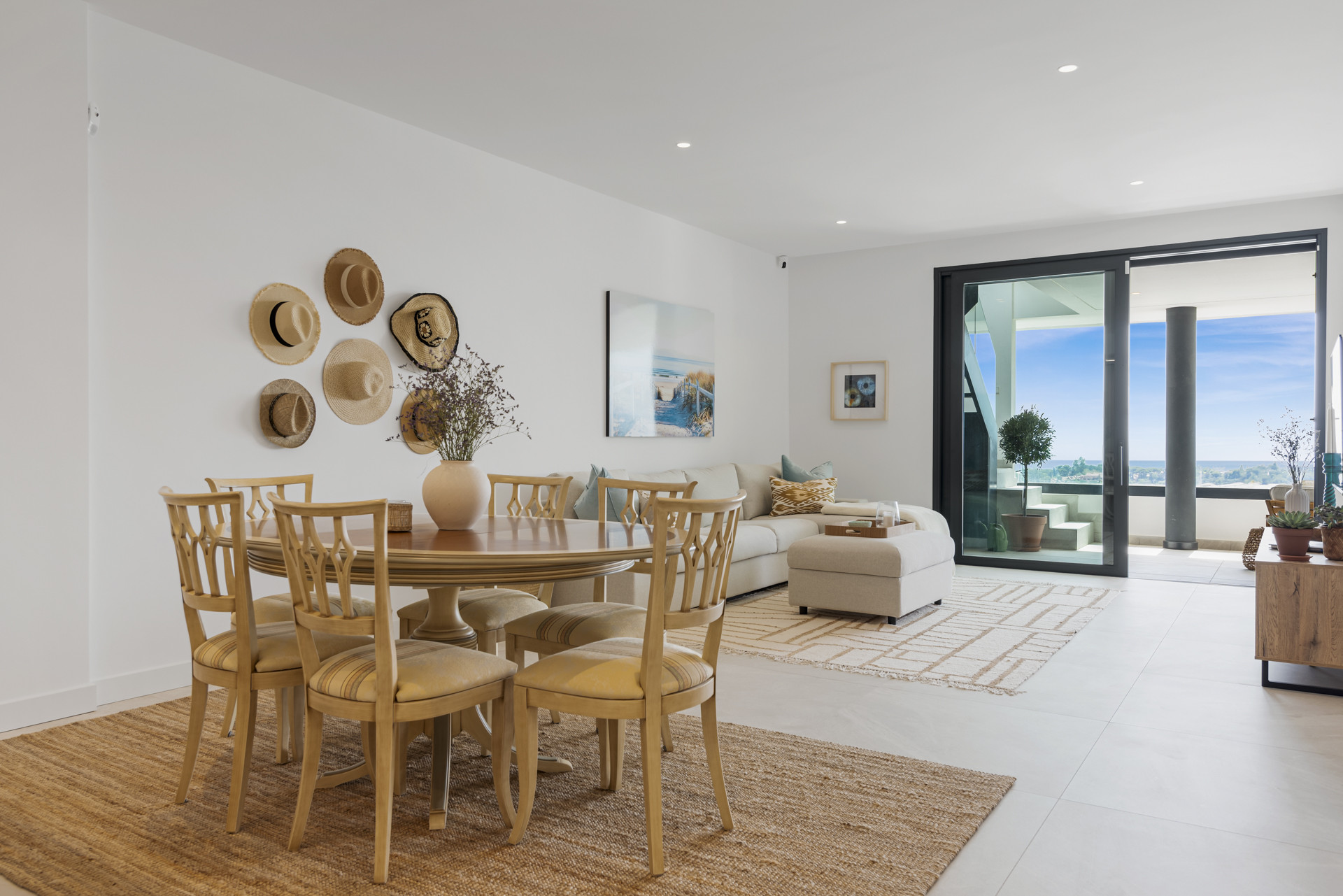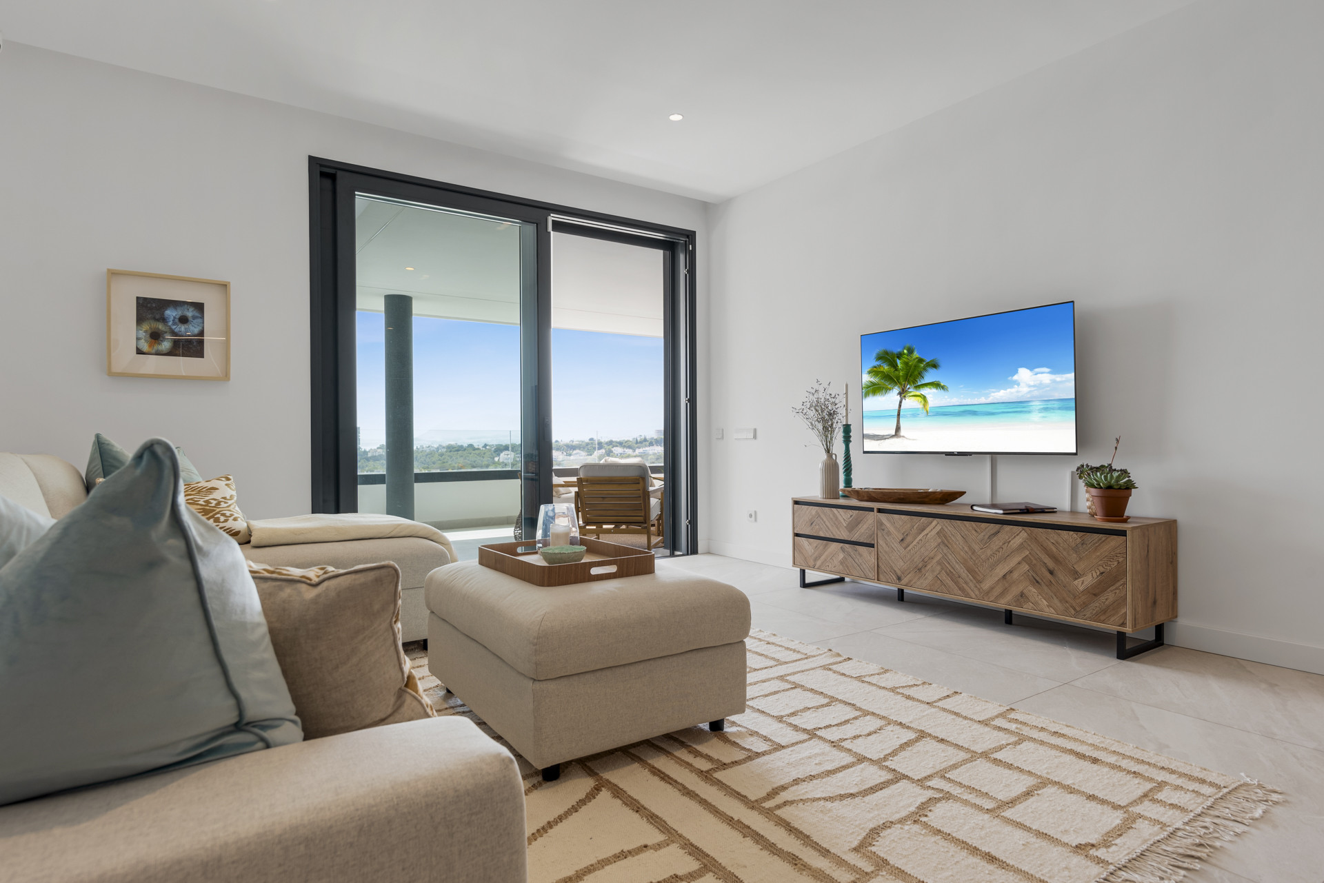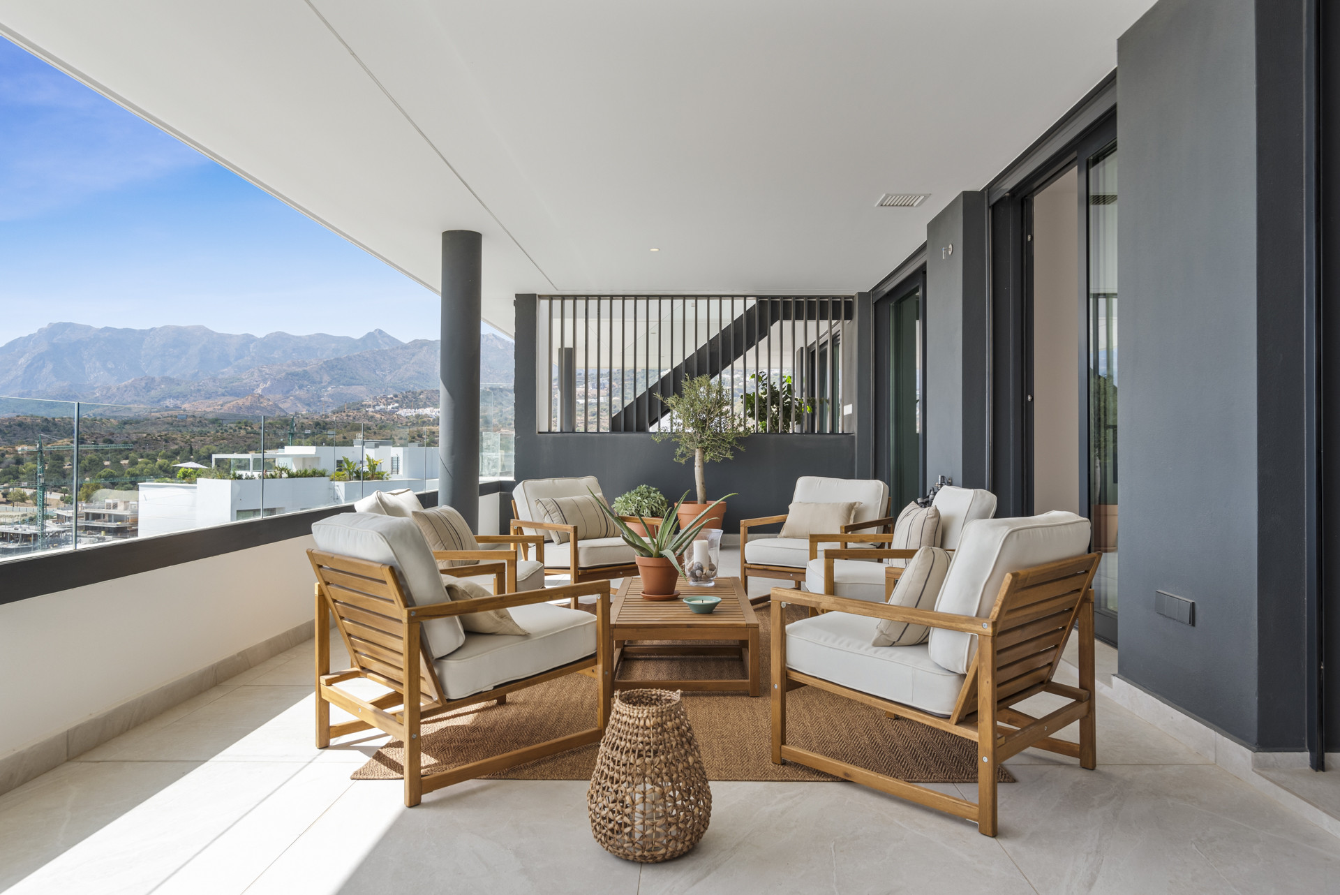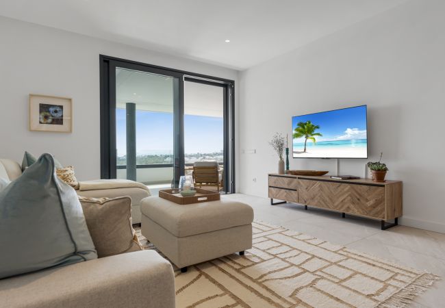 Willkommen in Casa Cielo! Casa Cielo ist eine wunderschön präsentierte 2-Zimmer-1-Bad-Wohnung in Aldea Blanca und bietet modernen Komfort in einer der begehrtesten Wohnanlangen in Nueva Andalucía. Die Wohnung verfügt über einen hellen, offenen Grundriss, in dem sich Wohn-, Ess- und Küchenbereiche nahtlos ineinander fügen und eine geräumige und gesellige Umgebung voller natürlichen Lichts schaffen. Große Schiebetüren aus Glas verbinden den Innenbereich direkt mit der Terrasse und verstärken das luftige Gefühl im gesamten Raum. Eines der Schlafzimmer fügt sich mühelos in den Wohnbereich ein und schafft einen flexiblen Raum, der als zusätzlicher Loungebereich oder Gästezimmer dienen kann und dabei die offene, zeitgenössische Ästhetik der Wohnung beibehält. Warme Holzböden und neutrale Töne verleihen dem Zuhause eine ruhige, moderne Atmosphäre.