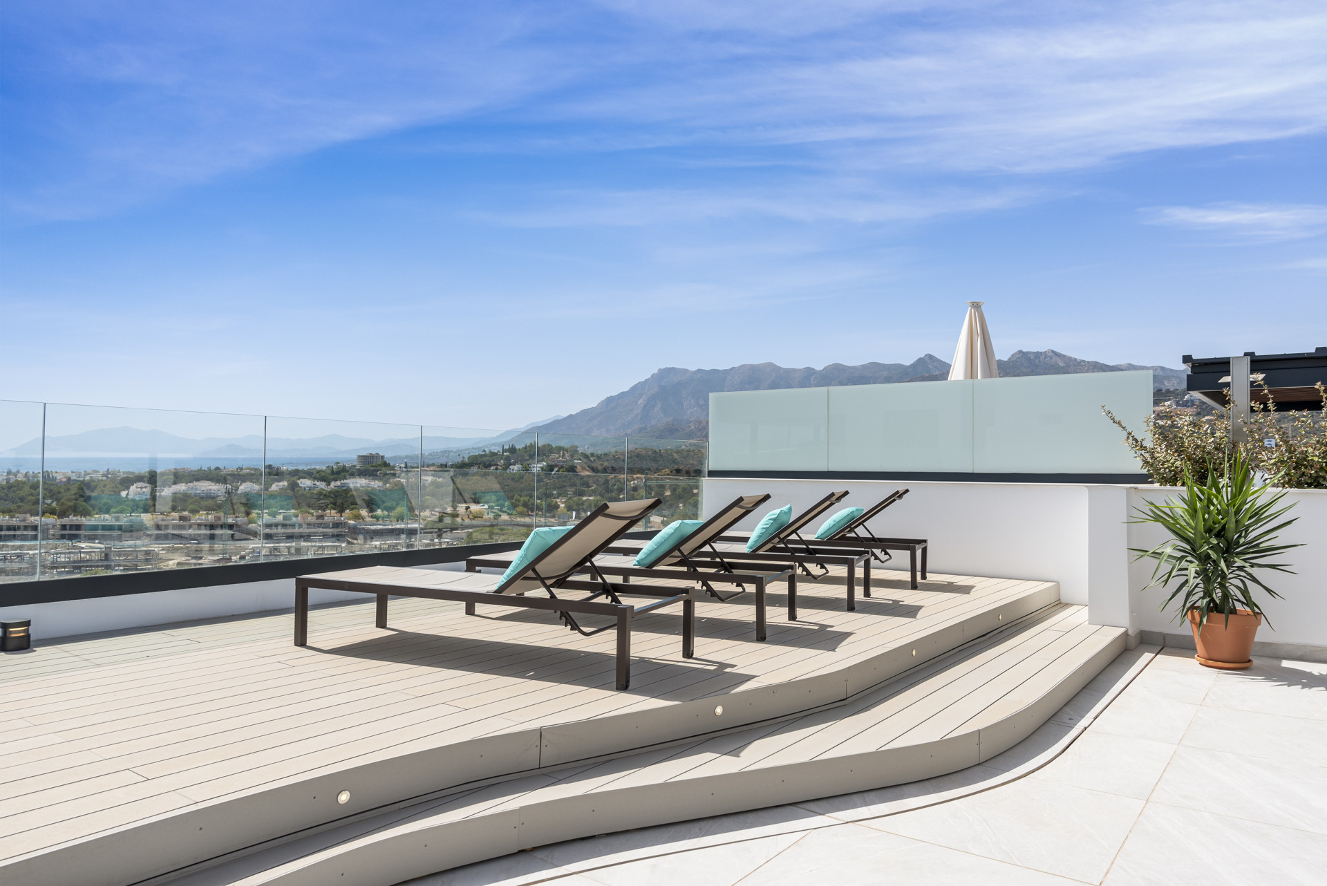 From here you have a staircase leading to the Rooftop Terrace with outstanding views of the pools and gardens, on to the Med, with the backdrop of majestic mountains. There is an array of sunbeds, a dining table and BBQ, and a chillout zone – the perfect space to enjoy at any time of day.