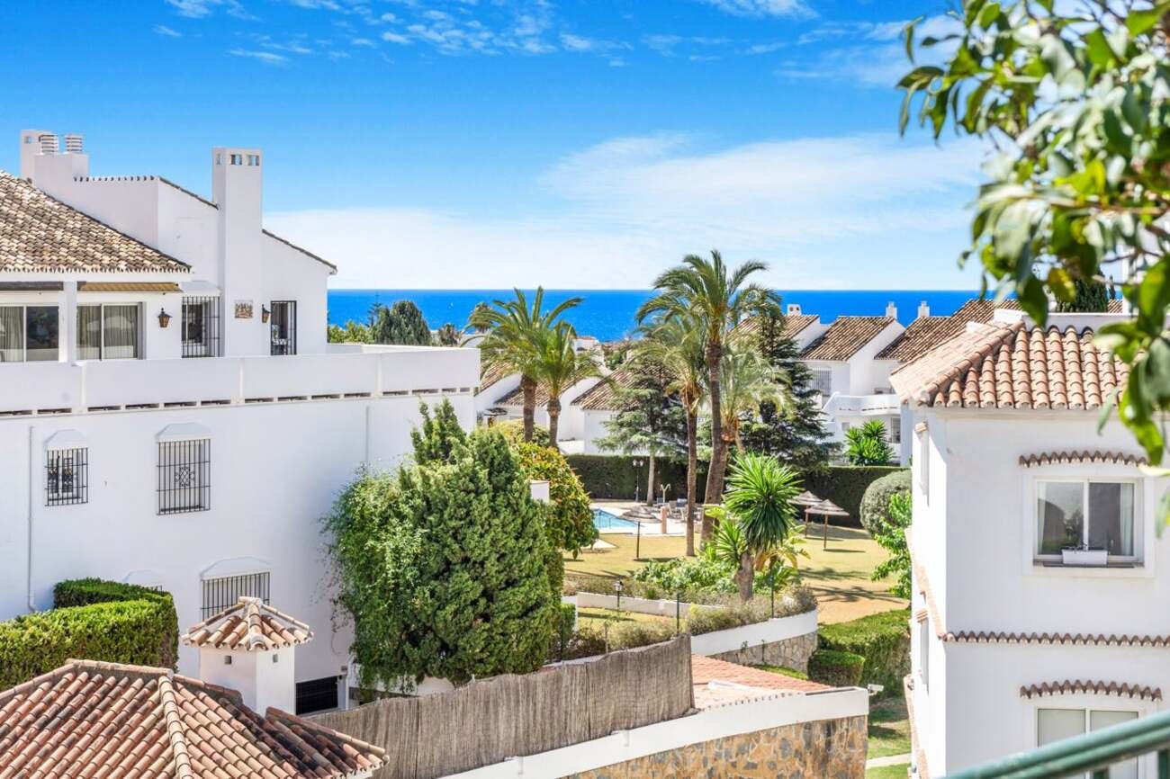 Ein herausragendes Merkmal des Reihenhauses ist die Terrasse, die von einer gelben Markise beschattet wird und ideal für Outdoor-Entspannung oder -Mahlzeiten ist. Dieser Bereich bietet Blick auf die gepflegten Gärten und den Gemeinschaftspool sowie auf das Meer und ist damit ein idealer Ort, um das angenehme Wetter in Marbella zu genießen.