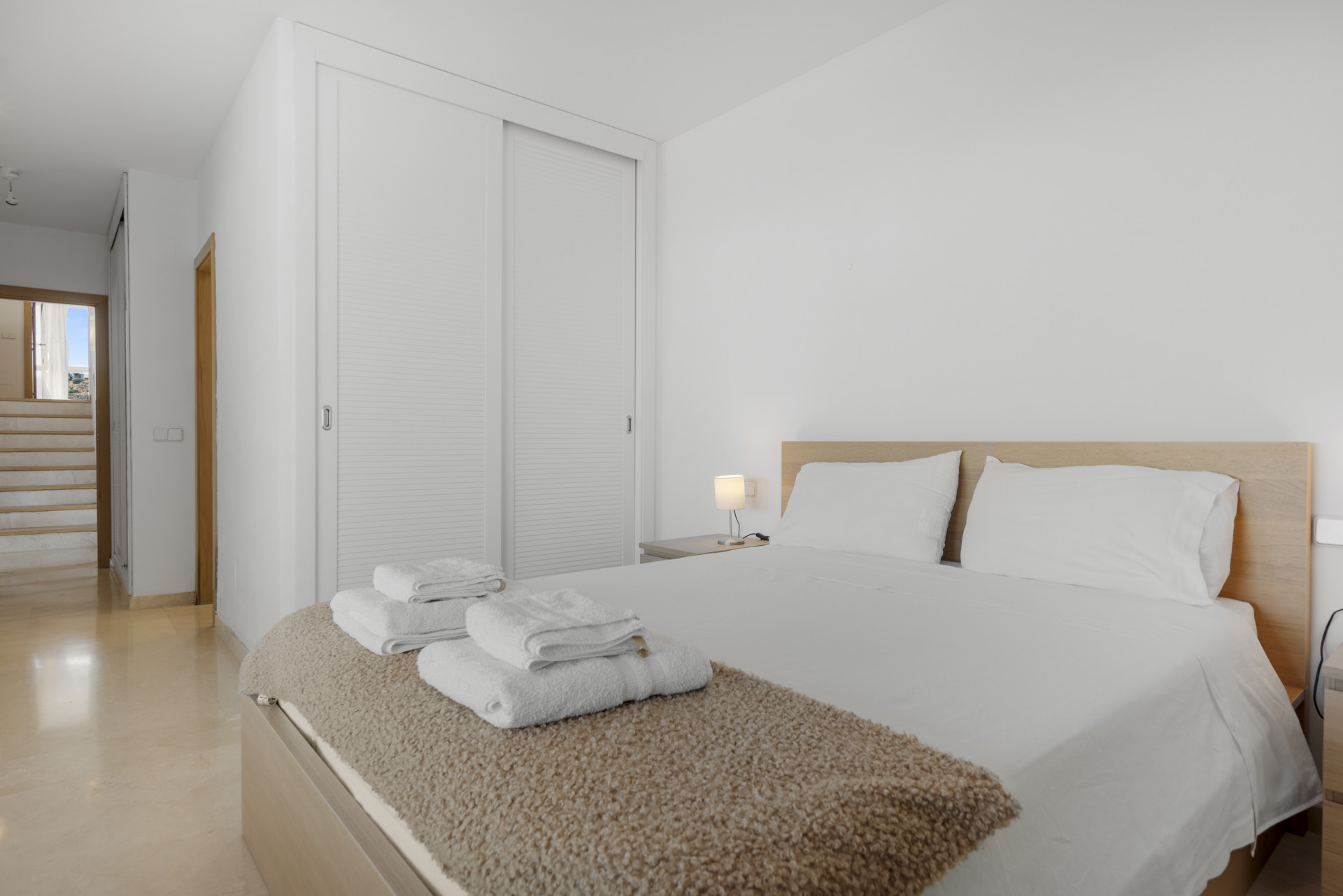 Im Inneren ist die Villa mit einer Mischung aus warmer, einladender Dekoration und eleganten, modernen Elementen durchdacht gestaltet. Der linke Flügel des Hauses beherbergt zwei stilvolle Schlafzimmer, jeweils ausgestattet mit 180-cm-Betten und SMART-Wandfernsehern, die ein modernes Badezimmer mit Badewannen-/Duschkombination teilen. Ein separater Arbeitsbereich mit Schreibtisch und Bürostuhl bietet eine friedliche Umgebung mit Blick auf den ruhigen Garten, ideal für Heimarbeit oder stille Reflexion. Die obere Etage, bekannt als Familienetage, beherbergt zwei weitere Schlafzimmer. Eines verfügt über ein 180-cm-Bett und einen Arbeitsbereich, während die Mastersuite ein luxuriöses Refugium ist, komplett mit begehbarem Kleiderschrank, einer privaten Terrasse mit atemberaubender Aussicht und einem eleganten En-suite-Badezimmer mit Whirlpool-Badewanne und Dusche. Das Hauptschlafzimmer ist mit einem 180-cm-Bett sowie einem zusätzlichen 140-cm-Bett ausgestattet und ermöglicht flexible Schlafmöglichkeiten.
