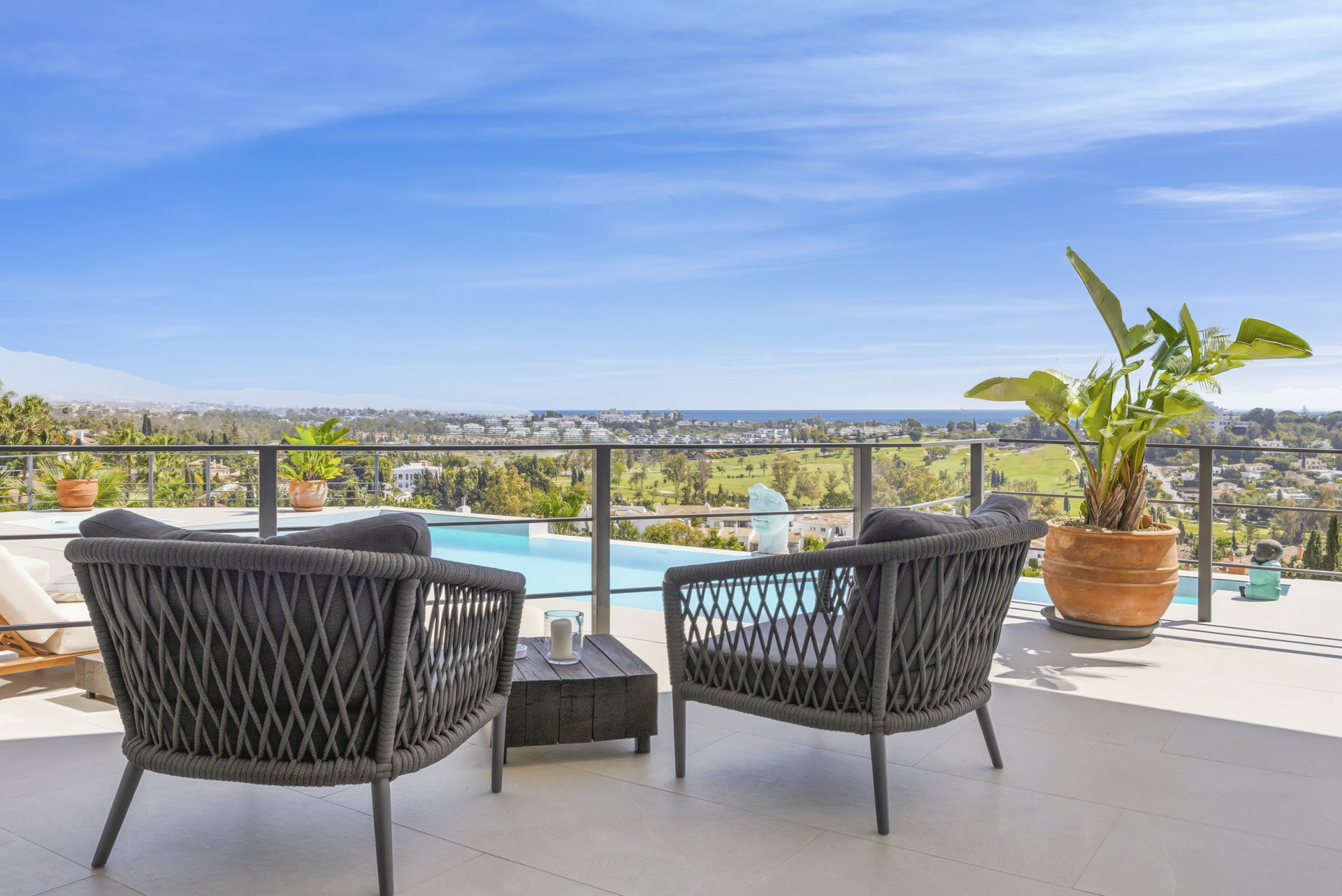 Die hübsche und geräumige Unterkunft verfügt über 1.400 m² liegt direkt am Golfplatz und verfügt über eine tolle Aussicht auf den Strand / das Meer und die Berge.