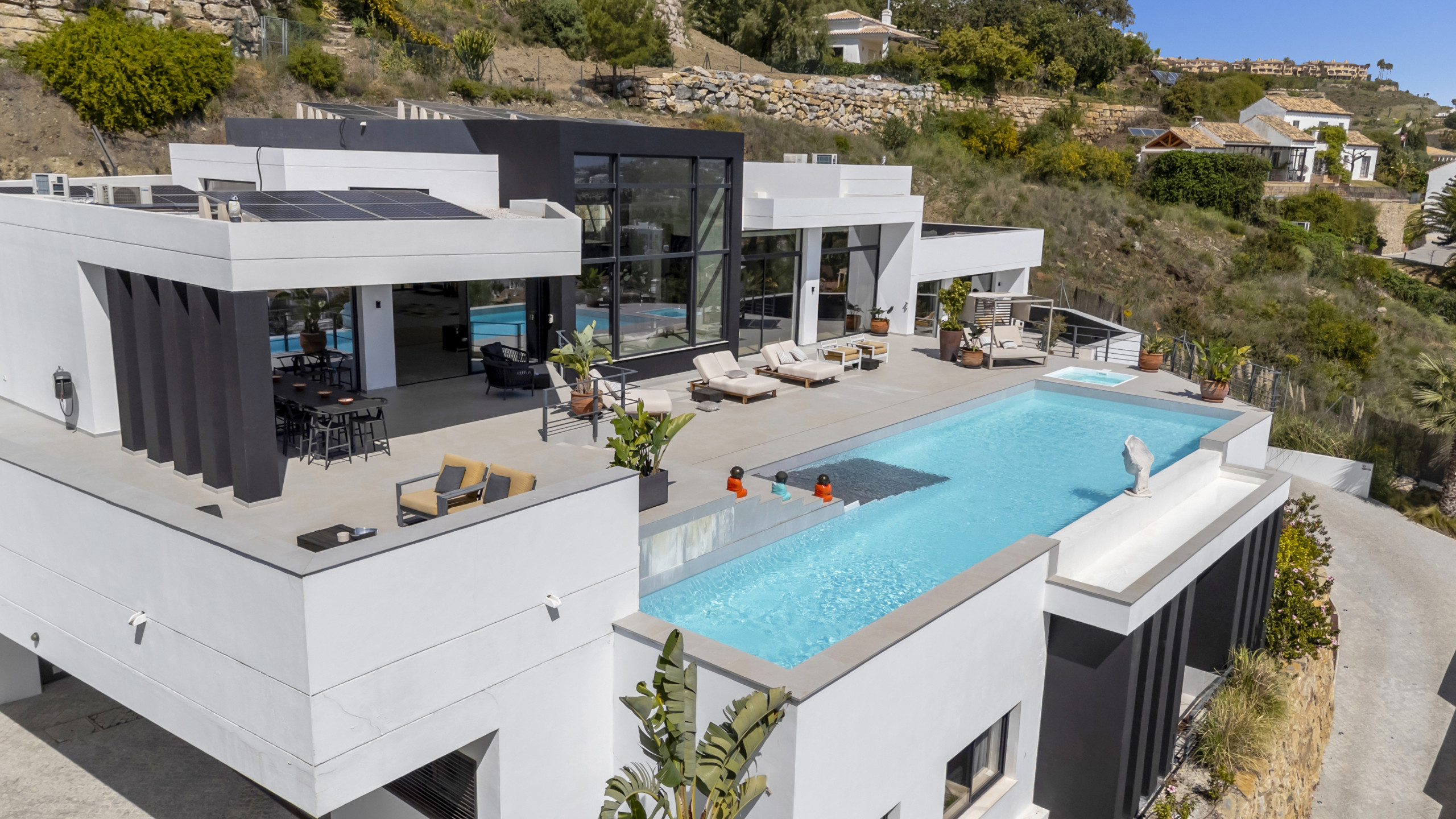 Die Unterkunft verfügt über ein umzäuntes Grundstück, eine Terrasse, eine Waschmaschine, einen Trockner, einen Grillplatz, einen Kamin, ein Bügeleisen/-brett, einen Zimmersafe, ein Internetanschluss (WLAN), ein Föhn, ein Balkon, ein Fitnessraum, eine Alarmanlage, ein SPA-Bereich, eine Zentralheizung, eine Klimaanlage, ein Privatpool, eine Garage (3 Stellplätze) auf dem Grundstück, ein Fernsehgeräte.