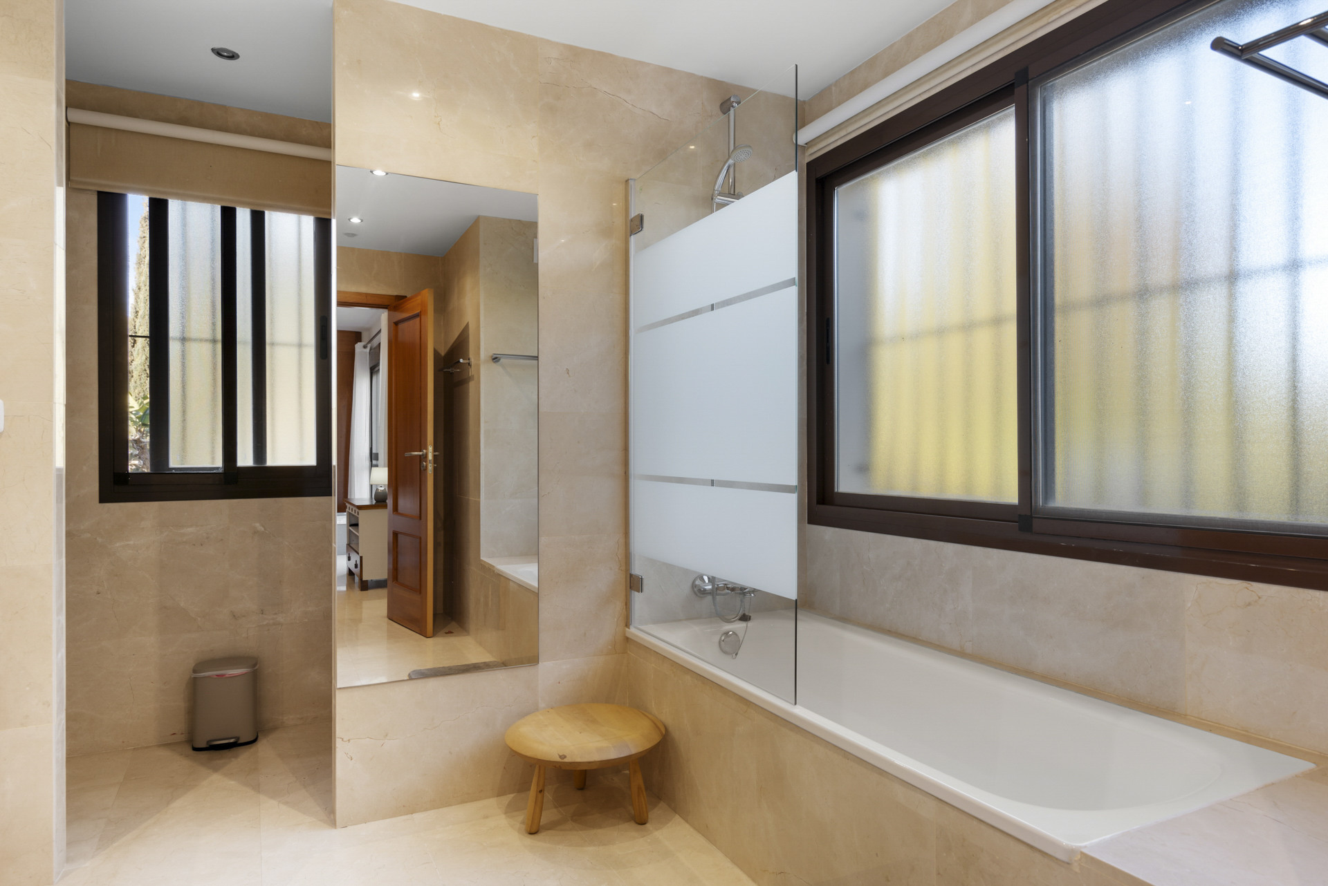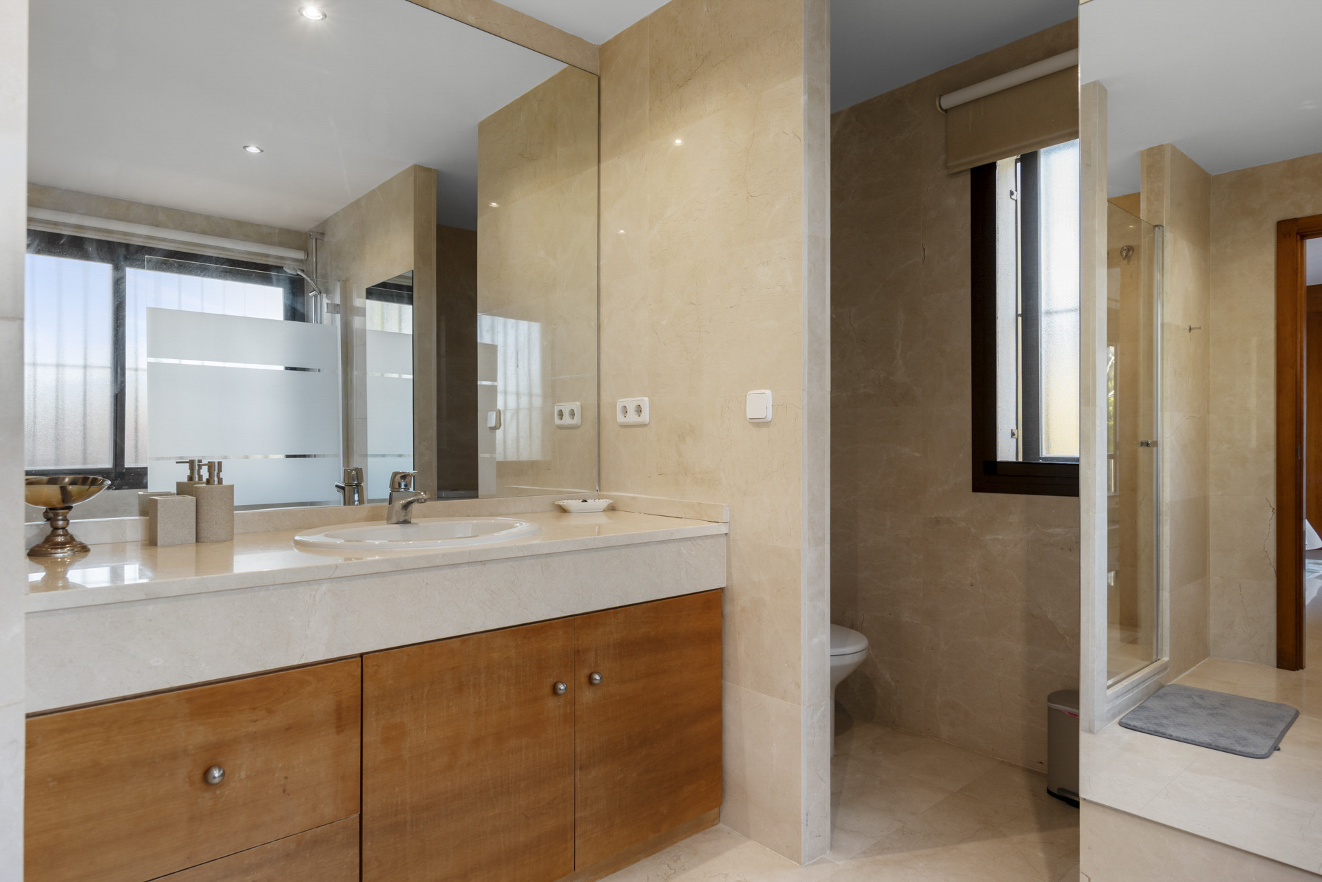 Das Hauptschlafzimmer ist geräumig mit einem großartigen Badezimmer en suite und einem begehbaren Kleiderschrank mit Blick auf den Poolbereich. Insgesamt gibt es 5 Schlafzimmer. Ein weiteres Schlafzimmer mit Badezimmer en suite befindet sich im Kellerbereich mit direktem Zugang zum Poolbereich.