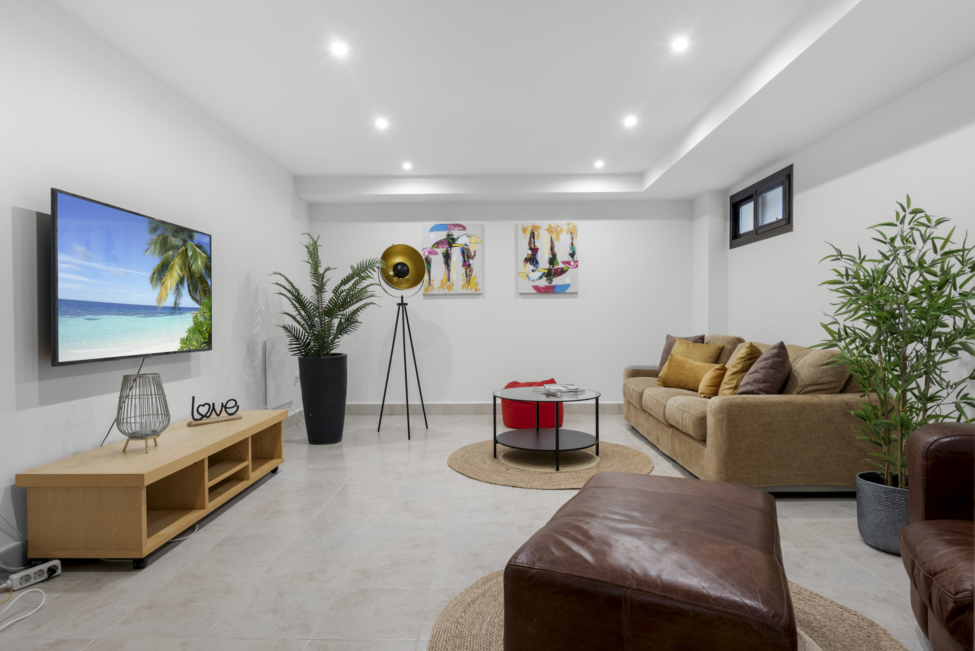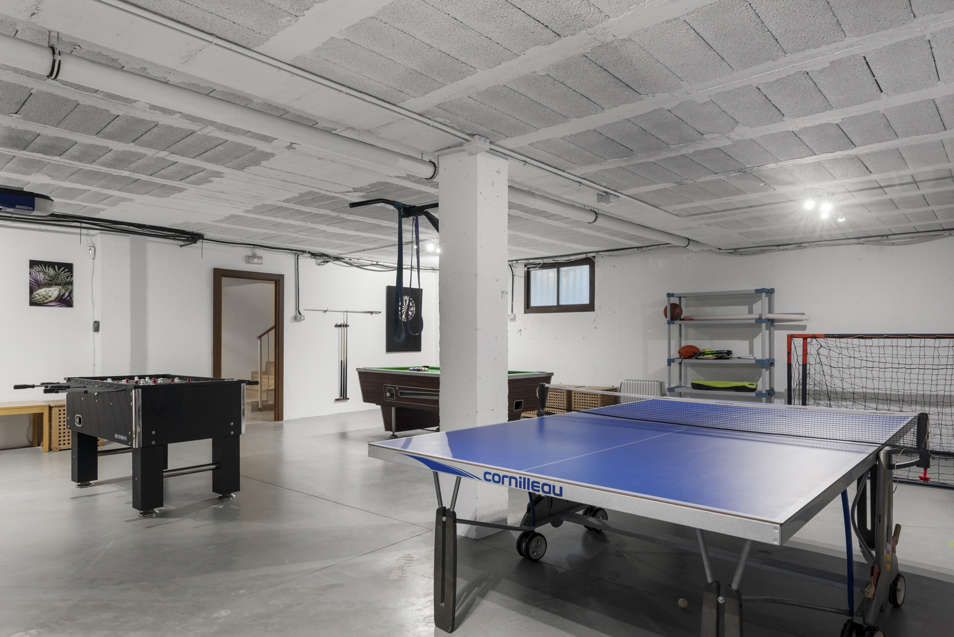 Der Wohnbereich ist offen gestaltet, wo Sie – auf der Eingangsebene rechts – den Essbereich für 12 Personen und auch den Waschraum mit Waschmaschine und Trockner finden. Das Wohnzimmer, die Küche und der Erholungsbereich befinden sich eine Ebene tiefer. Dort finden Sie auch einen Billardtisch.