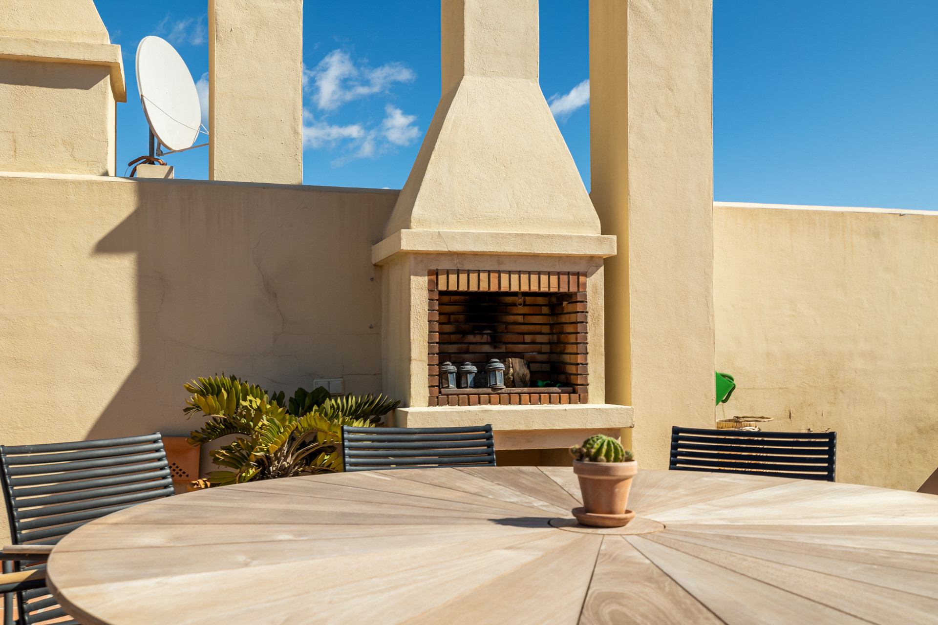 Uno de los mejores y ciertamente aspectos únicos de este apartamento es el amplio espacio de terraza. Hay una terraza de buen tamaño fuera del área de la cocina desde donde se puede ver la piscina y el mar. Esta terraza cuenta con un área de estar, así como un área de comedor / desayuno con una barbacoa. ¡Esta terraza está orientada al sur, por lo que es perfecta para todos los amantes del sol! También hay un horno de piedra para pizza para su disfrute.