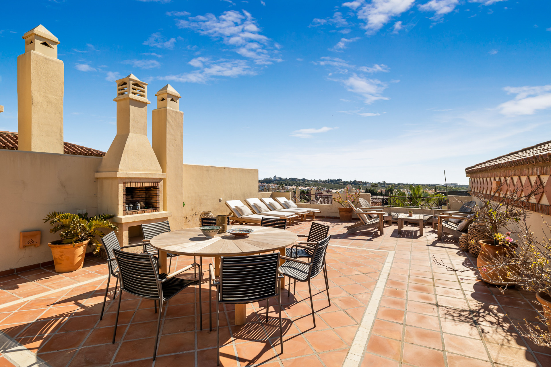 Por otro lado, hay una gran terraza trasera justo fuera de la sala de estar. Esta es muy agradable para escapar del sol durante el día y, al mismo tiempo, disfrutar del sol de la tarde. Cuenta con una bonita zona de estar y una escalera que sube a la terraza en la azotea. La terraza en la azotea es muy grande y tiene sol durante todo el día. Con impresionantes vistas sobre las colinas, la Concha y el mar Mediterráneo, es el lugar ideal para relajarse completamente. Allí encontrarás una zona de estar, tumbonas y una mesa de comedor. El lugar perfecto para realmente sentir esa sensación de vacaciones libre de estrés.