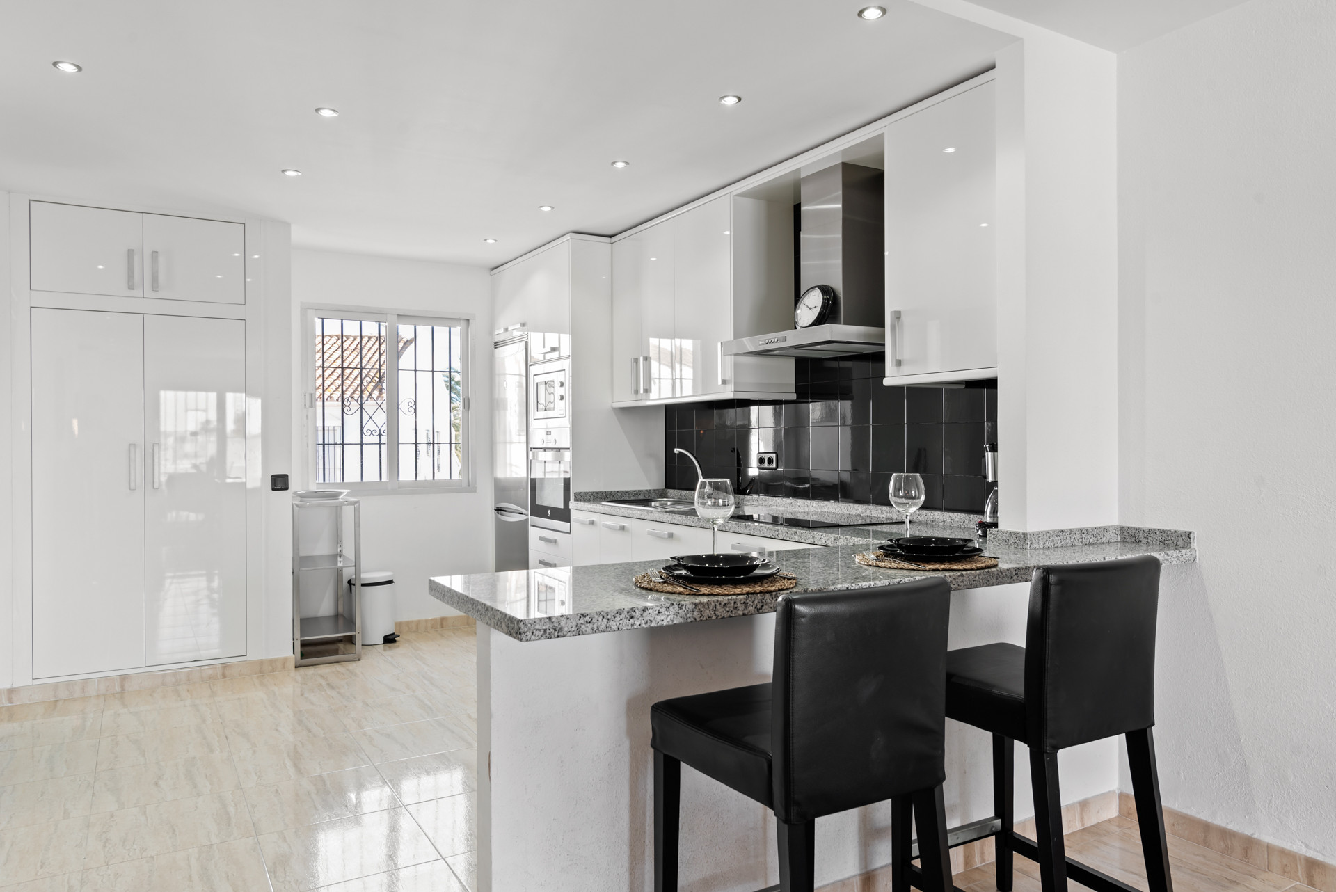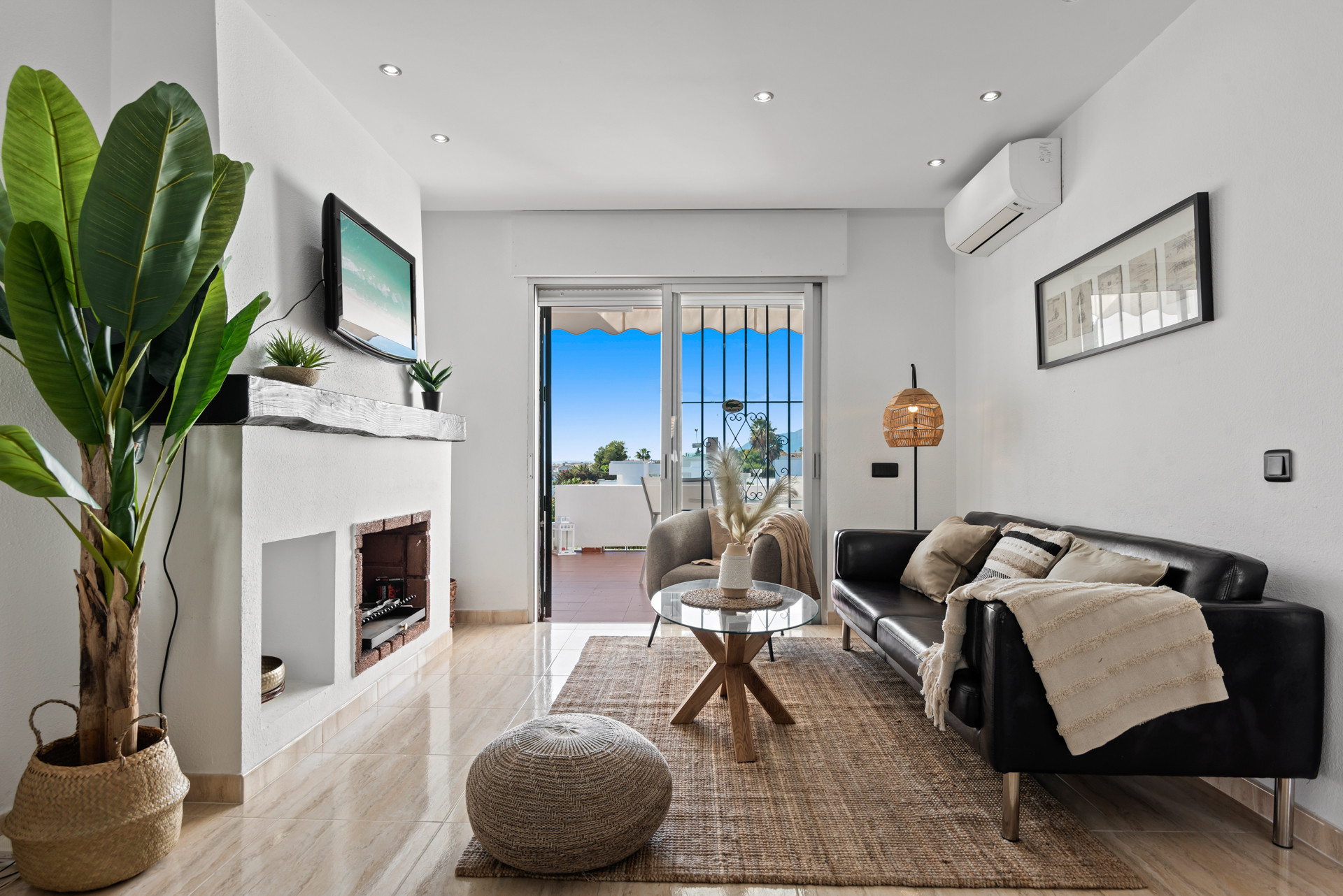 Bienvenido a Casa Cielo! Casa Cielo es un apartamento de 2 dormitorios y 1 baño bellamente presentado en Aldea Blanca, que ofrece comodidad moderna en una de las comunidades cerradas más solicitadas de Nueva Andalucía. El apartamento cuenta con una distribución diáfana y luminosa donde las áreas de estar, comedor y cocina fluyen perfectamente, creando un ambiente espacioso y social lleno de luz natural. Grandes puertas corredizas de vidrio conectan el interior directamente con la terraza, mejorando la sensación de amplitud en todo el espacio. Uno de los dormitorios se integra sin esfuerzo en el área de estar, creando un espacio flexible que puede funcionar como una sala adicional o área de invitados, manteniendo al mismo tiempo la estética abierta y contemporánea del apartamento. El suelo de madera cálida y los tonos neutros dan al hogar un ambiente tranquilo y moderno.