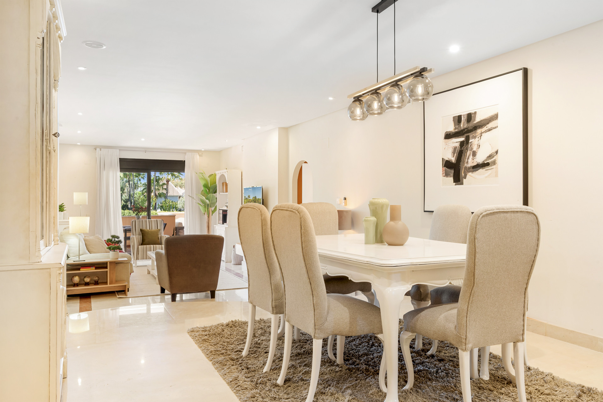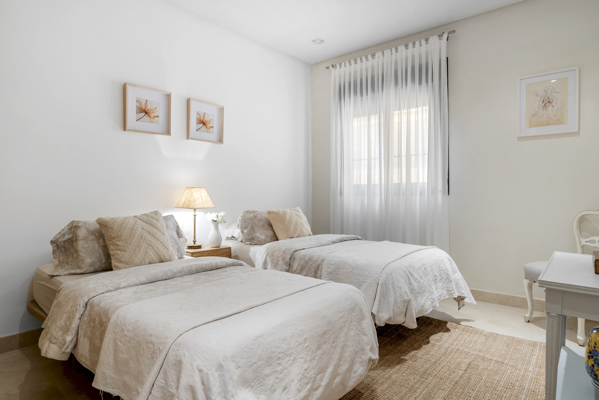 Bienvenido a Casa Cielo! Casa Cielo es un apartamento de 2 dormitorios y 1 baño bellamente presentado en Aldea Blanca, que ofrece comodidad moderna en una de las comunidades cerradas más solicitadas de Nueva Andalucía. El apartamento cuenta con una distribución diáfana y luminosa donde las áreas de estar, comedor y cocina fluyen perfectamente, creando un ambiente espacioso y social lleno de luz natural. Grandes puertas corredizas de vidrio conectan el interior directamente con la terraza, mejorando la sensación de amplitud en todo el espacio. Uno de los dormitorios se integra sin esfuerzo en el área de estar, creando un espacio flexible que puede funcionar como una sala adicional o área de invitados, manteniendo al mismo tiempo la estética abierta y contemporánea del apartamento. El suelo de madera cálida y los tonos neutros dan al hogar un ambiente tranquilo y moderno.