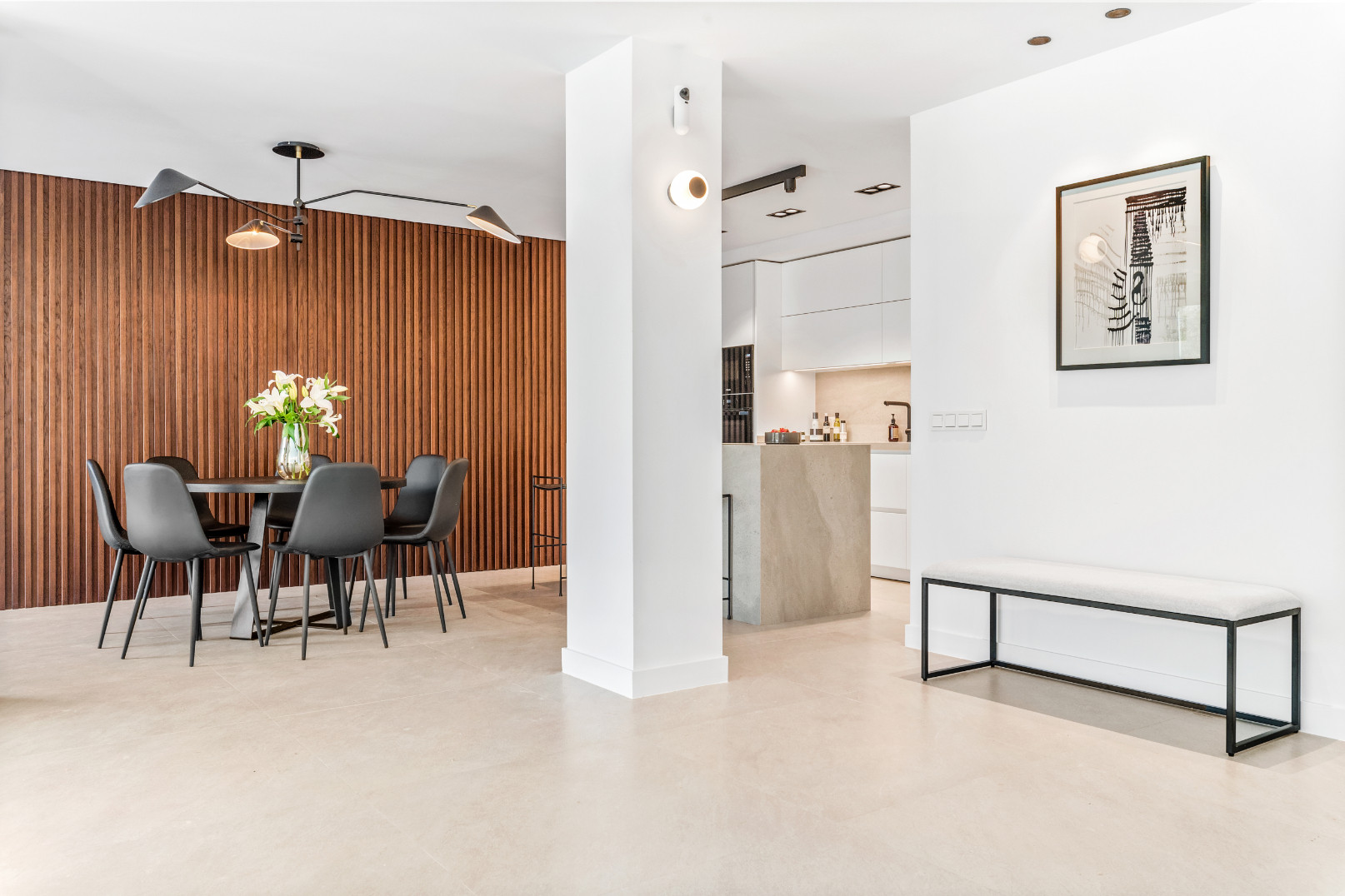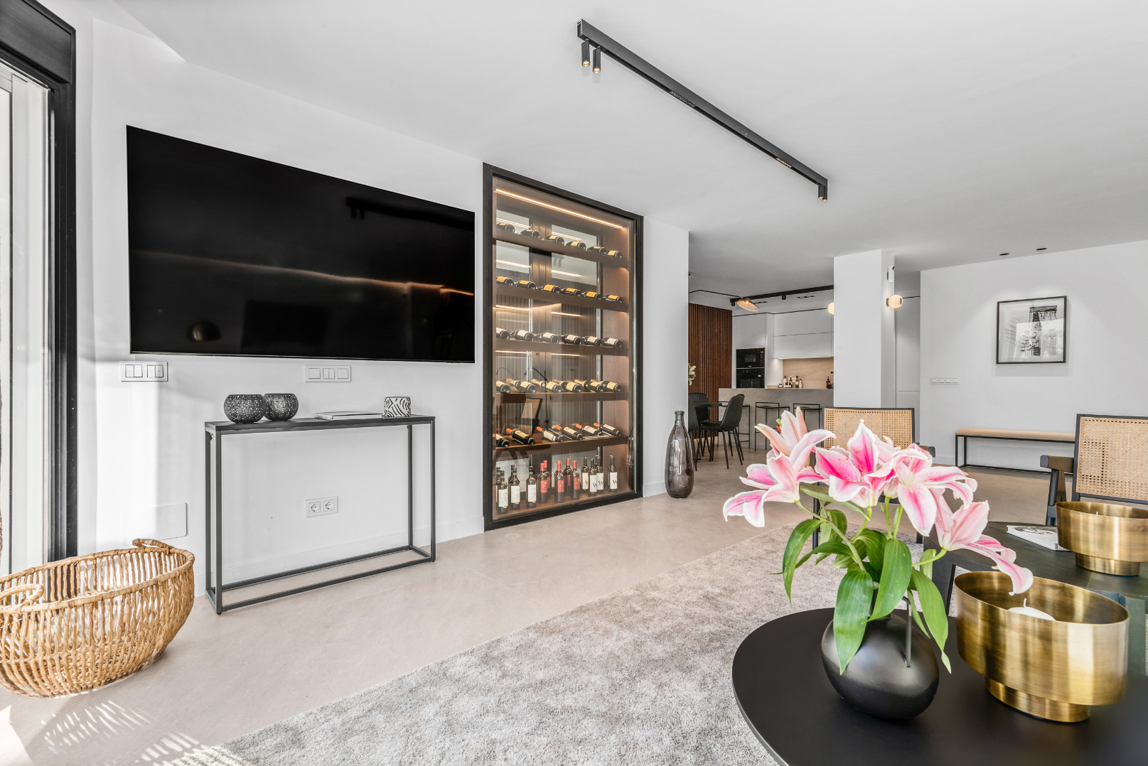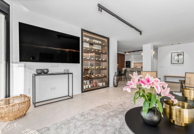 Entrando en el área de estar de planta abierta, le dan la bienvenida el diseño y la decoración boho contemporáneos, y las vistas sobre Golf Valley, la Montaña La Concha y el Mar Mediterráneo.