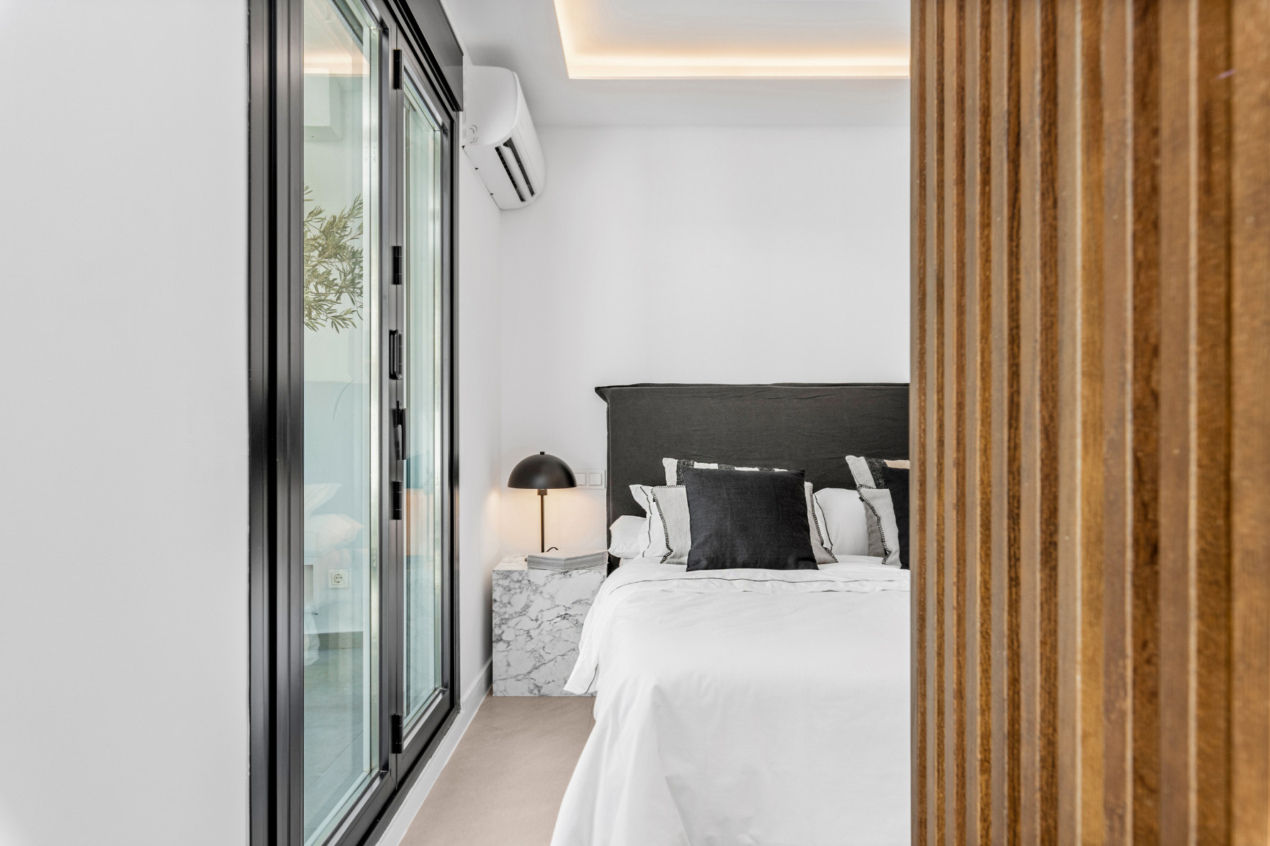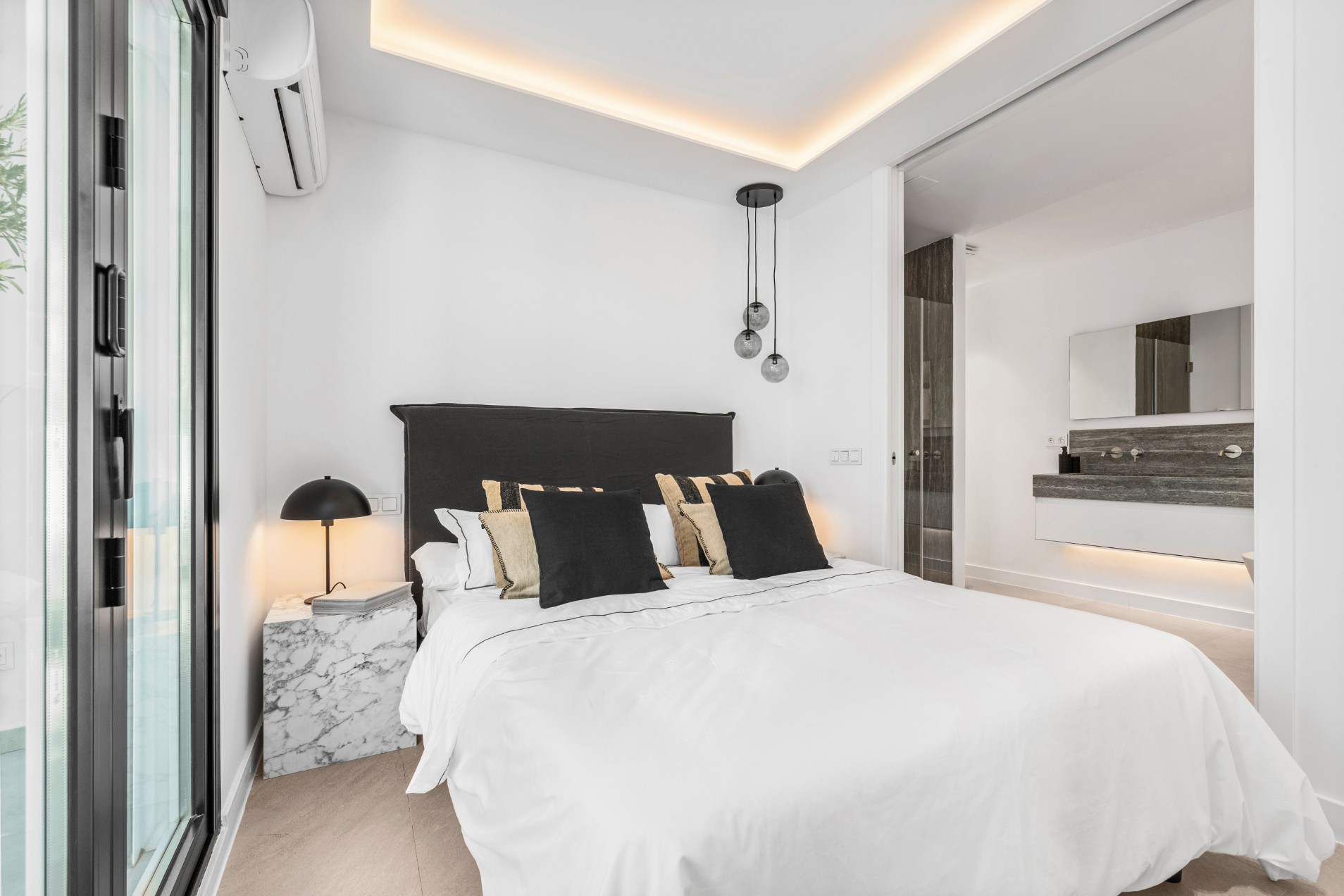 La habitación principal tiene acceso directo a la terraza, un baño en suite con ducha de lluvia y un escritorio.