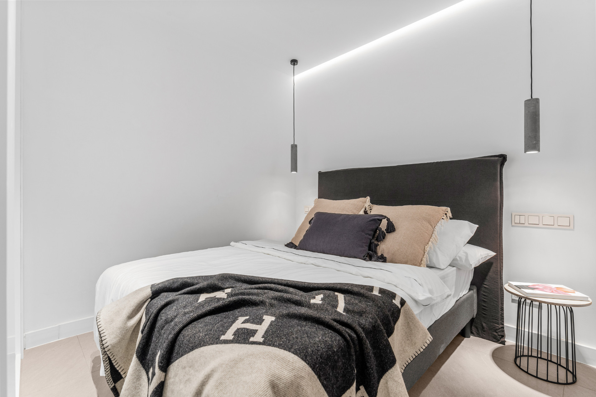 La primera habitación tiene una cama de matrimonio (180 cm), la segunda habitación tiene una cama de matrimonio queen (160 cm), y en la tercera habitación hay una cama individual (140 cm).