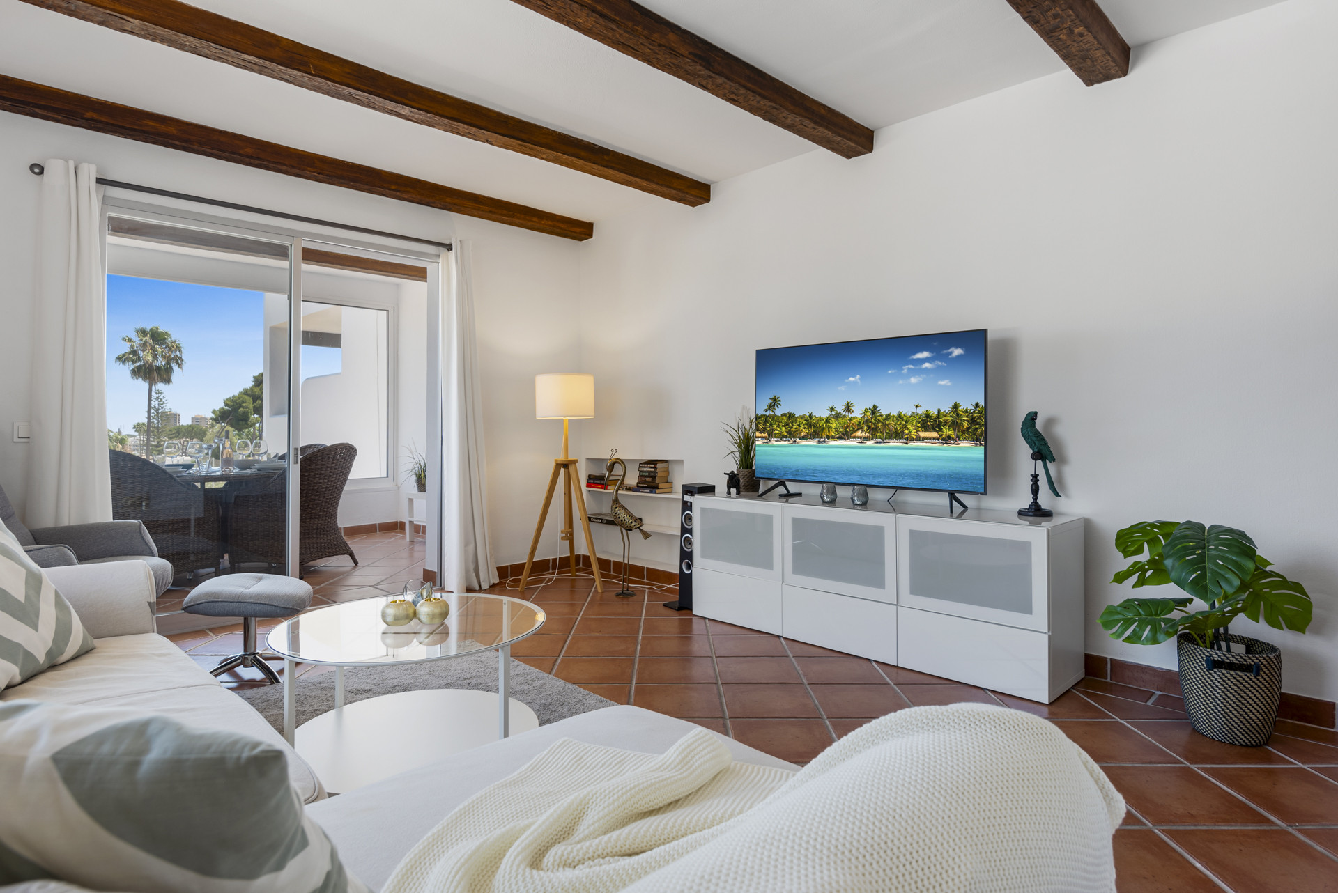 Bienvenido a Casa Cielo! Casa Cielo es un apartamento de 2 dormitorios y 1 baño bellamente presentado en Aldea Blanca, que ofrece comodidad moderna en una de las comunidades cerradas más solicitadas de Nueva Andalucía. El apartamento cuenta con una distribución diáfana y luminosa donde las áreas de estar, comedor y cocina fluyen perfectamente, creando un ambiente espacioso y social lleno de luz natural. Grandes puertas corredizas de vidrio conectan el interior directamente con la terraza, mejorando la sensación de amplitud en todo el espacio. Uno de los dormitorios se integra sin esfuerzo en el área de estar, creando un espacio flexible que puede funcionar como una sala adicional o área de invitados, manteniendo al mismo tiempo la estética abierta y contemporánea del apartamento. El suelo de madera cálida y los tonos neutros dan al hogar un ambiente tranquilo y moderno.