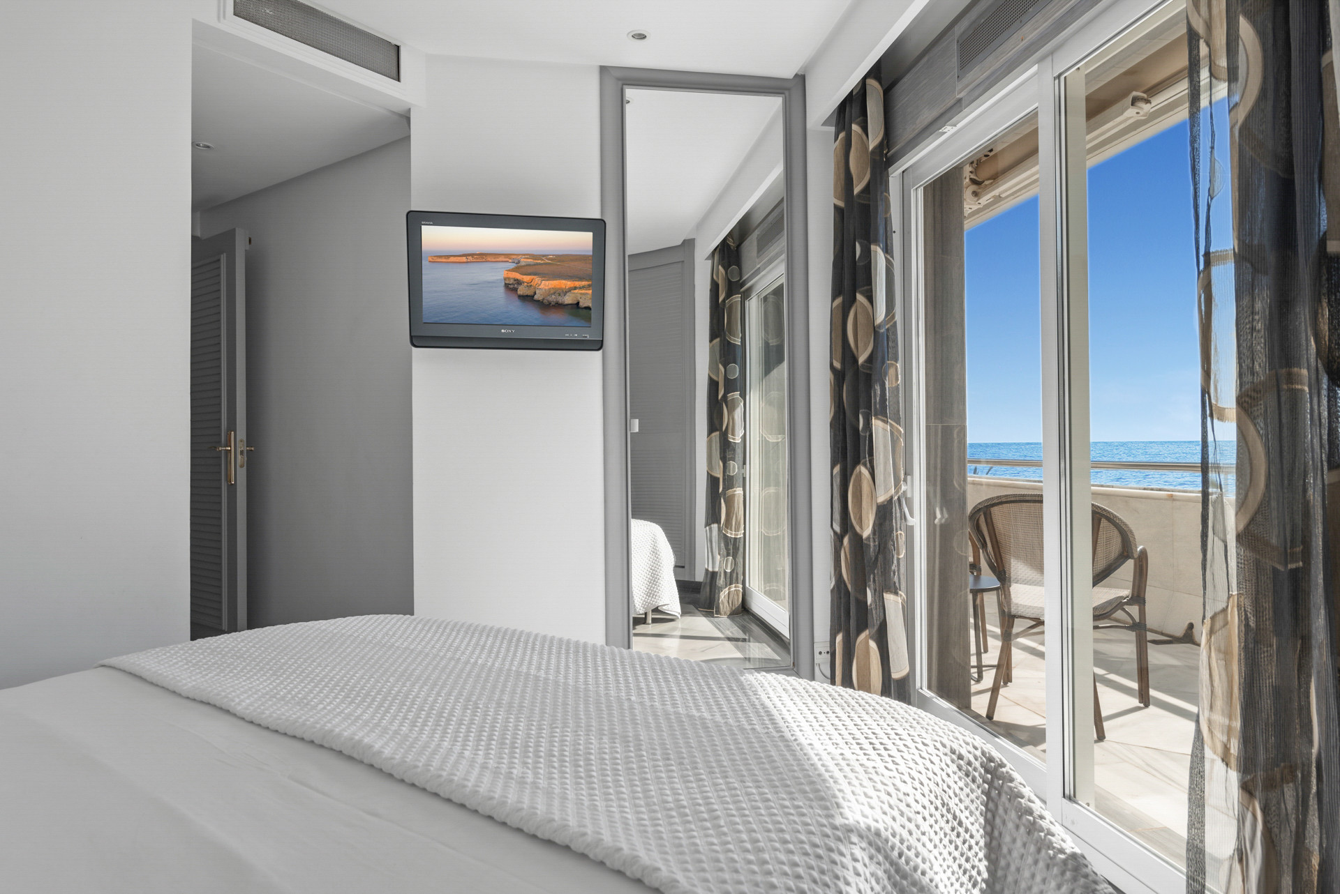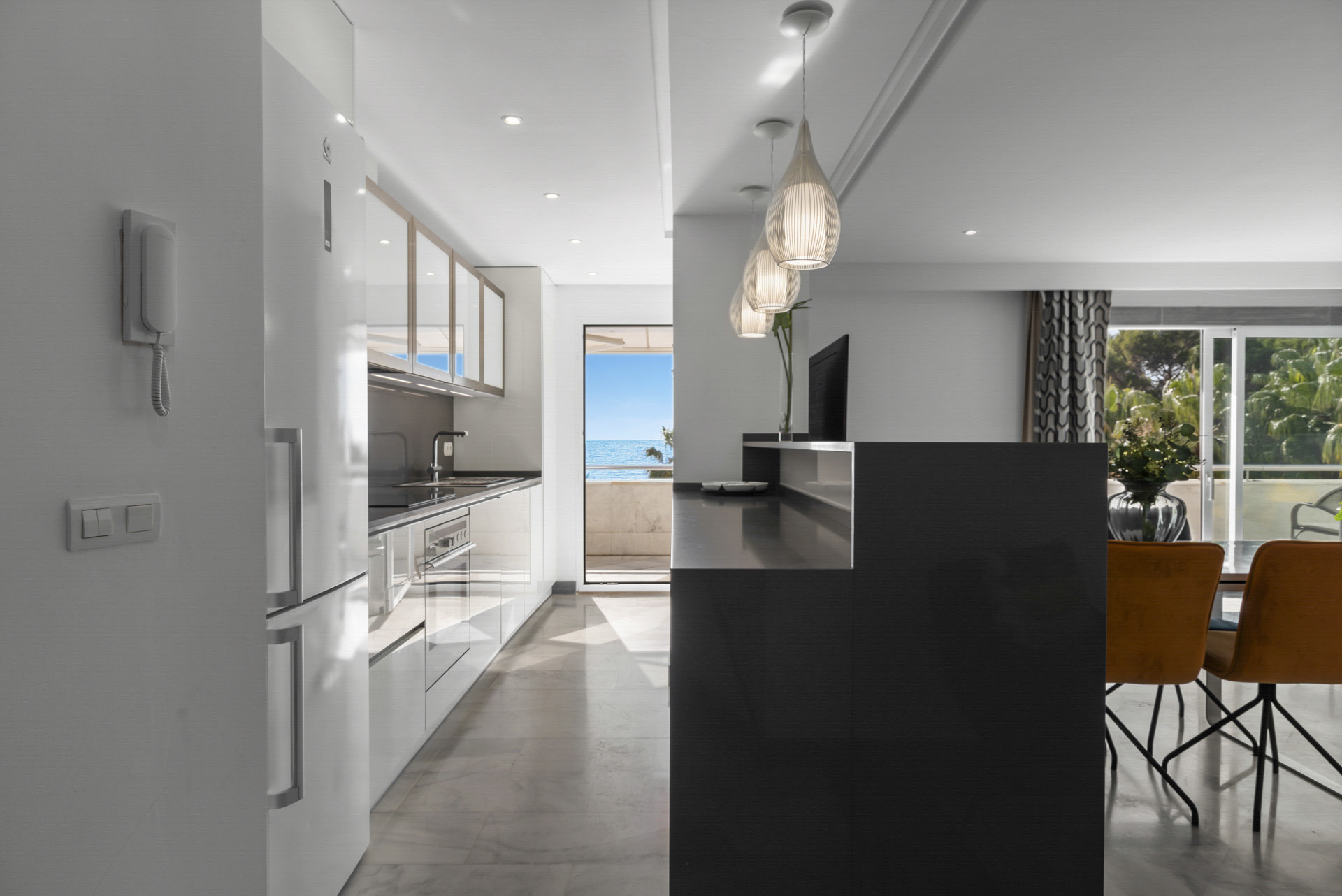 Al entrar en el apartamento, te recibe una atmósfera de confortable tranquilidad. El apartamento cuenta con un amplio diseño con colores frescos, muebles y decoración, creando un ambiente elegante pero acogedor. Desde la sala de estar, la cocina, la terraza y los dormitorios, te sorprenderán las maravillosas vistas del mar y el paseo marítimo de la Milla de Oro de Marbella.