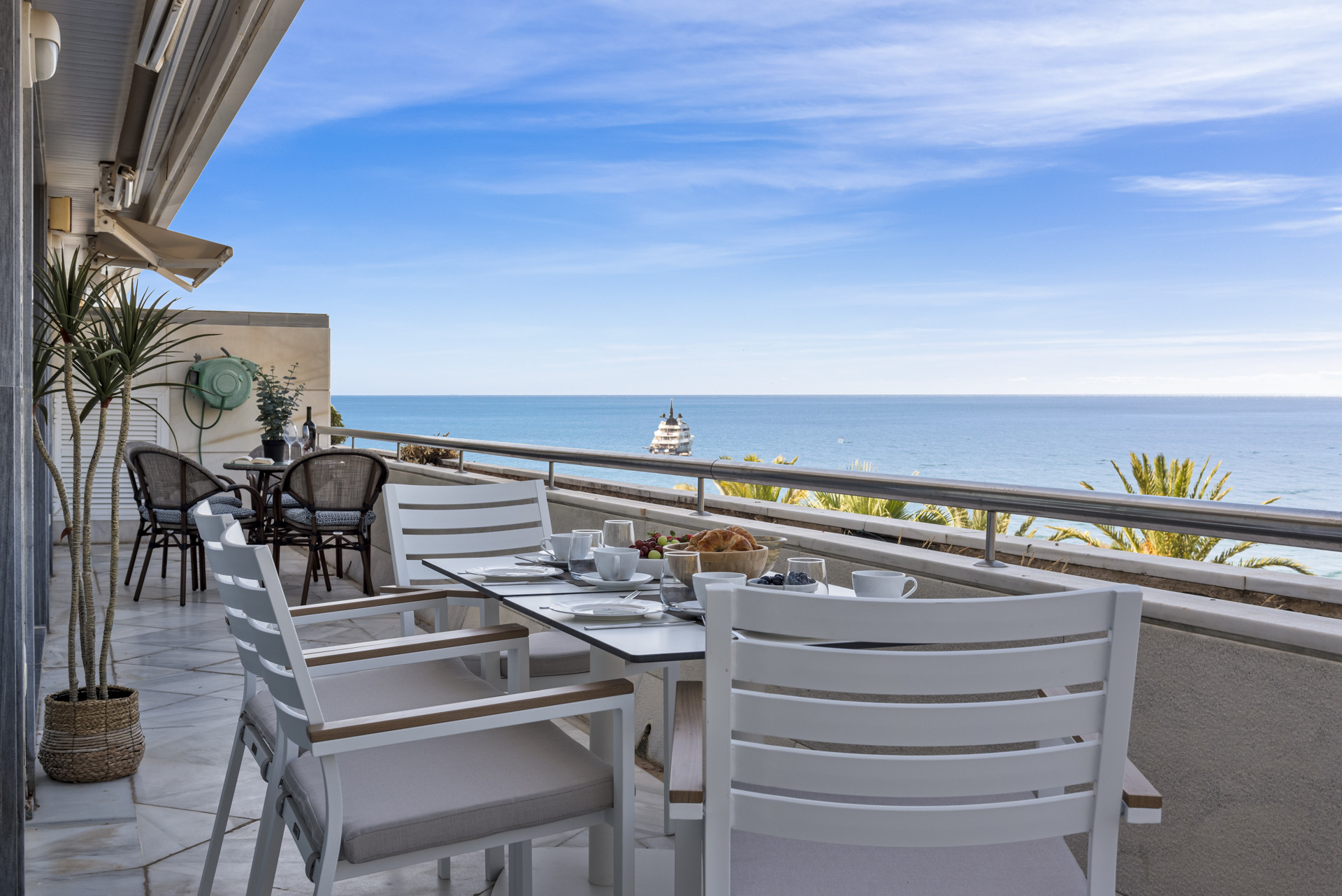El punto culminante de esta impresionante residencia es su terraza privada, donde puedes relajarte y disfrutar del soleado Mediterráneo mientras disfrutas de las impresionantes vistas de los jardines comunitarios, la piscina y las aguas azules del mar Mediterráneo.
