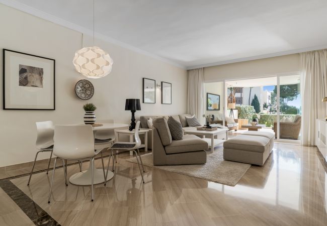 Bienvenido a Casa Cielo! Casa Cielo es un apartamento de 2 dormitorios y 1 baño bellamente presentado en Aldea Blanca, que ofrece comodidad moderna en una de las comunidades cerradas más solicitadas de Nueva Andalucía. El apartamento cuenta con una distribución diáfana y luminosa donde las áreas de estar, comedor y cocina fluyen perfectamente, creando un ambiente espacioso y social lleno de luz natural. Grandes puertas corredizas de vidrio conectan el interior directamente con la terraza, mejorando la sensación de amplitud en todo el espacio. Uno de los dormitorios se integra sin esfuerzo en el área de estar, creando un espacio flexible que puede funcionar como una sala adicional o área de invitados, manteniendo al mismo tiempo la estética abierta y contemporánea del apartamento. El suelo de madera cálida y los tonos neutros dan al hogar un ambiente tranquilo y moderno.