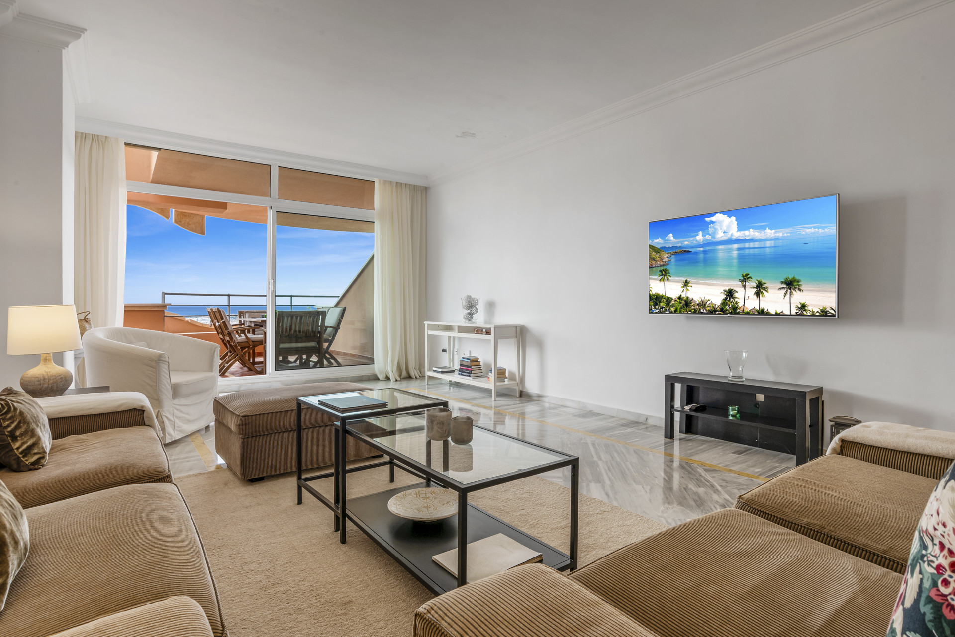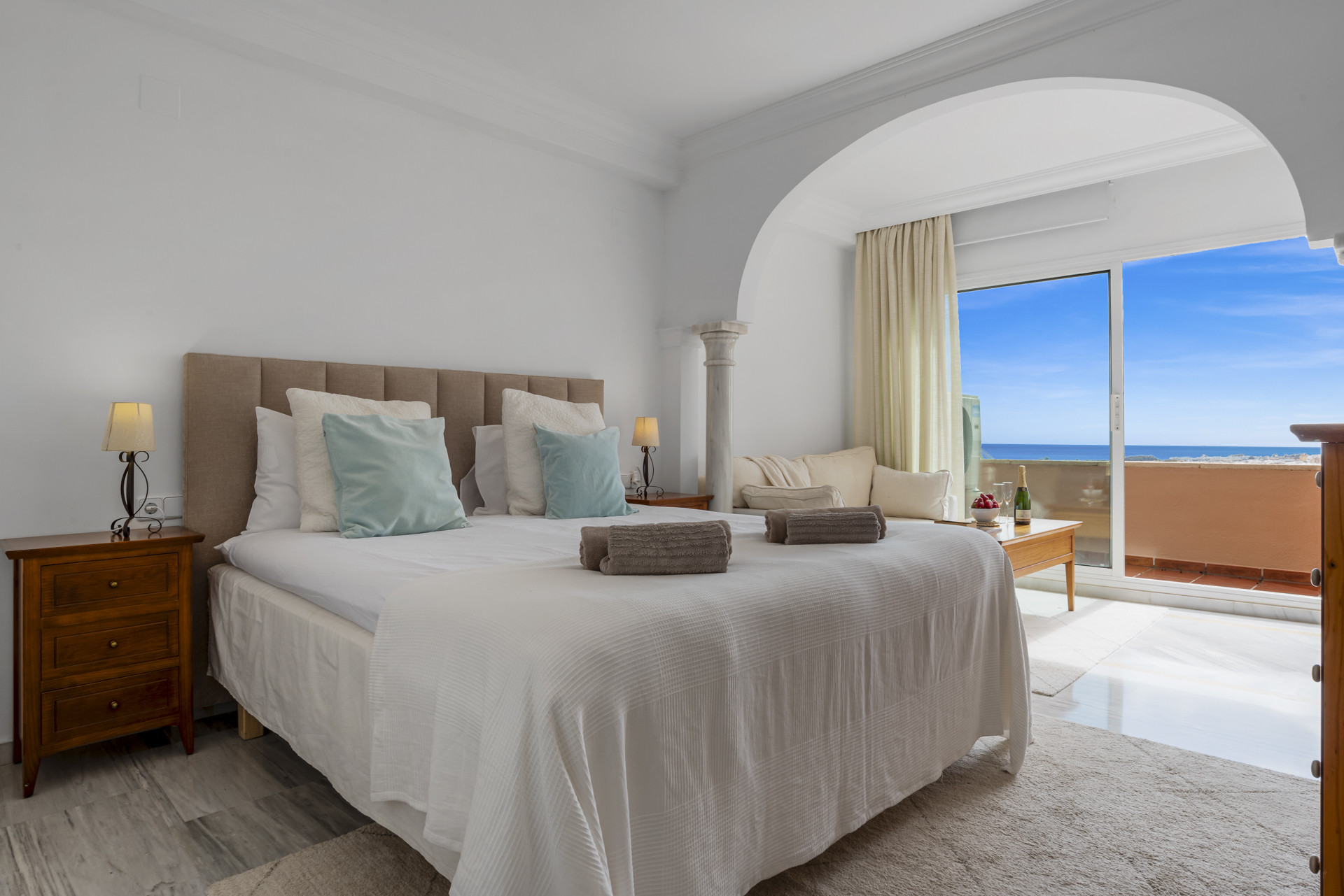 Bienvenido a Casa Cielo! Casa Cielo es un apartamento de 2 dormitorios y 1 baño bellamente presentado en Aldea Blanca, que ofrece comodidad moderna en una de las comunidades cerradas más solicitadas de Nueva Andalucía. El apartamento cuenta con una distribución diáfana y luminosa donde las áreas de estar, comedor y cocina fluyen perfectamente, creando un ambiente espacioso y social lleno de luz natural. Grandes puertas corredizas de vidrio conectan el interior directamente con la terraza, mejorando la sensación de amplitud en todo el espacio. Uno de los dormitorios se integra sin esfuerzo en el área de estar, creando un espacio flexible que puede funcionar como una sala adicional o área de invitados, manteniendo al mismo tiempo la estética abierta y contemporánea del apartamento. El suelo de madera cálida y los tonos neutros dan al hogar un ambiente tranquilo y moderno.