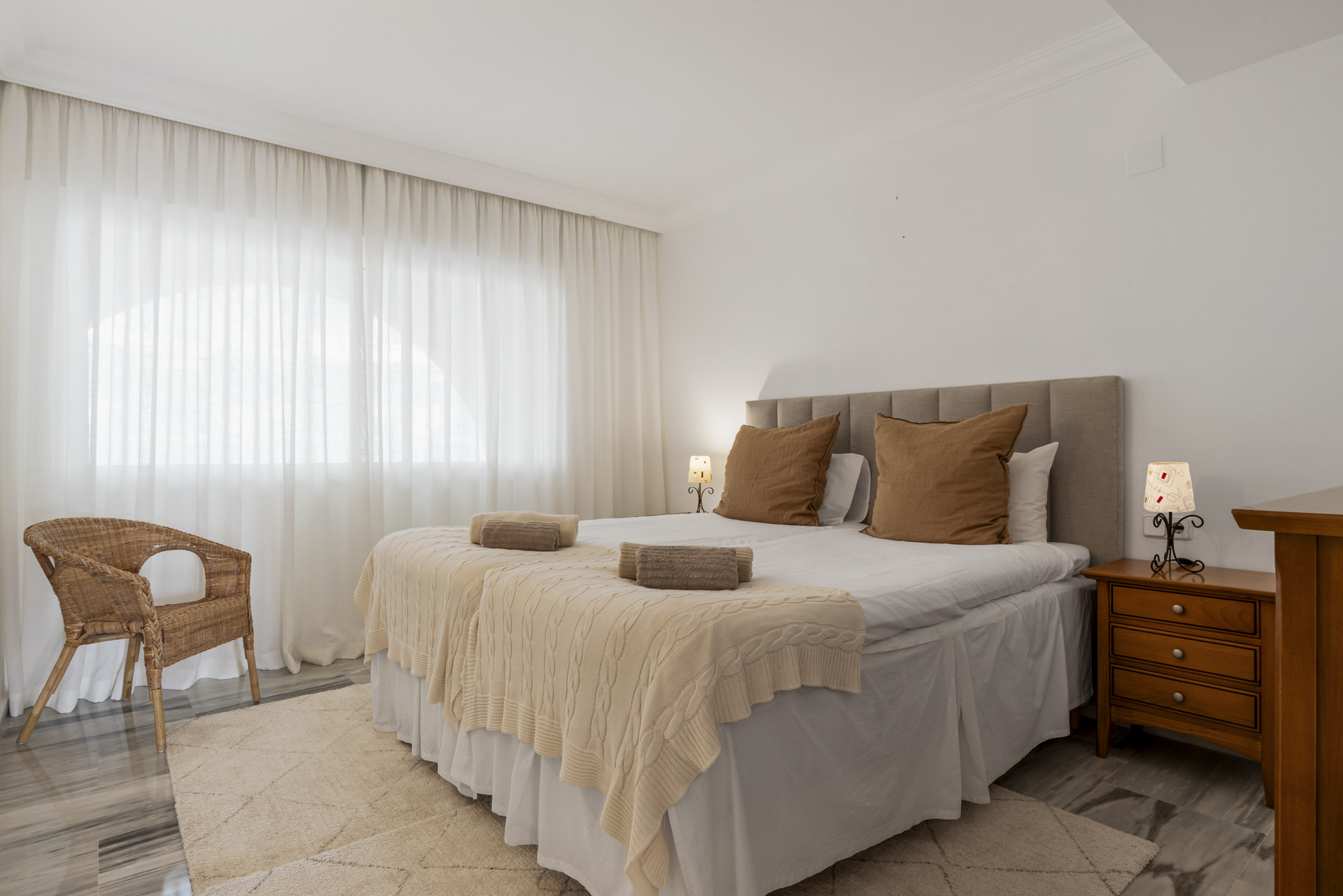 Ambos dormitorios son espaciosos y serenos, incluyendo una generosa suite principal con amplio espacio de armario y un baño privado en suite. Cada habitación ha sido diseñada cuidadosamente para capturar la luz natural y maximizar la sensación de espacio. El apartamento en general ofrece mucho espacio para extenderse, lo que lo hace ideal tanto para vivir a tiempo completo como para uso vacacional de alto nivel.