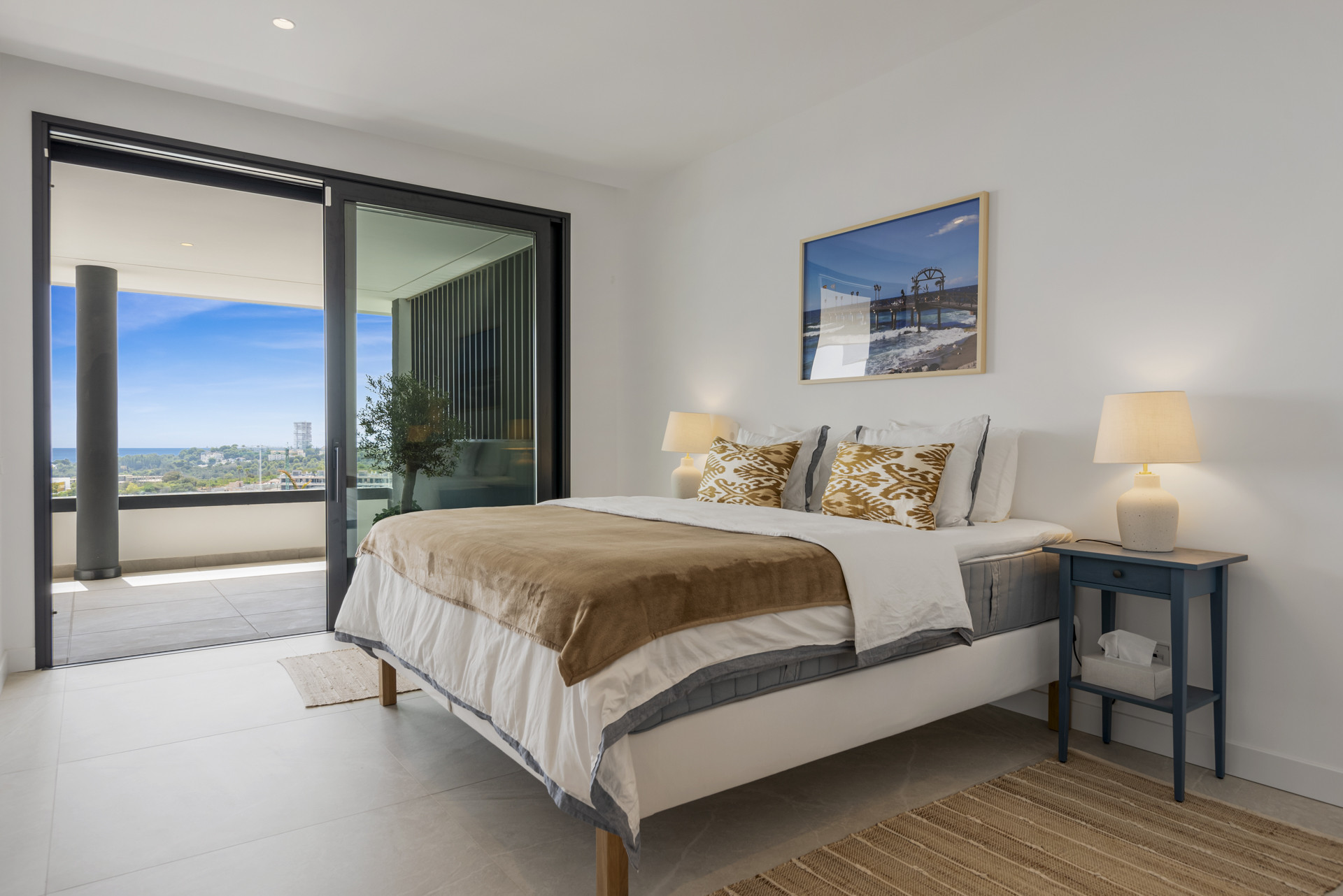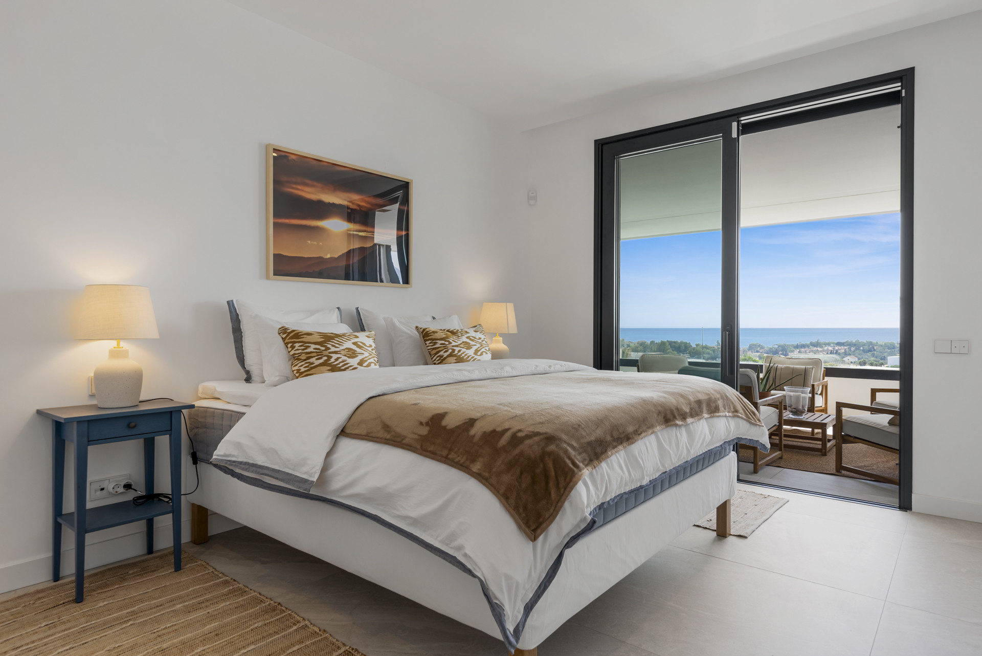 Bienvenido a Casa Cielo! Casa Cielo es un apartamento de 2 dormitorios y 1 baño bellamente presentado en Aldea Blanca, que ofrece comodidad moderna en una de las comunidades cerradas más solicitadas de Nueva Andalucía. El apartamento cuenta con una distribución diáfana y luminosa donde las áreas de estar, comedor y cocina fluyen perfectamente, creando un ambiente espacioso y social lleno de luz natural. Grandes puertas corredizas de vidrio conectan el interior directamente con la terraza, mejorando la sensación de amplitud en todo el espacio. Uno de los dormitorios se integra sin esfuerzo en el área de estar, creando un espacio flexible que puede funcionar como una sala adicional o área de invitados, manteniendo al mismo tiempo la estética abierta y contemporánea del apartamento. El suelo de madera cálida y los tonos neutros dan al hogar un ambiente tranquilo y moderno.