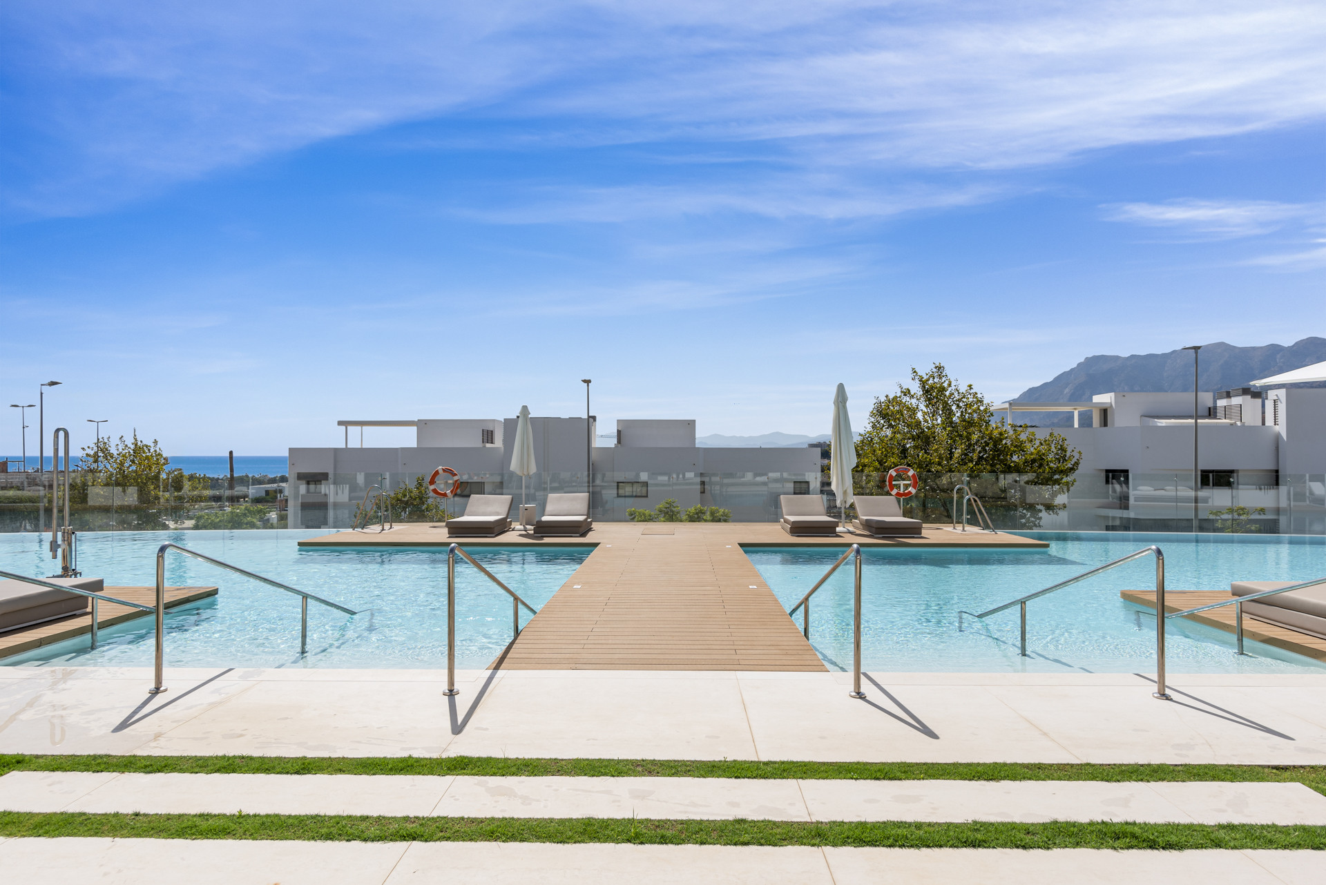 From here you have a staircase leading to the Rooftop Terrace with outstanding views of the pools and gardens, on to the Med, with the backdrop of majestic mountains. There is an array of sunbeds, a dining table and BBQ, and a chillout zone – the perfect space to enjoy at any time of day.