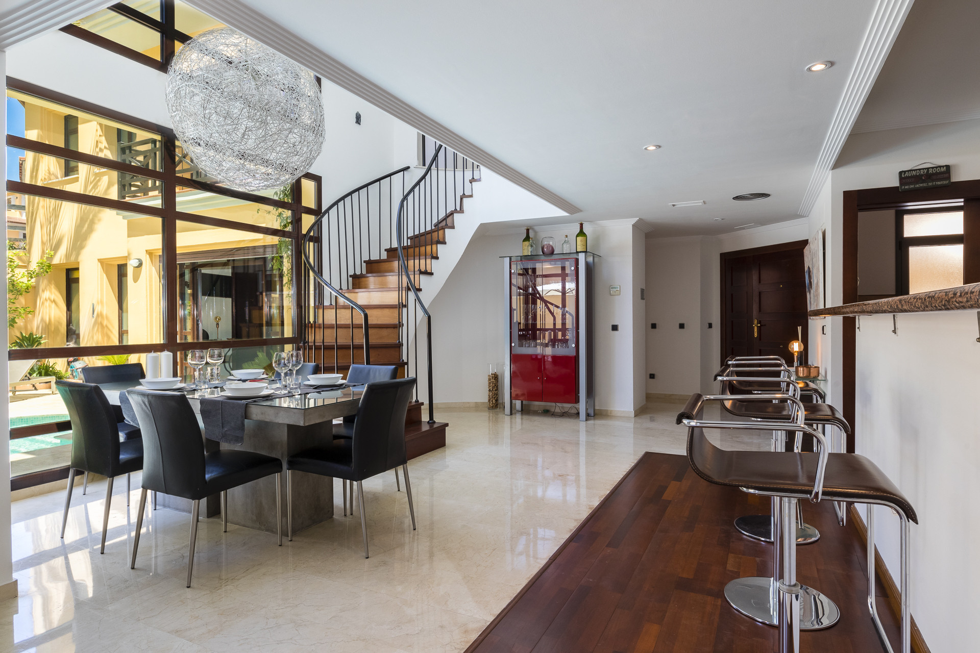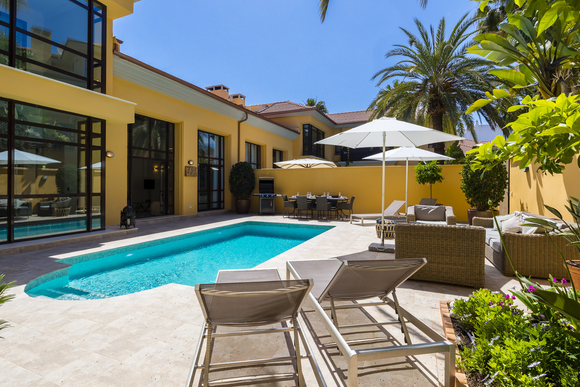 A solo unos minutos de la playa, esta casa bellamente diseñada ofrece interiores elegantes y espacios exteriores excepcionales. La terraza principal está completamente amueblada y es ideal para entretener, con un área de barbacoa y una mesa de comedor exterior, perfecta para largas veladas con familia y amigos.