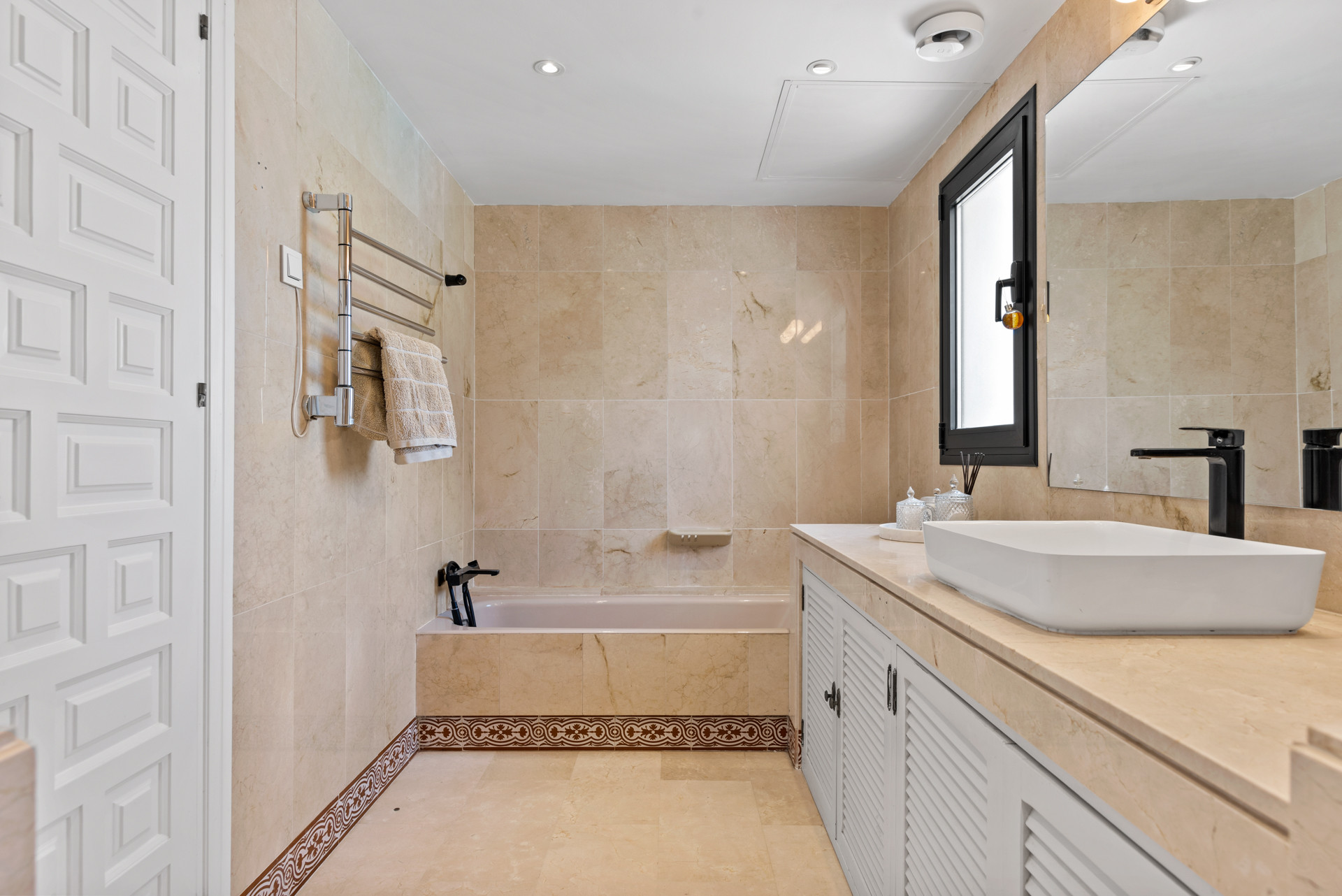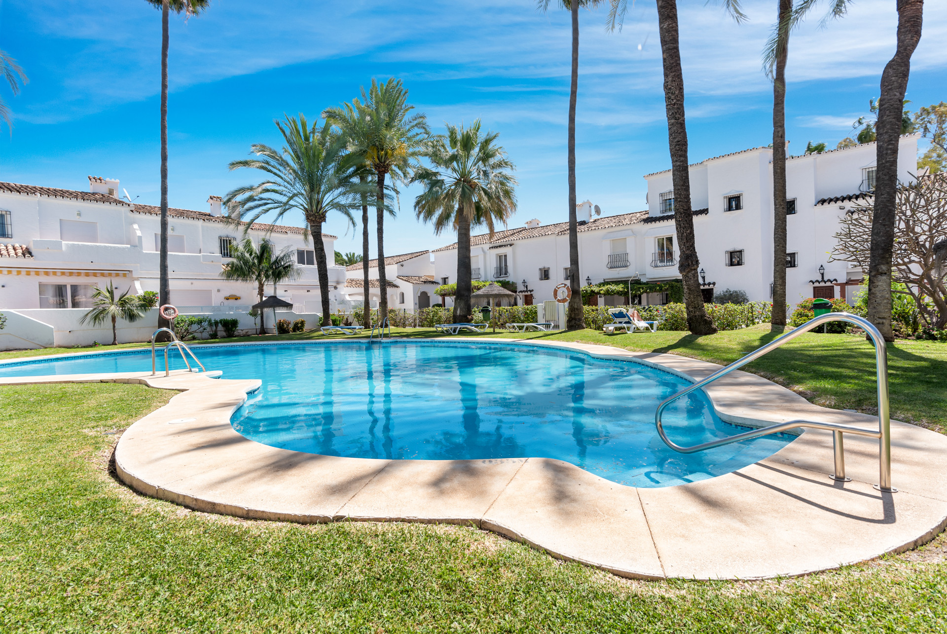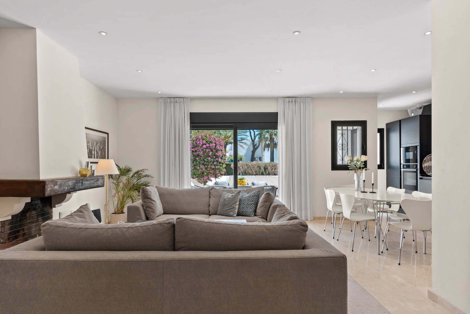 Casa Palm es una casa adosada bellamente renovada de 3 dormitorios y 3 baños en el prestigioso Los Naranjos Country Club, Nueva Andalucía. Combinando la elegancia moderna con el encanto mediterráneo, esta sofisticada residencia ofrece un retiro sereno a solo minutos de los mejores campos de golf, playas y vibrantes restaurantes de Marbella. La sala de estar y comedor de planta abierta irradia calidez y estilo, con lujosos muebles modernos, una acogedora chimenea y grandes puertas correderas que conducen directamente a la terraza del jardín. La elegante cocina negra es un punto focal llamativo, equipada con electrodomésticos de alta gama, superficies de piedra pulida y un amplio espacio de almacenamiento, creando un espacio perfecto para cocinar y entretenerse.
