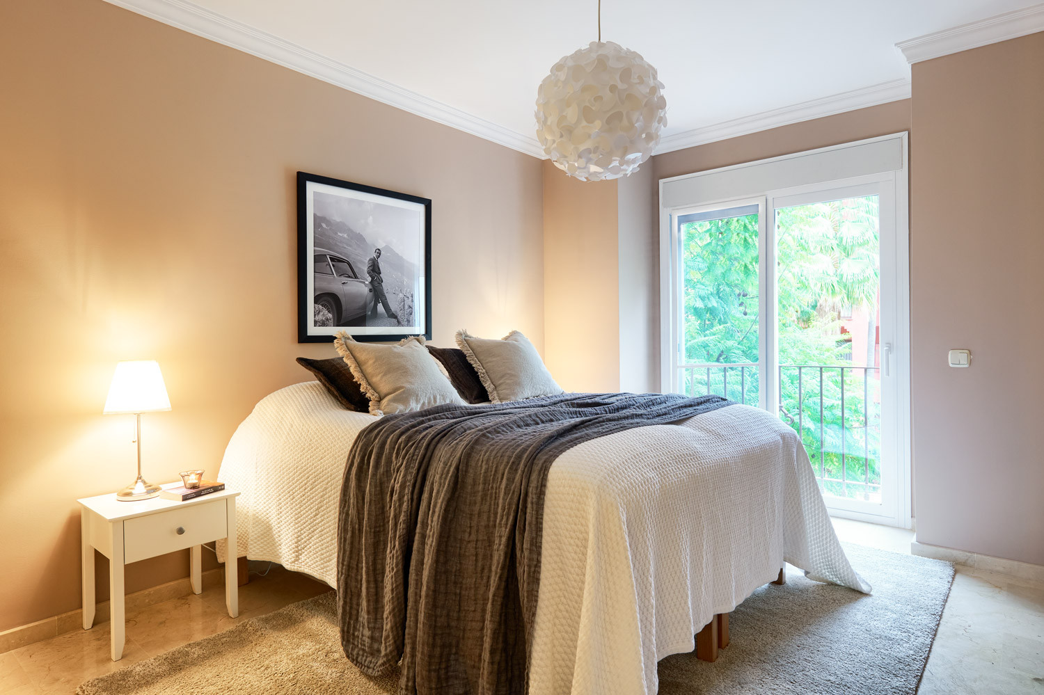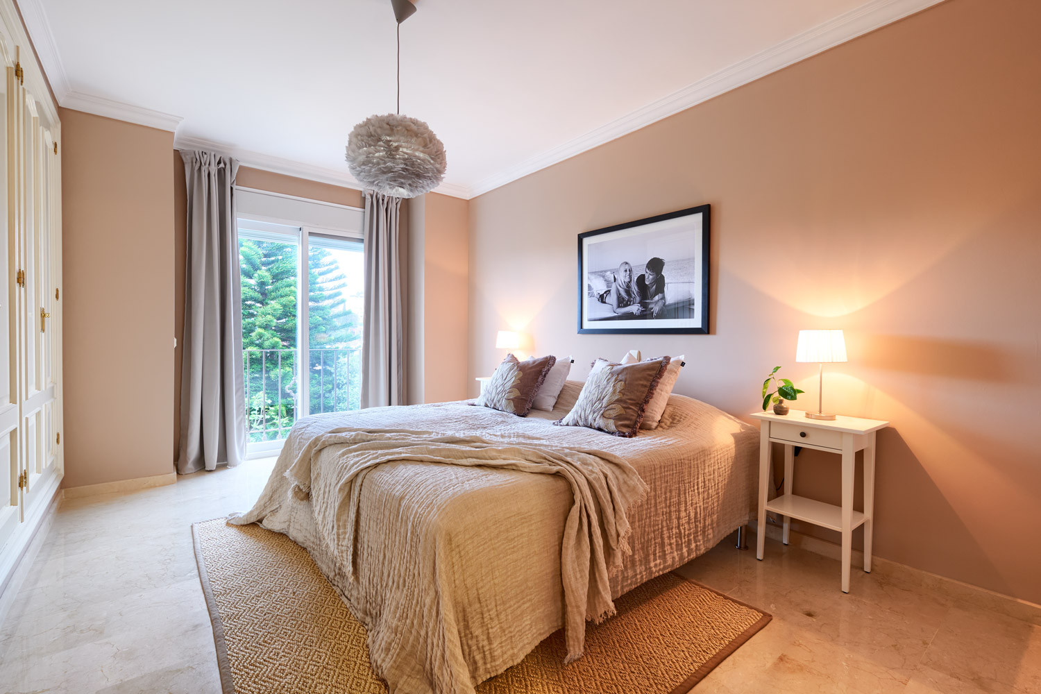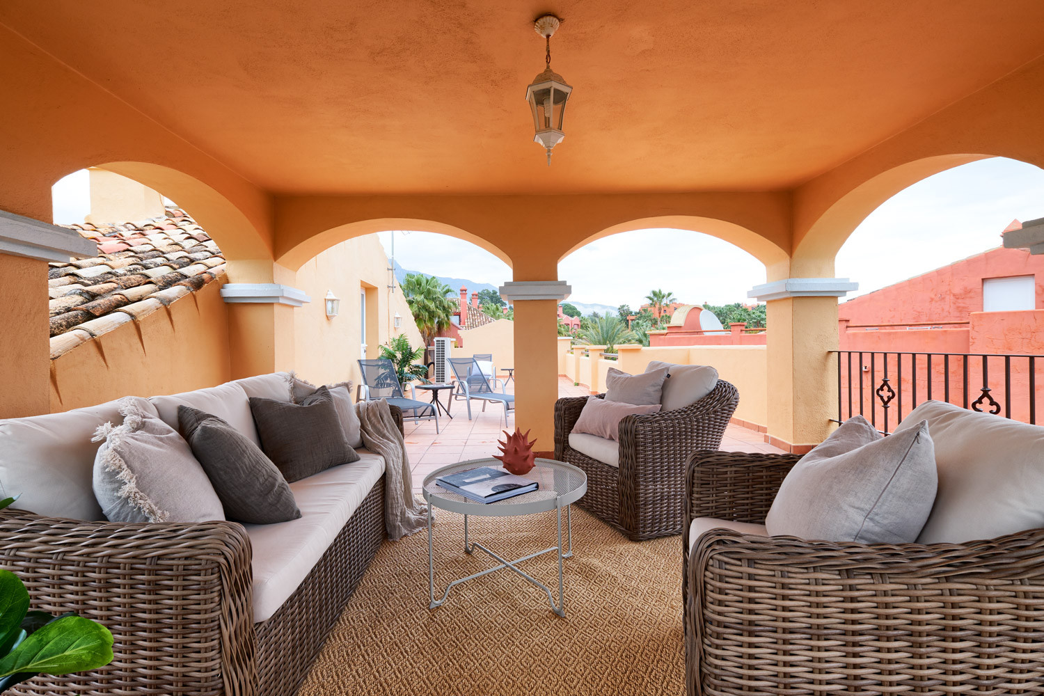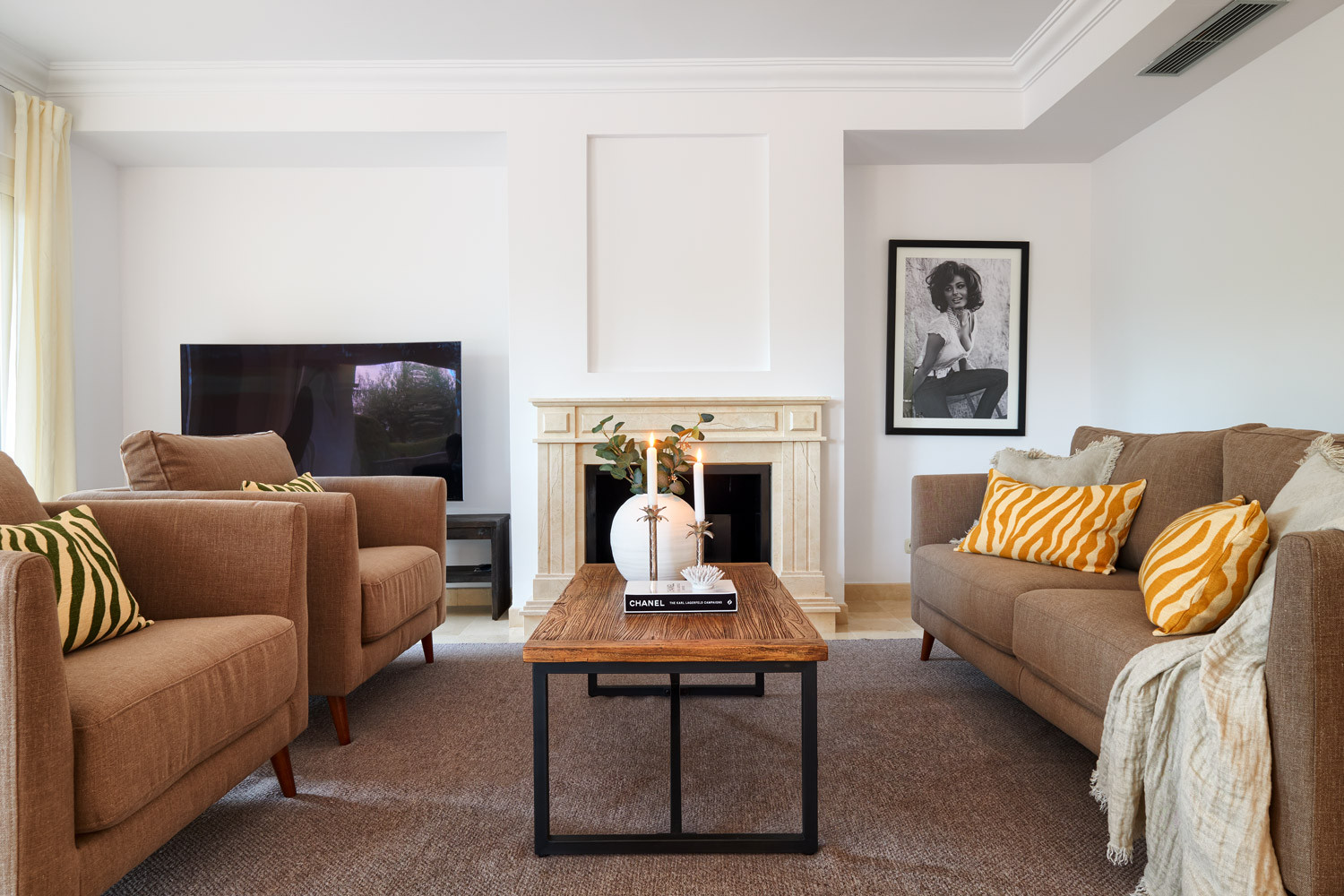 Esta casa adosada de estilo andaluz en la Urbanización Alzambra, Nueva Andalucía, ofrece una combinación perfecta de encanto mediterráneo e interiores modernos de inspiración escandinava. Los tonos neutros, las texturas suaves y la decoración elegante crean un ambiente cálido y acogedor en sus 4 espaciosas habitaciones y 3 baños. Cada habitación cuenta con armarios empotrados y ropa de cama lujosa, mientras que la suite principal incluye una terraza privada, perfecta para tomar un café por la mañana o relajarse por la noche. La sala de estar de planta abierta, bañada por la luz natural, se conecta sin esfuerzo con la cocina totalmente equipada y el comedor, complementados con una acogedora chimenea y cómodos asientos, lo que la hace ideal tanto para estancias cortas como largas.