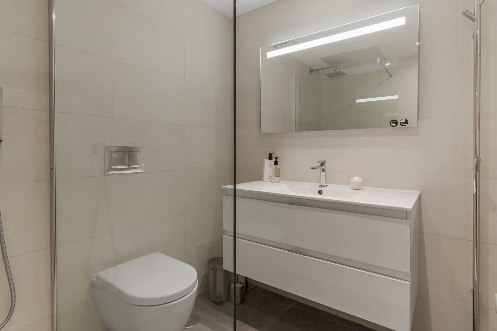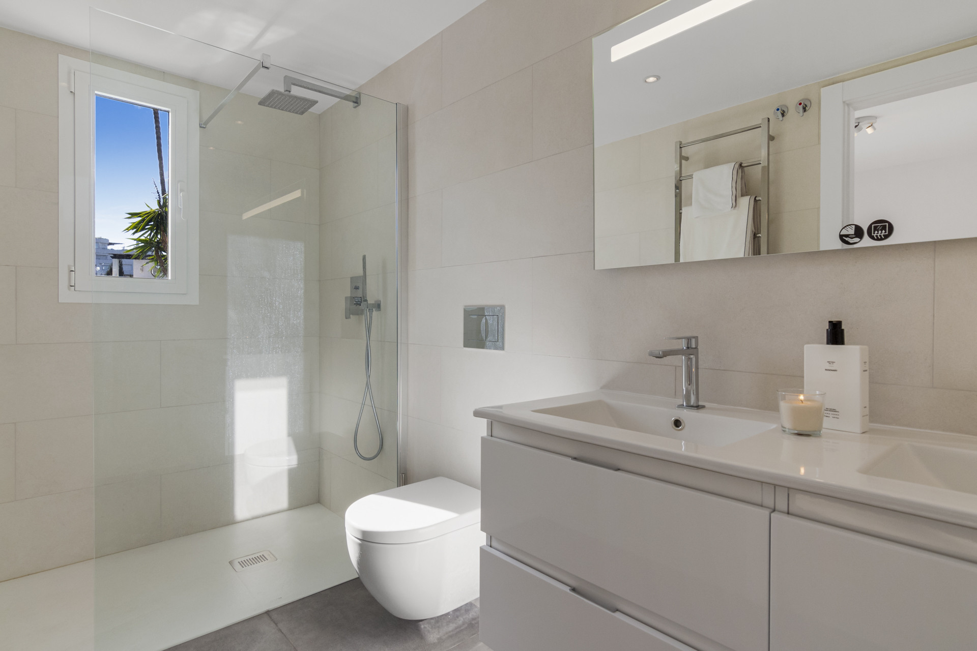 La planta superior alberga los tres dormitorios. El dormitorio principal incluye un baño en suite con ducha de lluvia, televisión y un balcón privado. El segundo dormitorio cuenta con una cama doble, y el tercer dormitorio también ofrece una cama doble. Estas dos habitaciones comparten un baño moderno con ducha a ras de suelo.