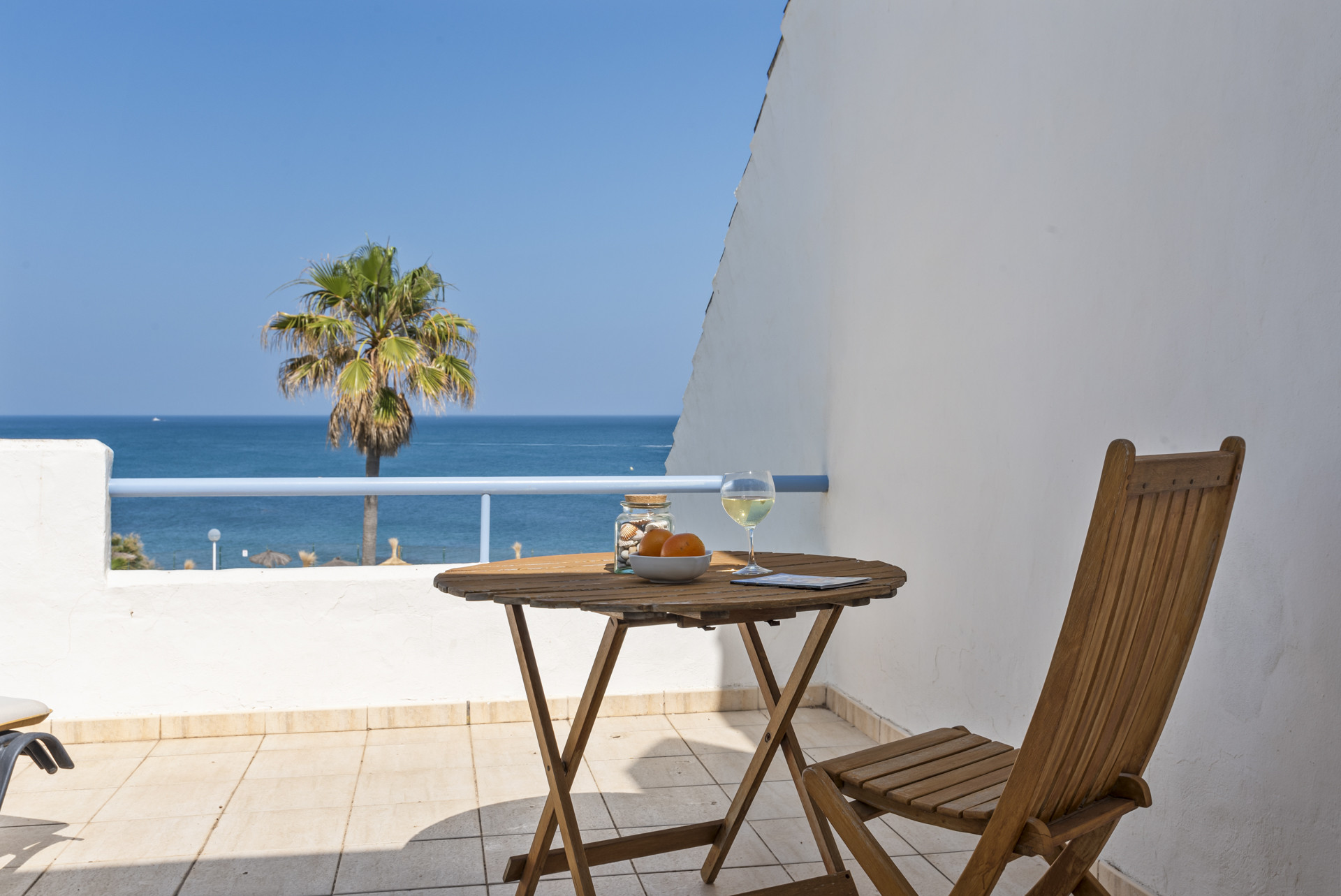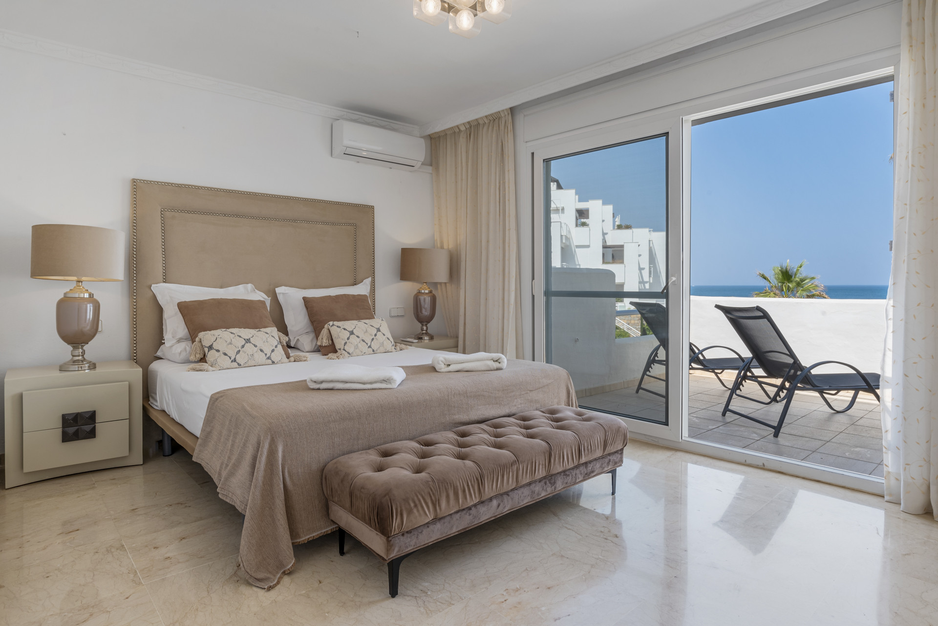 En el interior, la propiedad ha sido renovada con gusto con un diseño limpio y moderno. La cocina independiente está completamente equipada y terminada con un alto estándar, mientras que la luminosa zona de estar se abre directamente a una amplia terraza privada, perfecta para cenas al aire libre o simplemente para relajarse con vistas panorámicas al mar. Ambos baños cuentan con elegantes duchas de lluvia, combinando comodidad con un toque de lujo.
