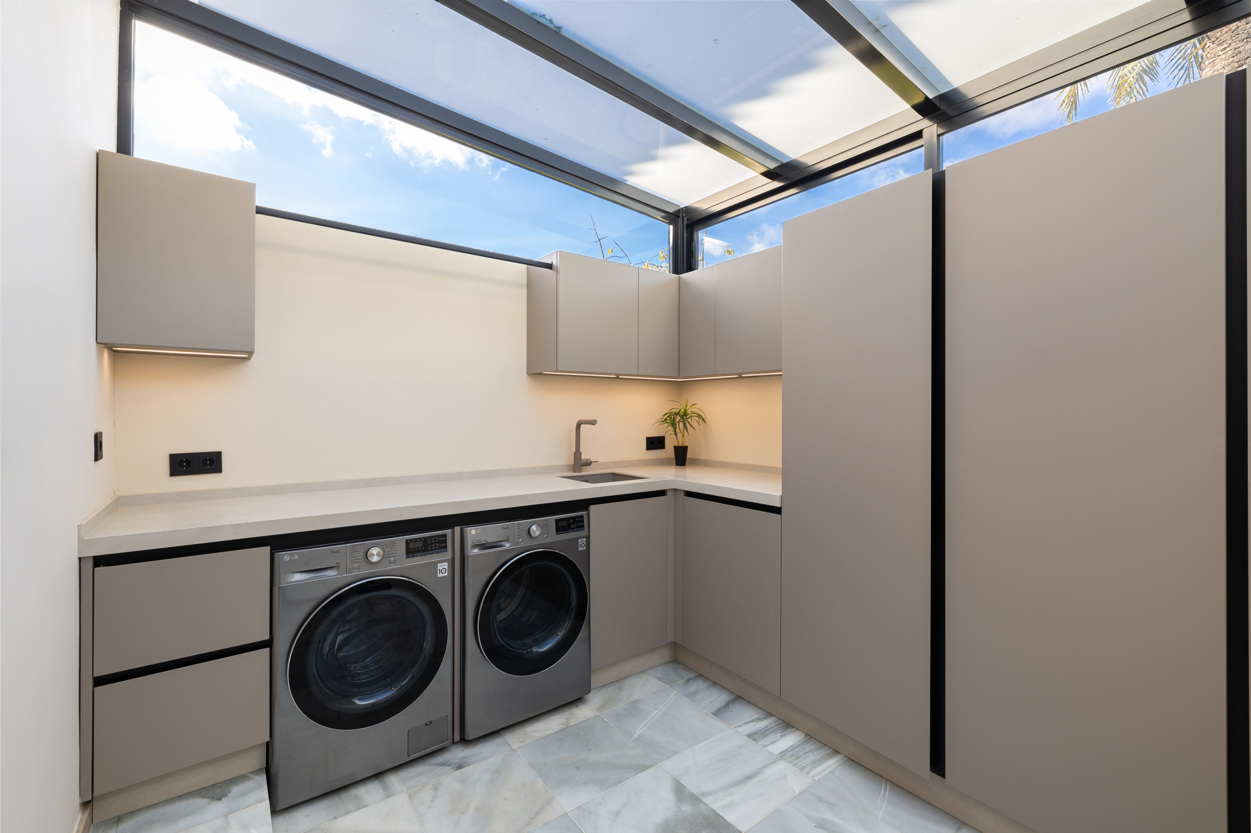 Diseñada con líneas arquitectónicas limpias y amplios cristales en todo su interior, la villa está bañada por luz natural y ofrece una experiencia de vida fluida entre el interior y el exterior. El área principal de estar es abierta e invitadora, que se extiende hacia una cocina moderna completamente equipada y un espacio de comedor, perfecto para relajarse o entretener con un lujo discreto.