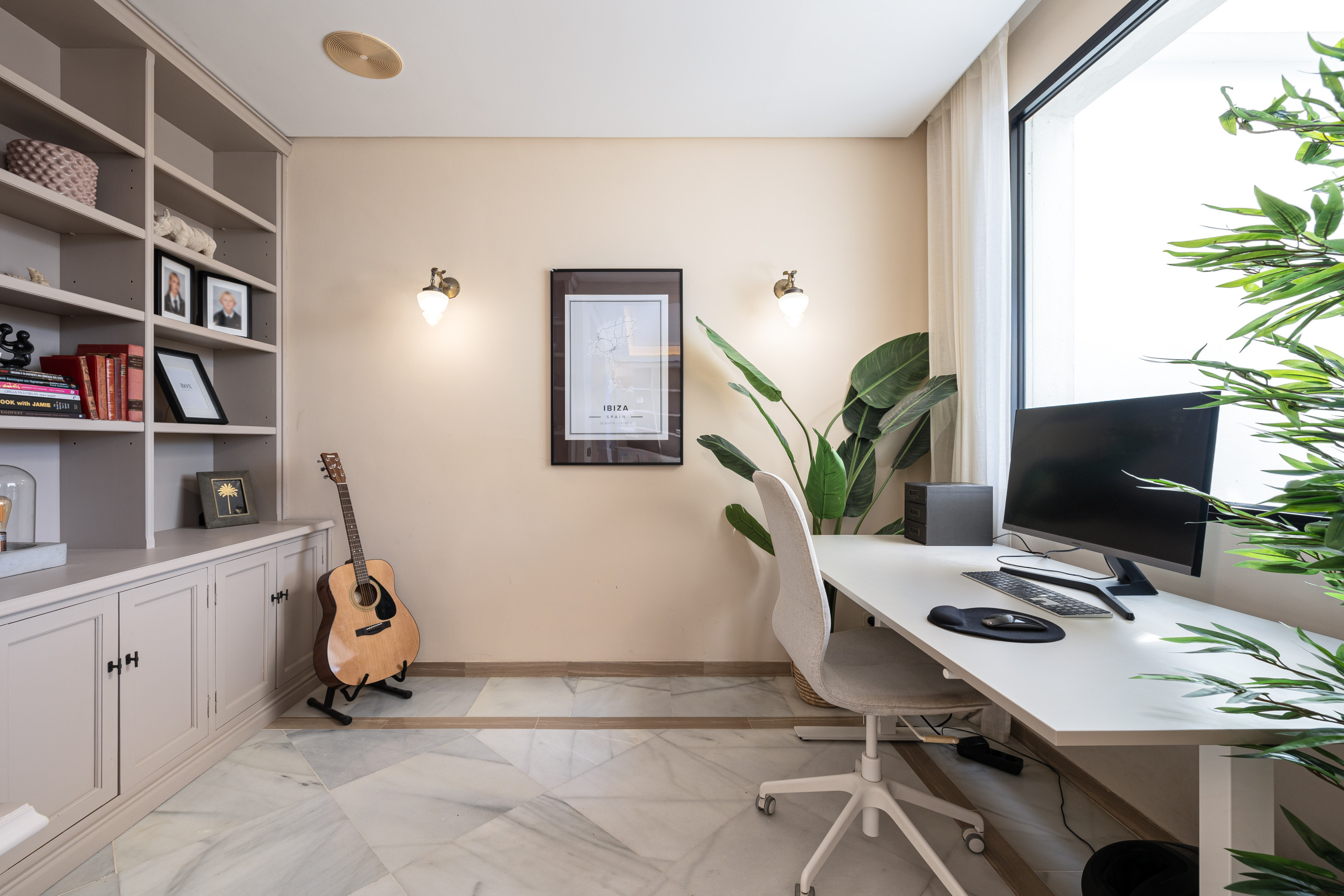 En el interior, la villa está diseñada cuidadosamente con una mezcla de decoración cálida e invitadora y acabados modernos y elegantes. El ala izquierda de la casa cuenta con dos dormitorios estilosos, cada uno equipado con camas de 180 cm y televisores inteligentes de pared, compartiendo un baño contemporáneo con combinación de bañera y ducha. Un espacio de trabajo dedicado con escritorio y silla con ruedas ofrece un ambiente tranquilo con vistas serenas al jardín, lo que lo hace ideal para trabajo remoto o reflexión silenciosa. La planta superior, conocida como la Planta Familiar, alberga dos dormitorios adicionales. Uno cuenta con una cama de 180 cm y un área de trabajo, mientras que la suite principal es un lujoso retiro, completo con vestidor, terraza privada con impresionantes vistas y un elegante baño en suite con bañera tipo jacuzzi y ducha de pie. El dormitorio principal está amueblado con una cama de 180 cm junto con una cama adicional de 140 cm, garantizando opciones flexibles de alojamiento.