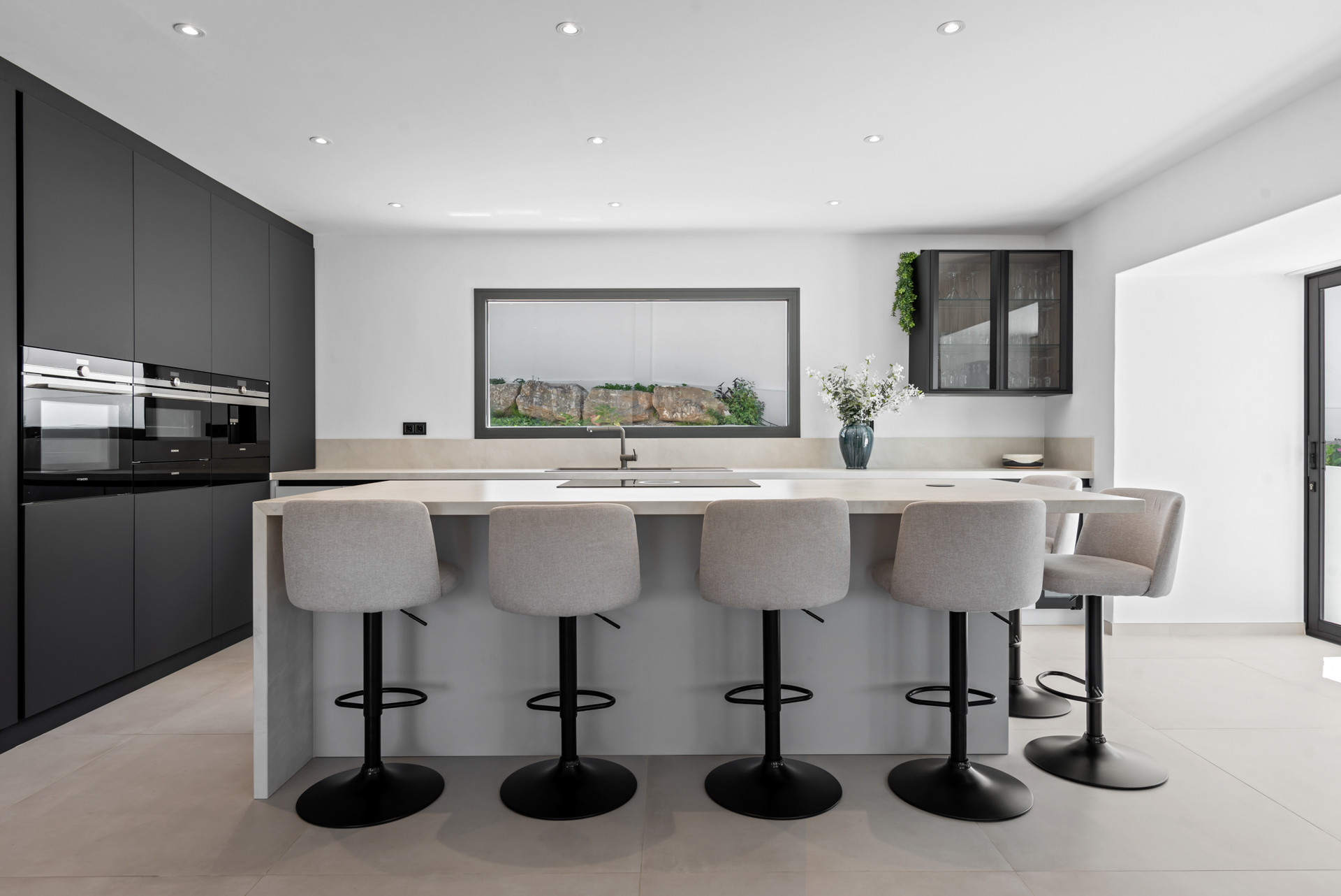 Un amplio espacio diáfano que integra la zona de estar, comedor y cocina, junto con ventanales de tamaño completo que se abren hacia la terraza, donde encontrarás una hermosa piscina y un área exterior perfecta para la relajación. La integración perfecta de los espacios interiores y exteriores crea un flujo armonioso, ideal para disfrutar del cálido clima mediterráneo.
