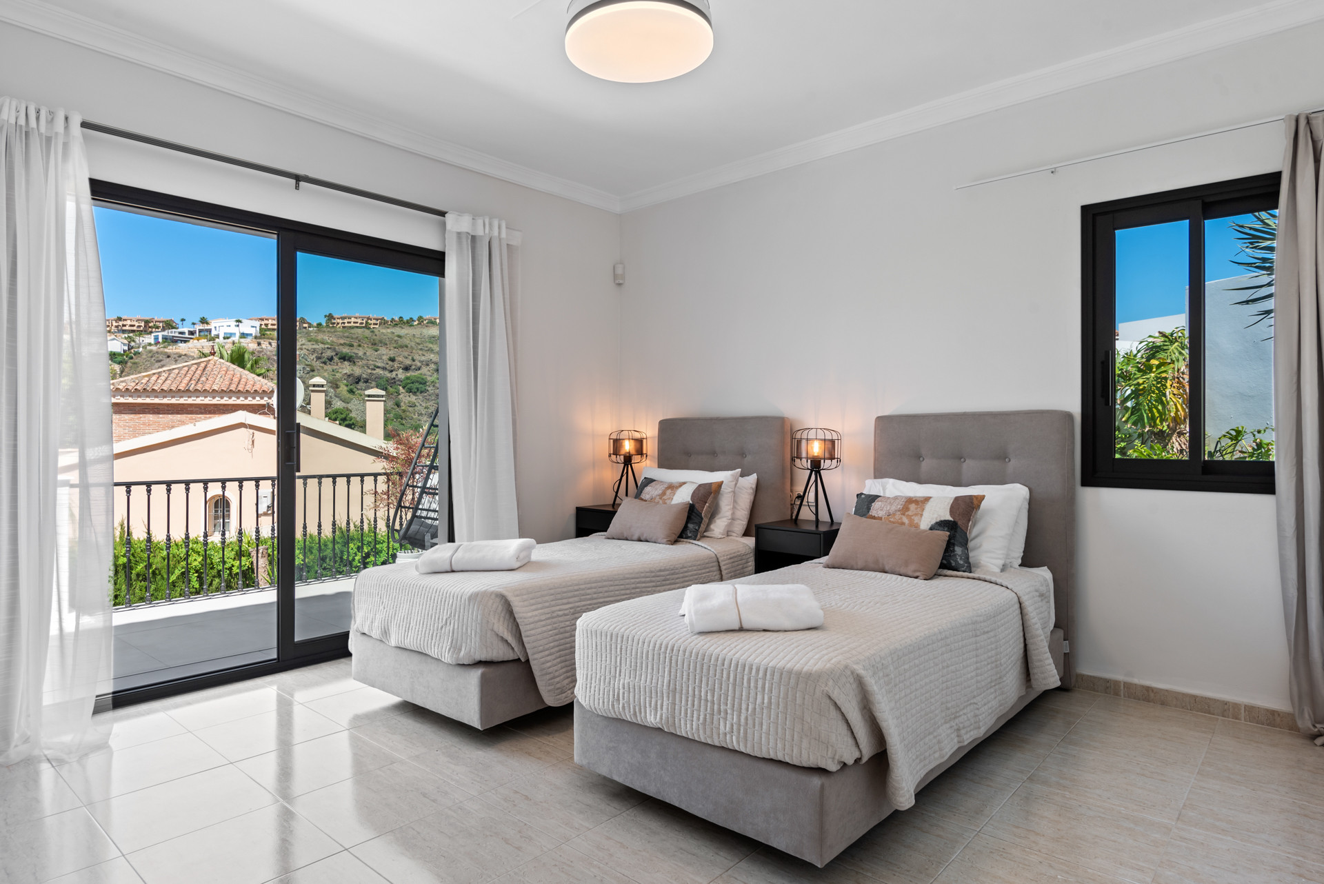 Villa La Alquería cuenta con cuatro dormitorios bellamente equipados. El primero, ubicado en el nivel principal, incluye una cama de matrimonio, un baño en suite y acceso directo a la terraza de la piscina. En la planta superior, los dormitorios segundo y tercero —uno doble (160cm) y otro con dos camas— ofrecen vistas al campo de golf y comparten un amplio baño con bañera y doble lavabo. La impresionante suite principal presume una cama king size, un gran baño en suite con bañera y ducha separada, un televisor y una terraza privada con vistas panorámicas.
