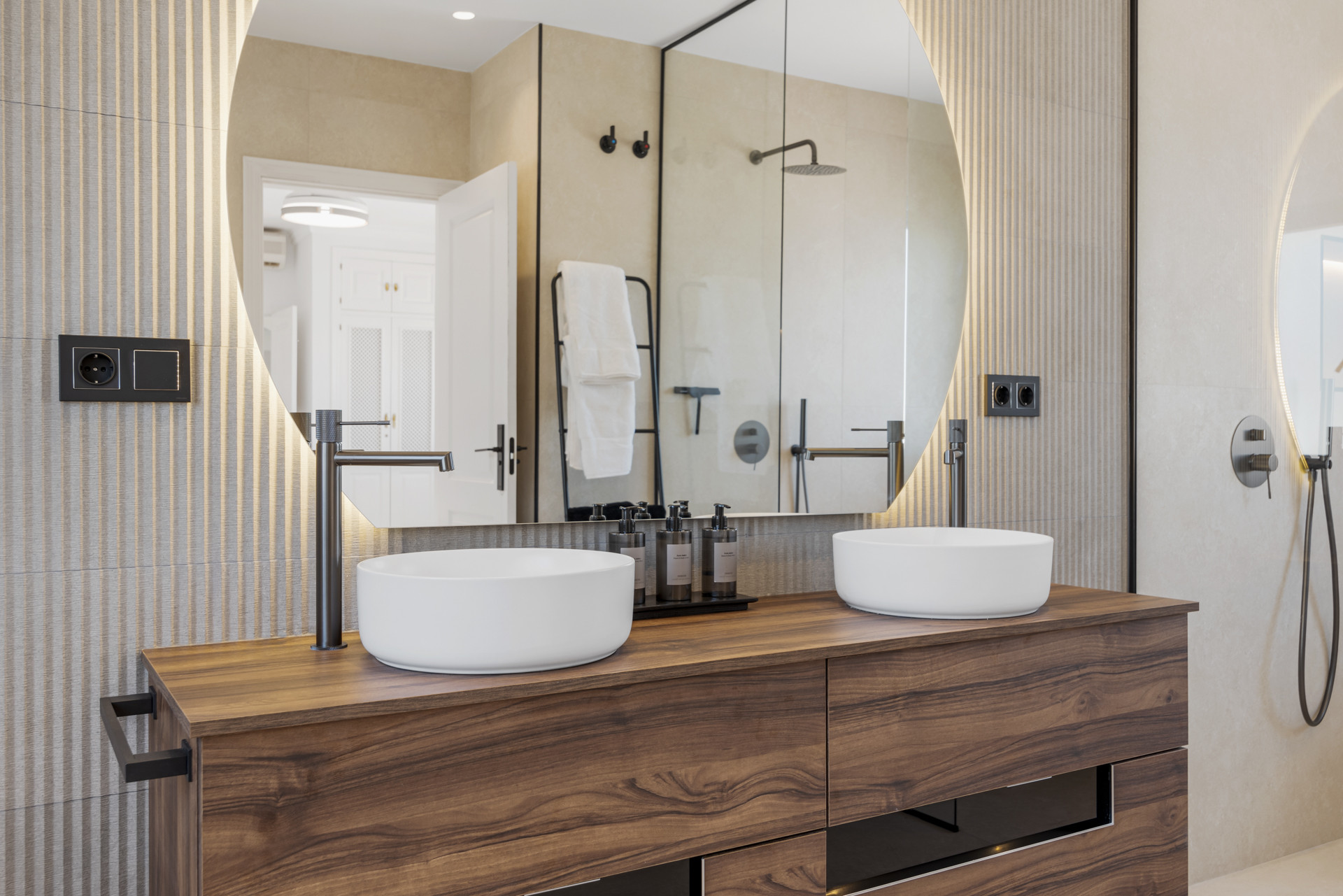La terraza está equipada con muebles lujosos, incluyendo una zona de chill-out, un área de comedor con una mesa de madera, tumbonas para tomar el sol, y una barbacoa y zona de comedor al aire libre para comer al fresco.