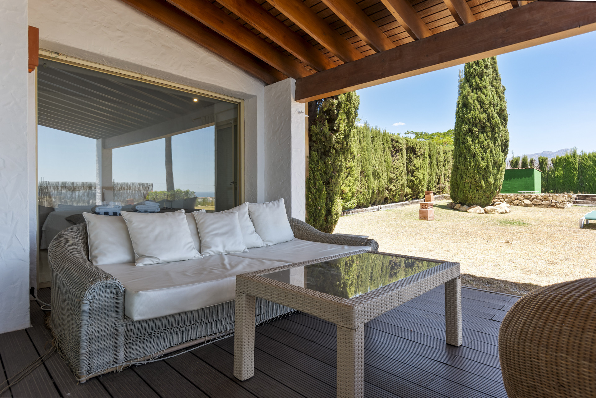 Villa Aguacate es una impresionante villa de 4 dormitorios (5 camas) que se extiende por 350 m², ubicada en el tranquilo enclave residencial de El Paraiso, Marbella. Ofreciendo la perfecta fusión del encanto andaluz y el diseño contemporáneo, esta casa es ideal para quienes buscan comodidad, tranquilidad y comodidades modernas. Recientemente renovada, la villa cuenta con un luminoso y espacioso salón que se extiende sin problemas a una pintoresca terraza con vistas al exuberante jardín y a la piscina de agua salada. Un espacio cubierto para comedor al aire libre crea el escenario perfecto para comidas al fresco, mientras que la cocina moderna, totalmente equipada y de nueva construcción, presume de electrodomésticos de primera línea, incluyendo un refrigerador doble, garantizando un almacenamiento amplio y conveniente para los huéspedes.