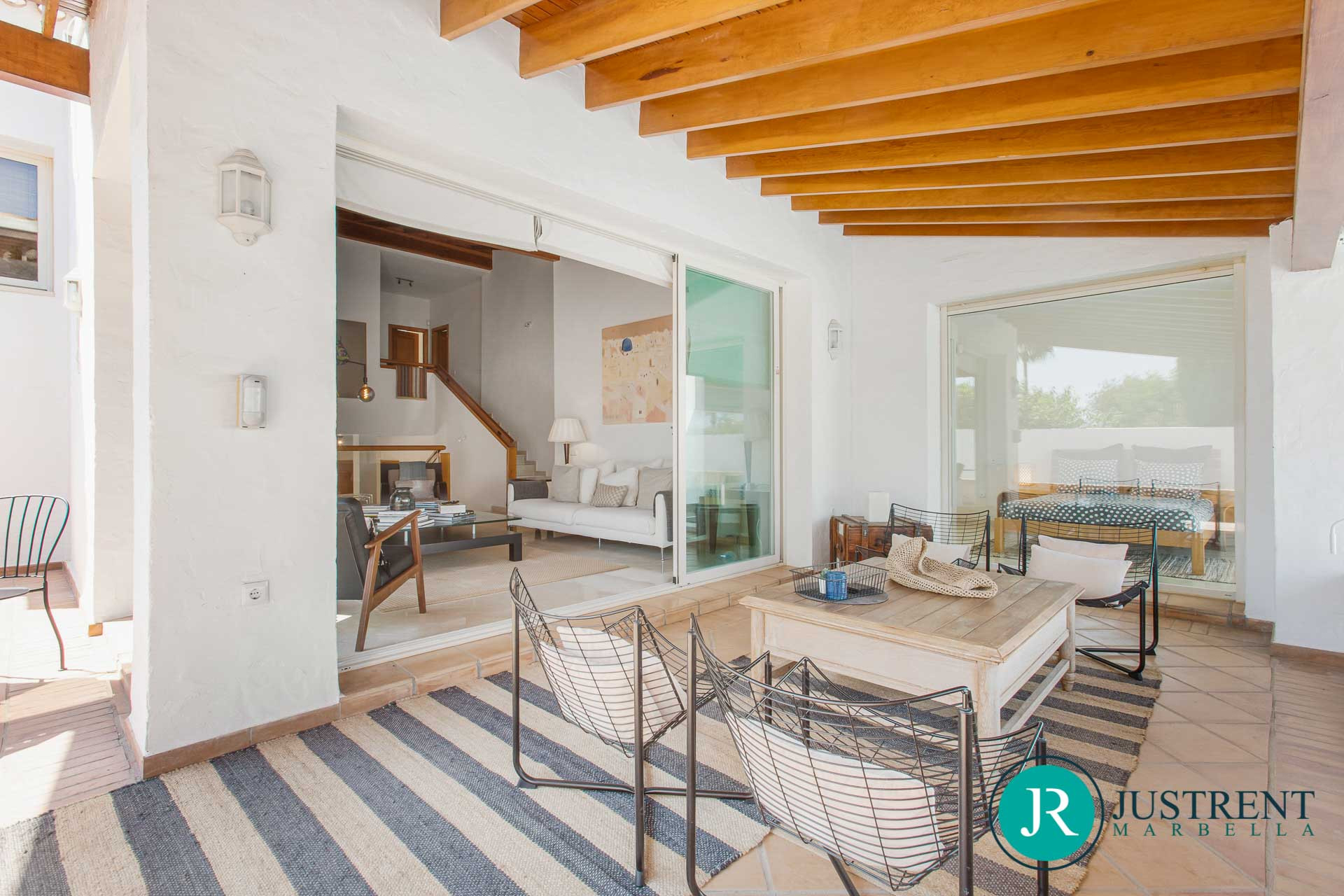 La terraza está equipada con muebles lujosos, incluyendo una zona de chill-out, un área de comedor con una mesa de madera, tumbonas para tomar el sol, y una barbacoa y zona de comedor al aire libre para comer al fresco.