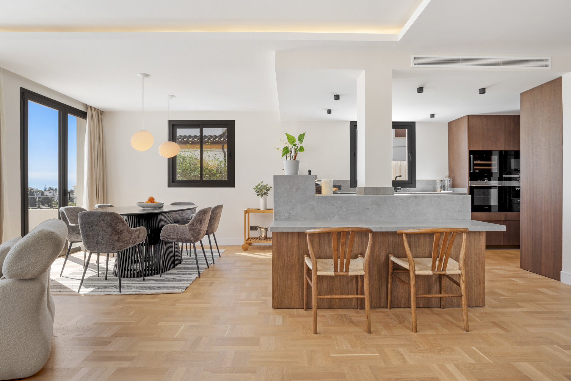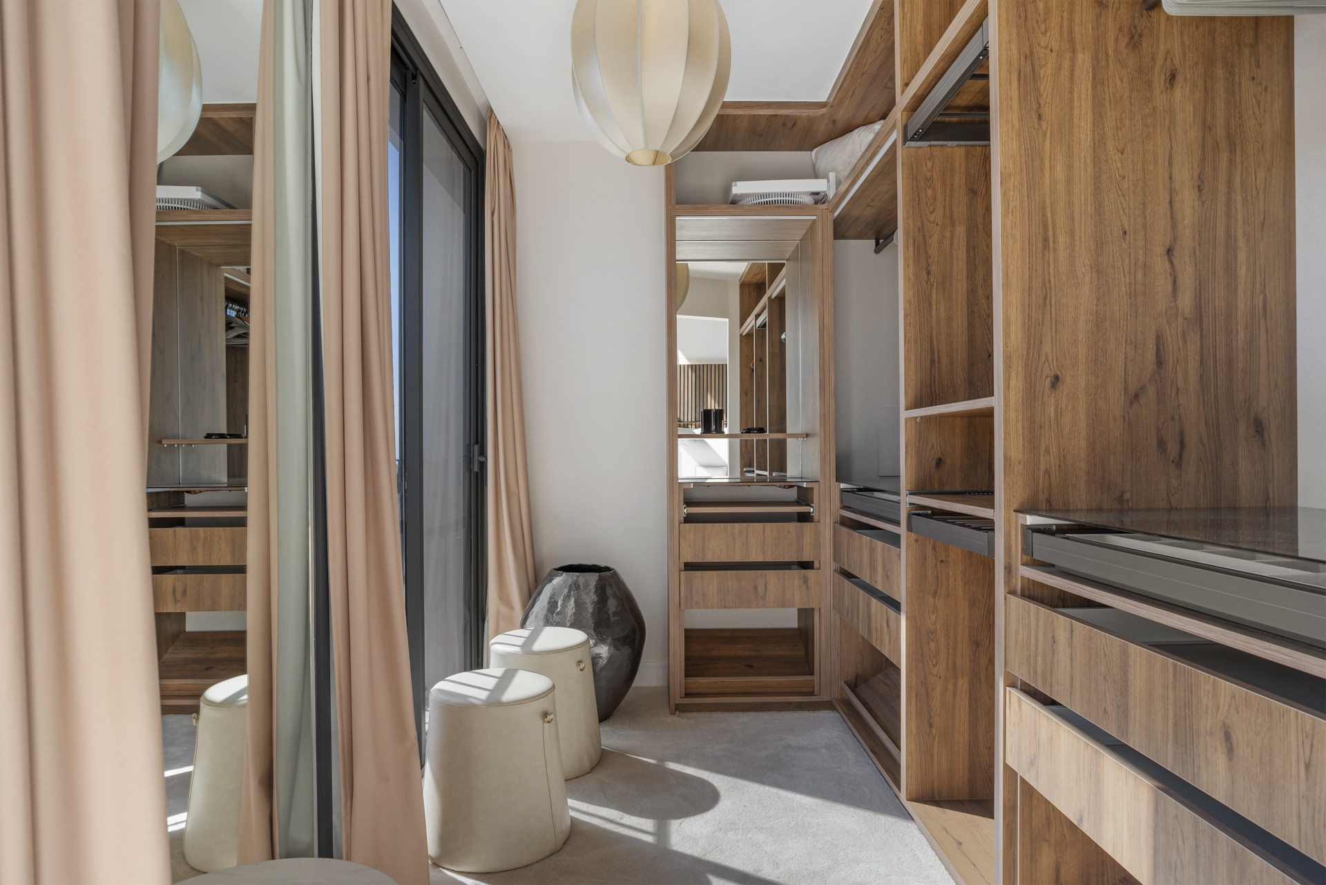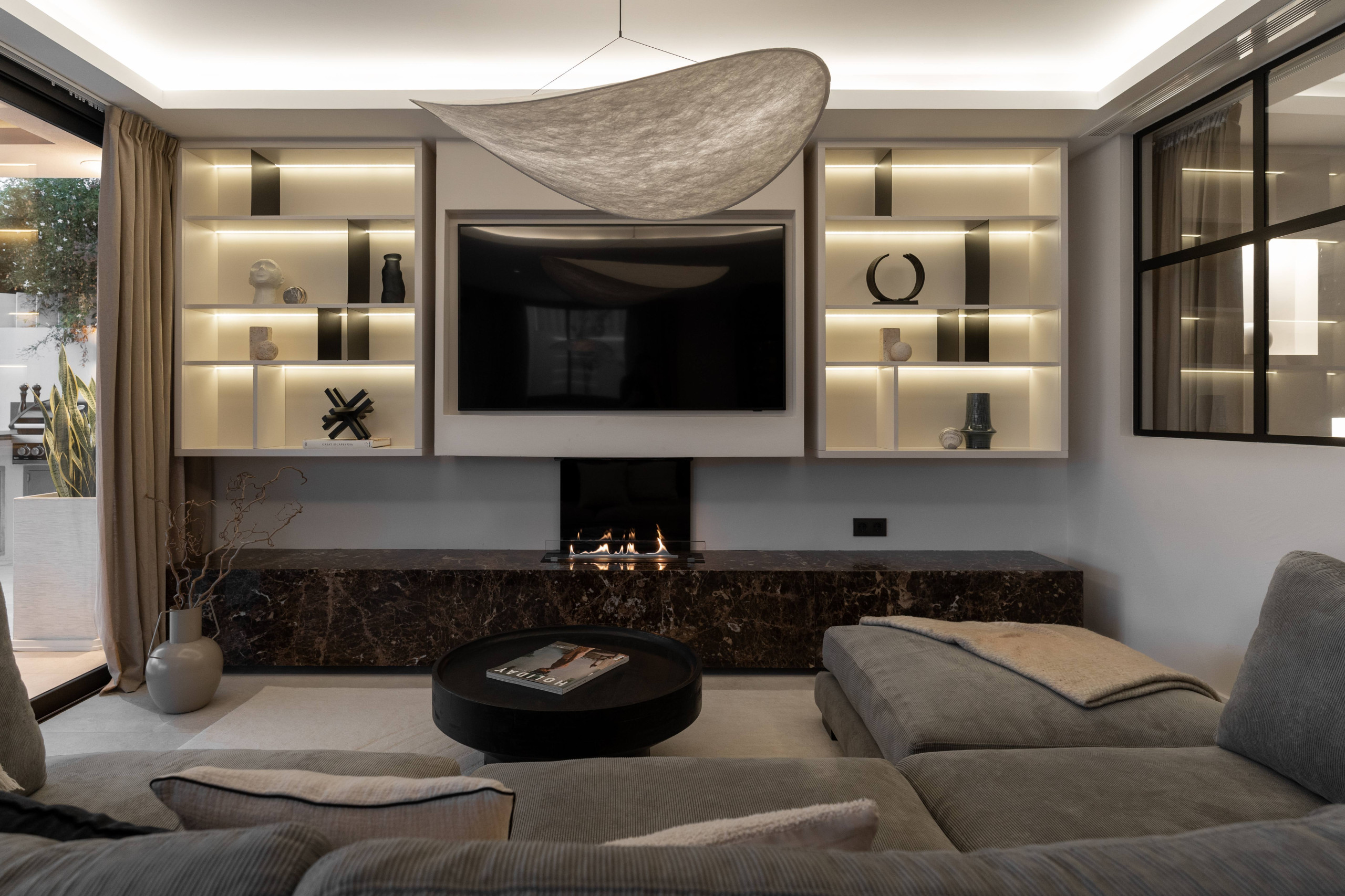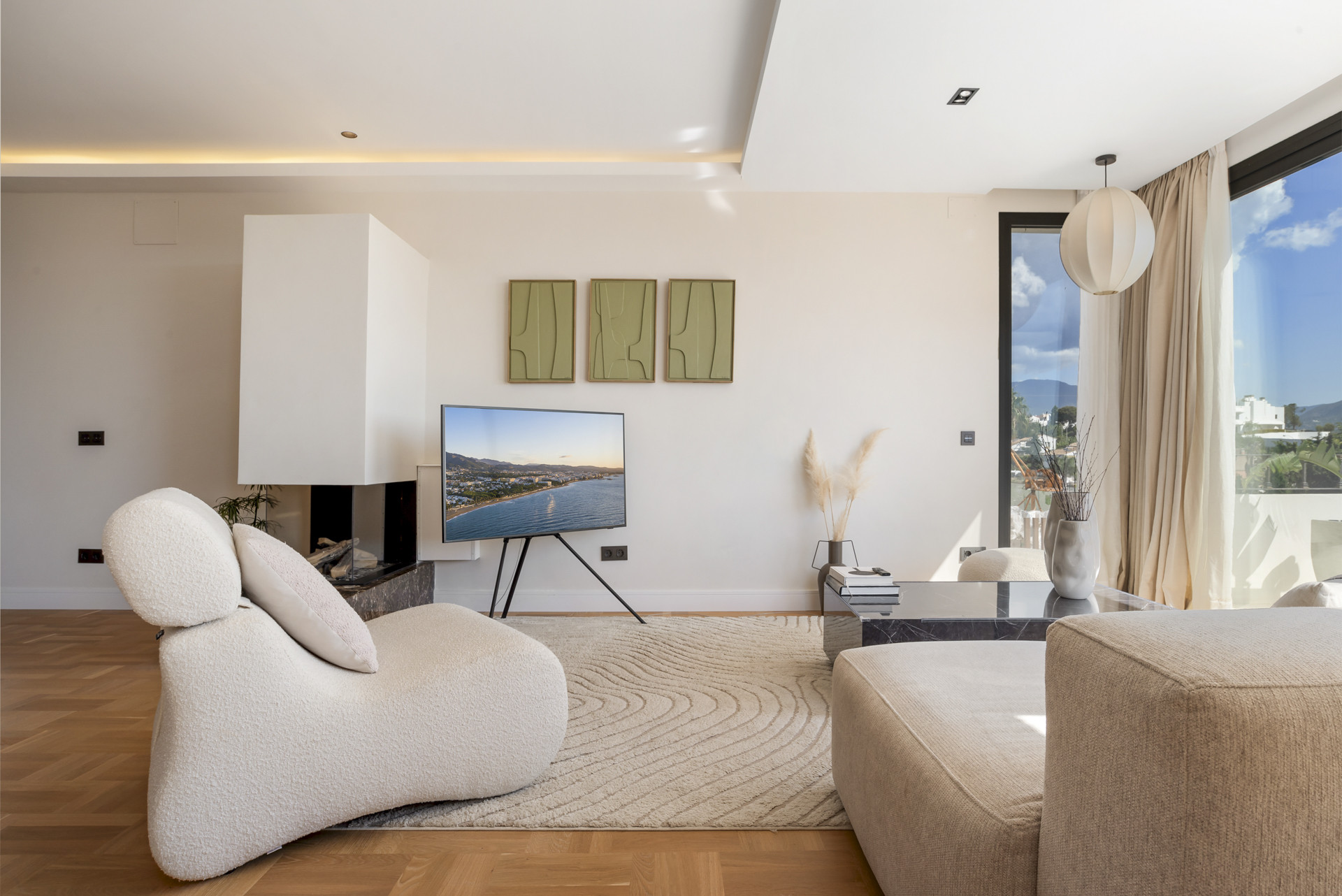 Distribuida en varios niveles, la casa cuenta con un diseño diáfano y luminoso con ventanales de suelo a techo, muebles modernos y un diseño elegante en todo su interior. Cada dormitorio está bellamente amueblado, con baños en suite y una decoración cuidadosamente seleccionada que equilibra la relajación con el estilo. La zona principal de estar se abre directamente al jardín y a la terraza de la piscina, mientras que una sala de TV separada y un espacio de trabajo tranquilo ofrecen flexibilidad para trabajar o desconectar.