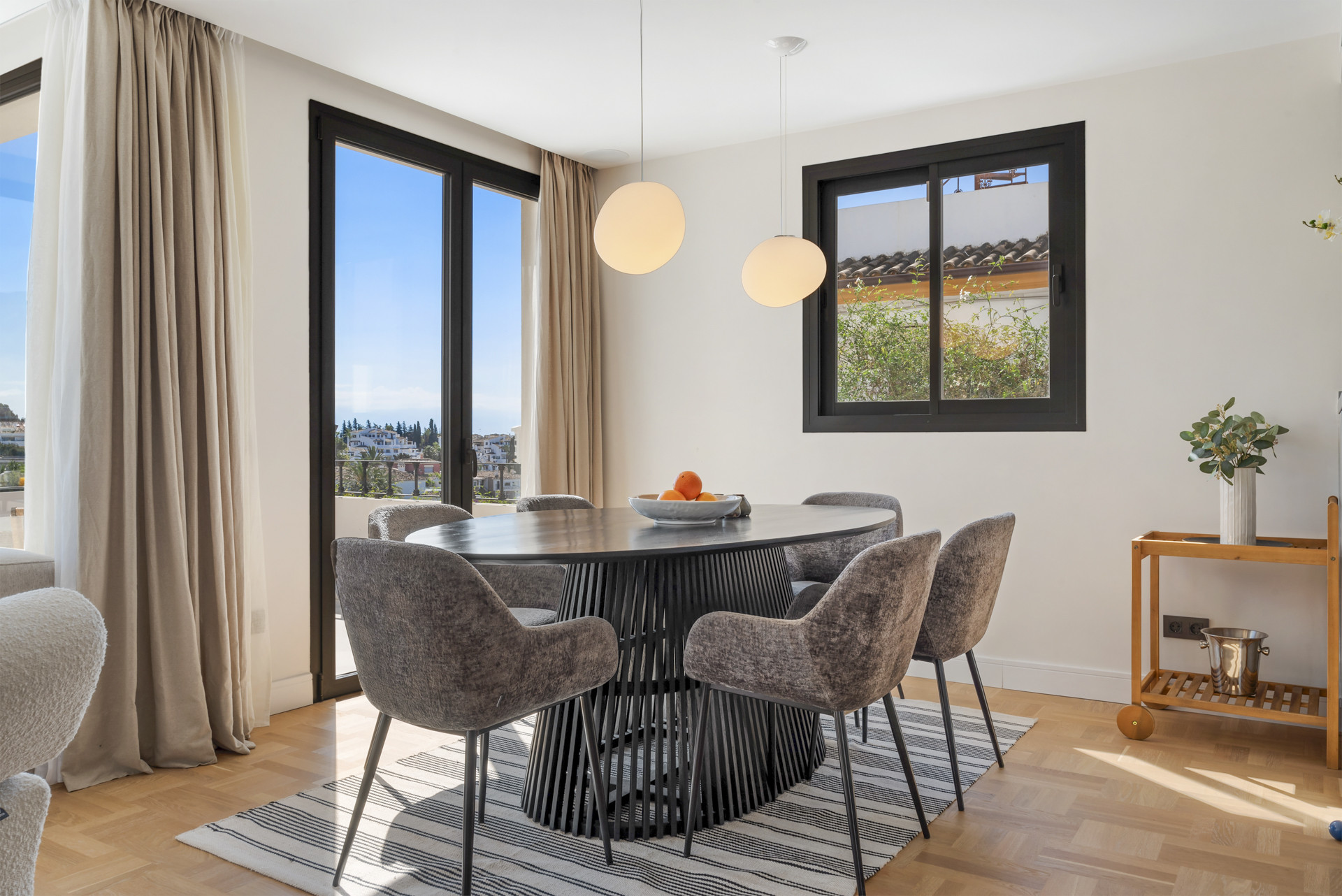Fuera, los invitados pueden relajarse junto a la piscina privada, tomar el sol en la terraza o disfrutar de largas veladas con vistas al campo de golf. El jardín ofrece un espacio para descansar con privacidad, mientras que las vistas abiertas ofrecen una auténtica experiencia de la Costa del Sol.