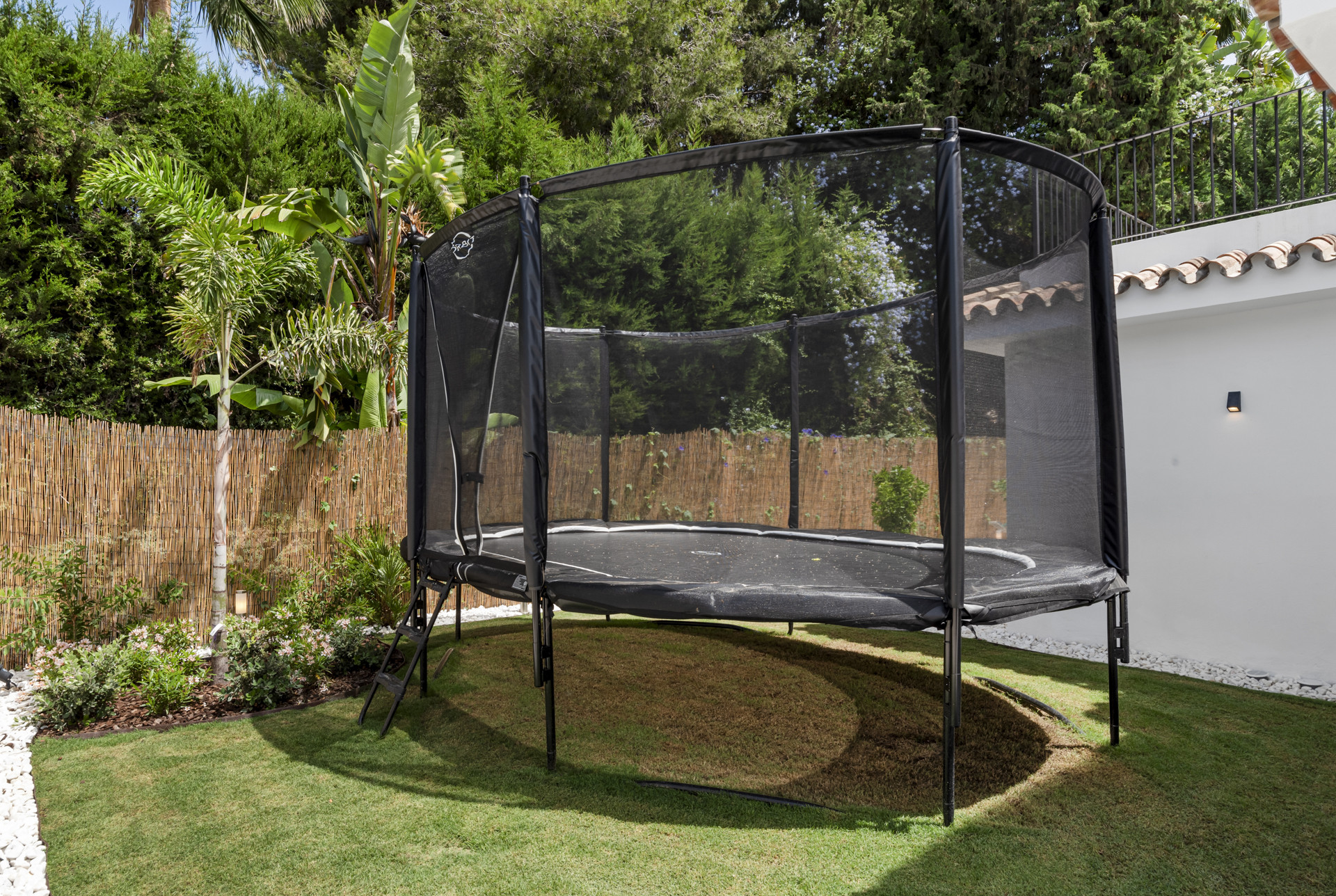 El jardín bellamente paisajado de la villa incluye un gran trampolín y una portería de fútbol, ofreciendo mucha diversión para los niños, mientras que un cobertizo cubierto proporciona un estacionamiento seguro para dos coches. Ya sea que esté albergando a la familia, entreteniendo a invitados o simplemente buscando un espacio refinado para relajarse, esta casa atiende a cada estilo de vida con elegancia y funcionalidad.