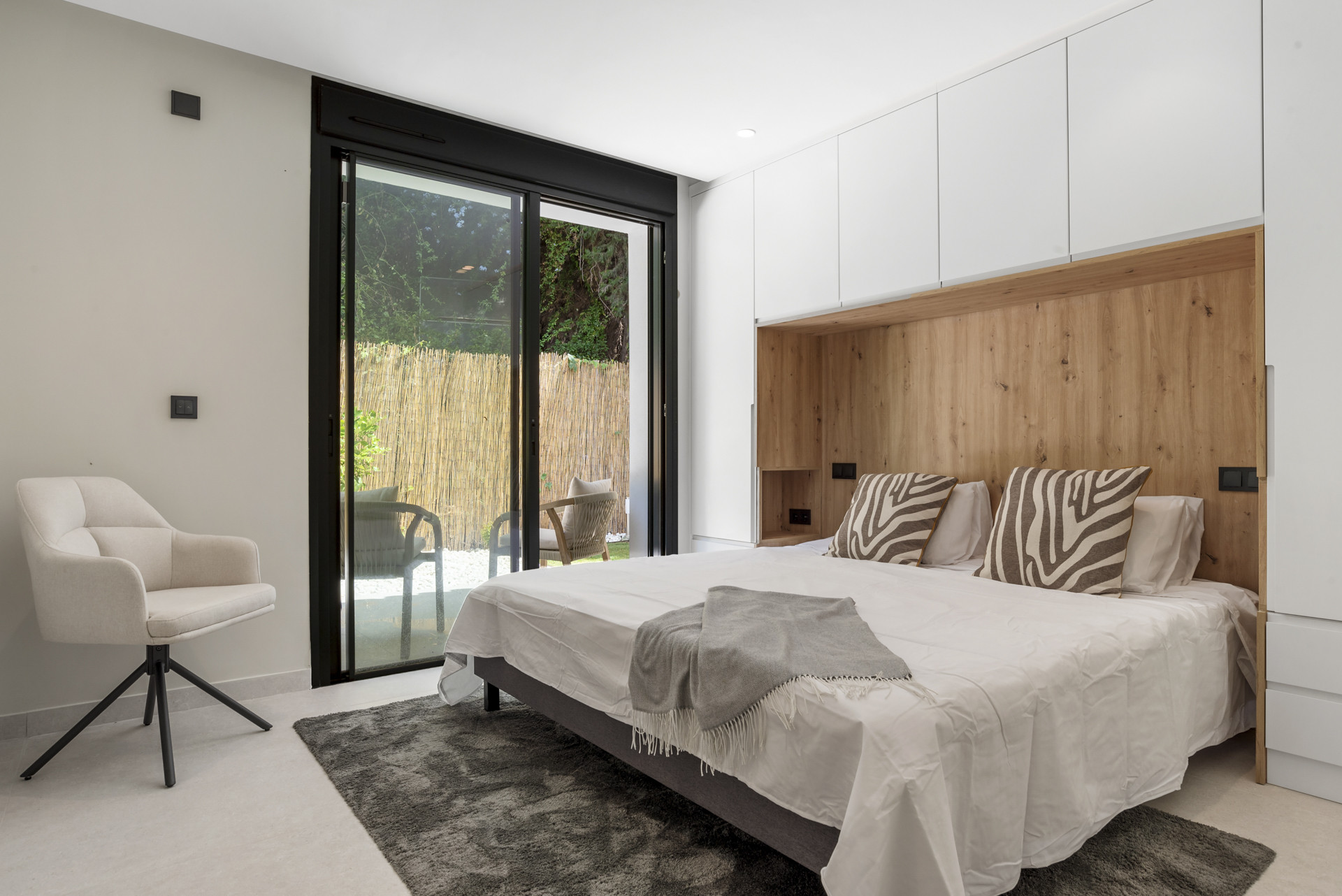 La villa cuenta con un gimnasio completamente equipado y una zona de spa privada con una sauna de estilo acristalado y duchas de lluvia dobles de lujo, creando su propio retiro de bienestar en casa. Para aquellos que trabajan de forma remota o necesitan un rincón tranquilo, una estación de trabajo en la planta superior conduce a una terraza tranquila con una pequeña cocina — perfecta para tomar una bebida fría mientras se disfruta de las vistas del exuberante jardín. La sexta habitación ofrece un uso flexible: está equipada con un sofá-cama de alta calidad que incluye un colchón completo y adecuado, haciéndolo tan cómodo como una cama estándar. Con un televisor inteligente y un diseño divertido, es ideal como sala de televisión infantil o como acogedora habitación de invitados.